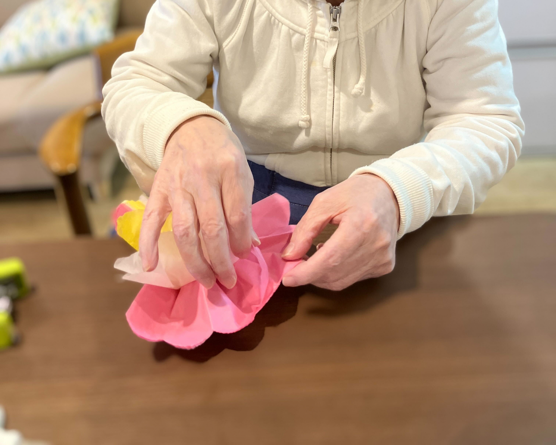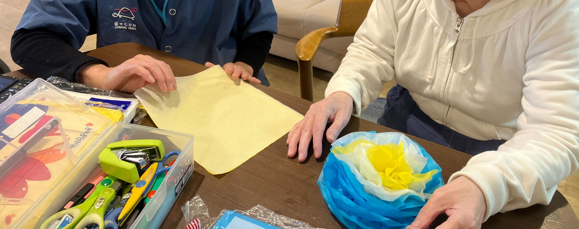 職員が作成した見本を見て、同じようにペーパーフラワーを作って頂いています。