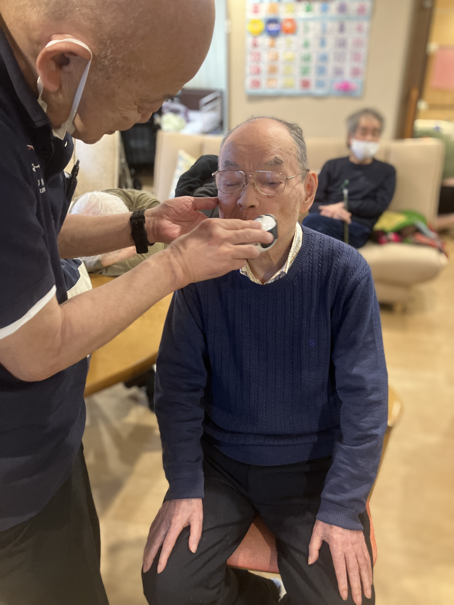 お帰り前に職員による髭剃りを受けられるF様(#^^#)