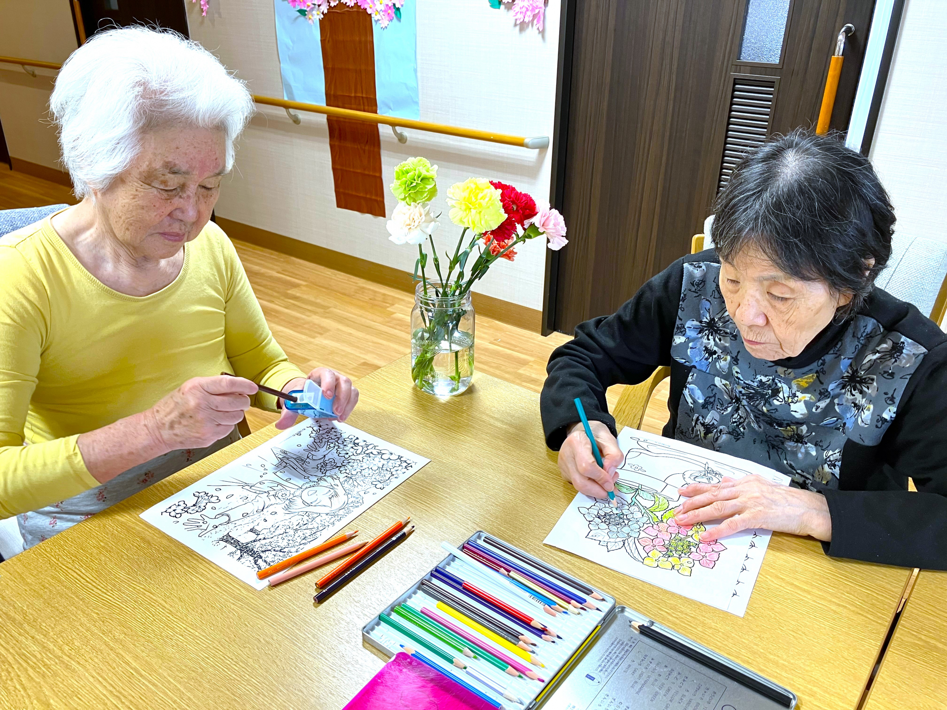 2024.05.15 活動報告(IN) 3階 日中のご様子 Tweet シェアする お二人様大好きな塗り絵をしています。 洗濯物を干しながらしゃべっています。 it's coffee time. 前の記事 2024.05.18 活動報告(IN) 3階のレクリエーション活動 次の記事 2024.05.14 活動報告(IN) 3階 午後体操 一覧へ戻る