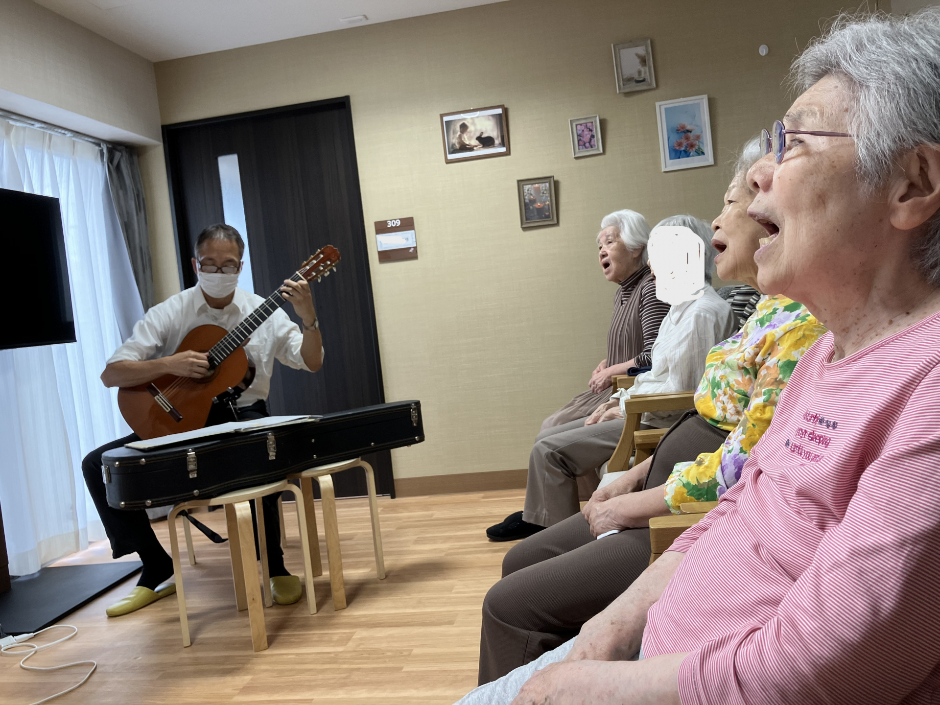 9日に音楽活動がありました。昔に流行した歌を披露してくださいました。3階の皆様のご様子を報告します。