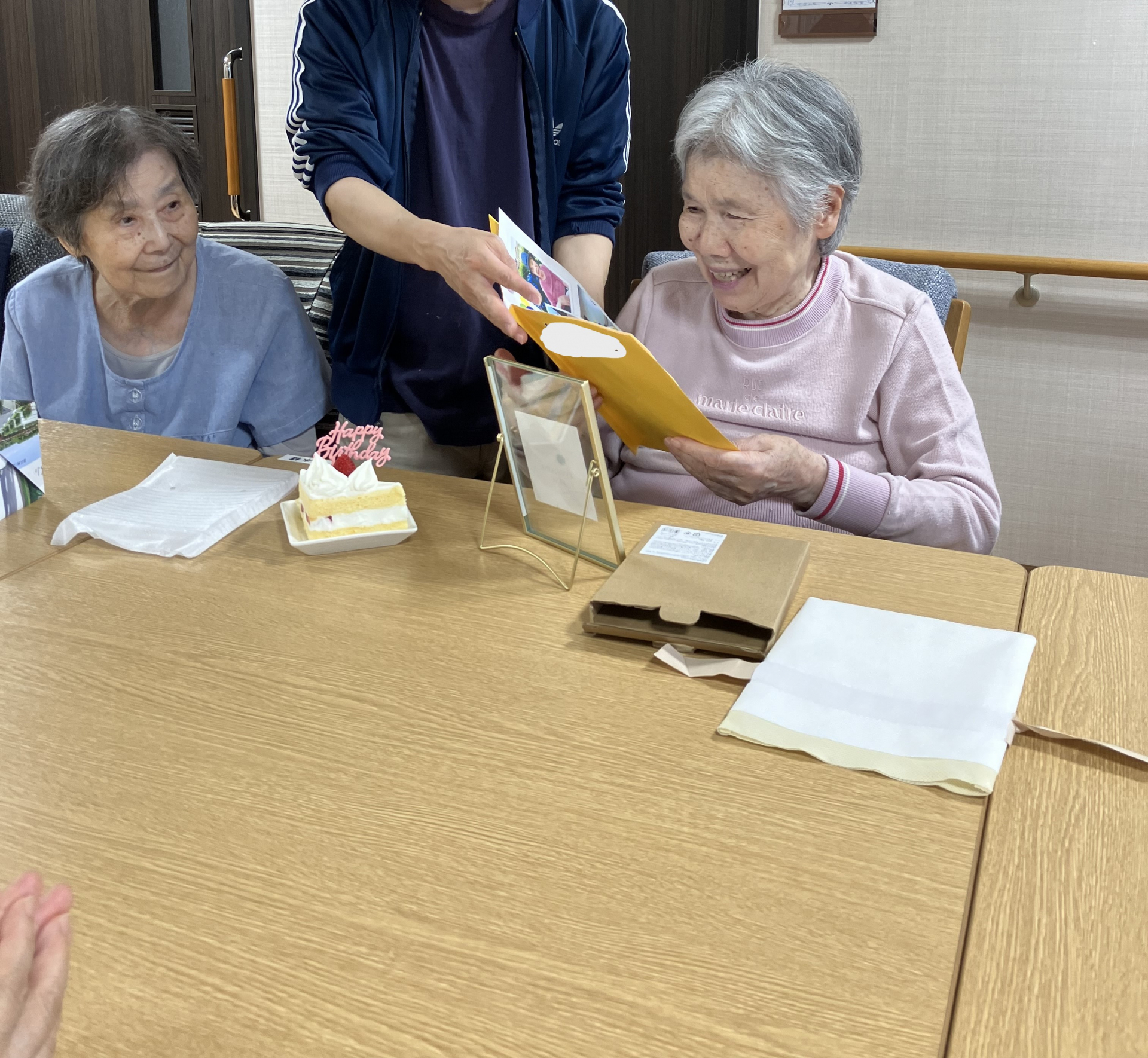 お祝いにケーキとプレゼントを用意しました。他入居者の方からもお祝いの言葉をいただき、自らもお礼のお言葉をいただきました。いつまでもお元気で。来年もお祝いをしましょう。改めて、誕生日おめでとうございます。