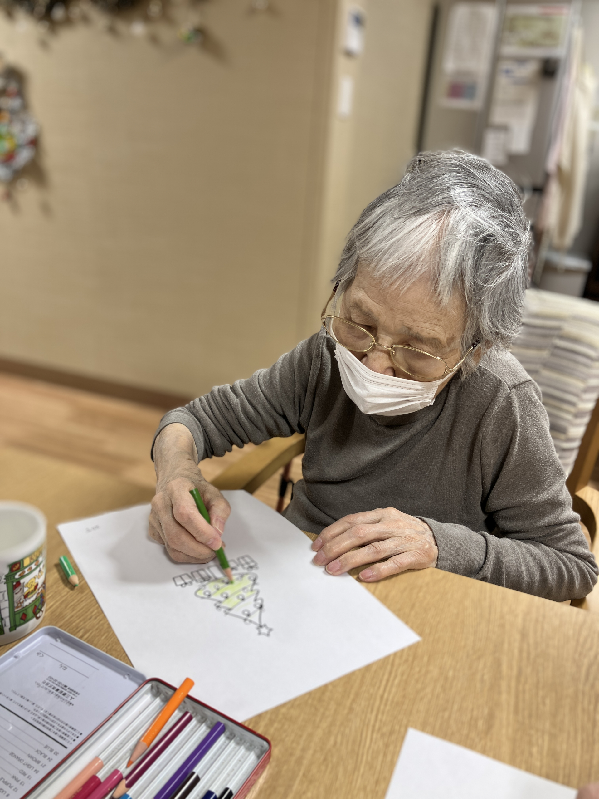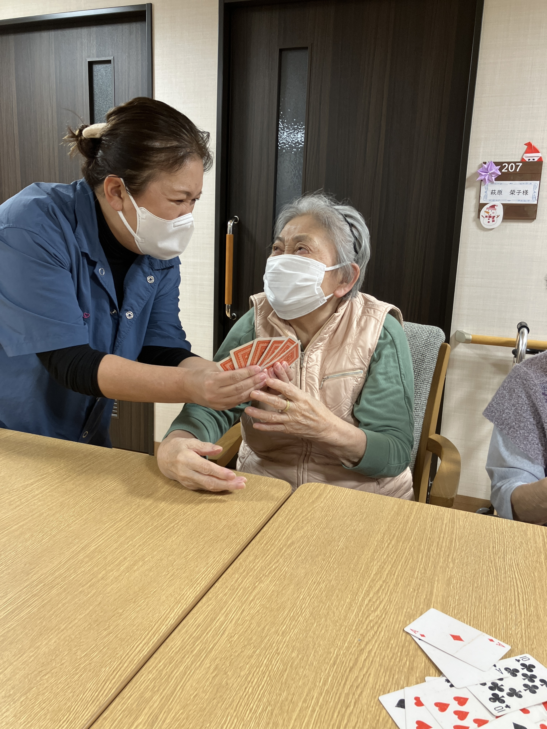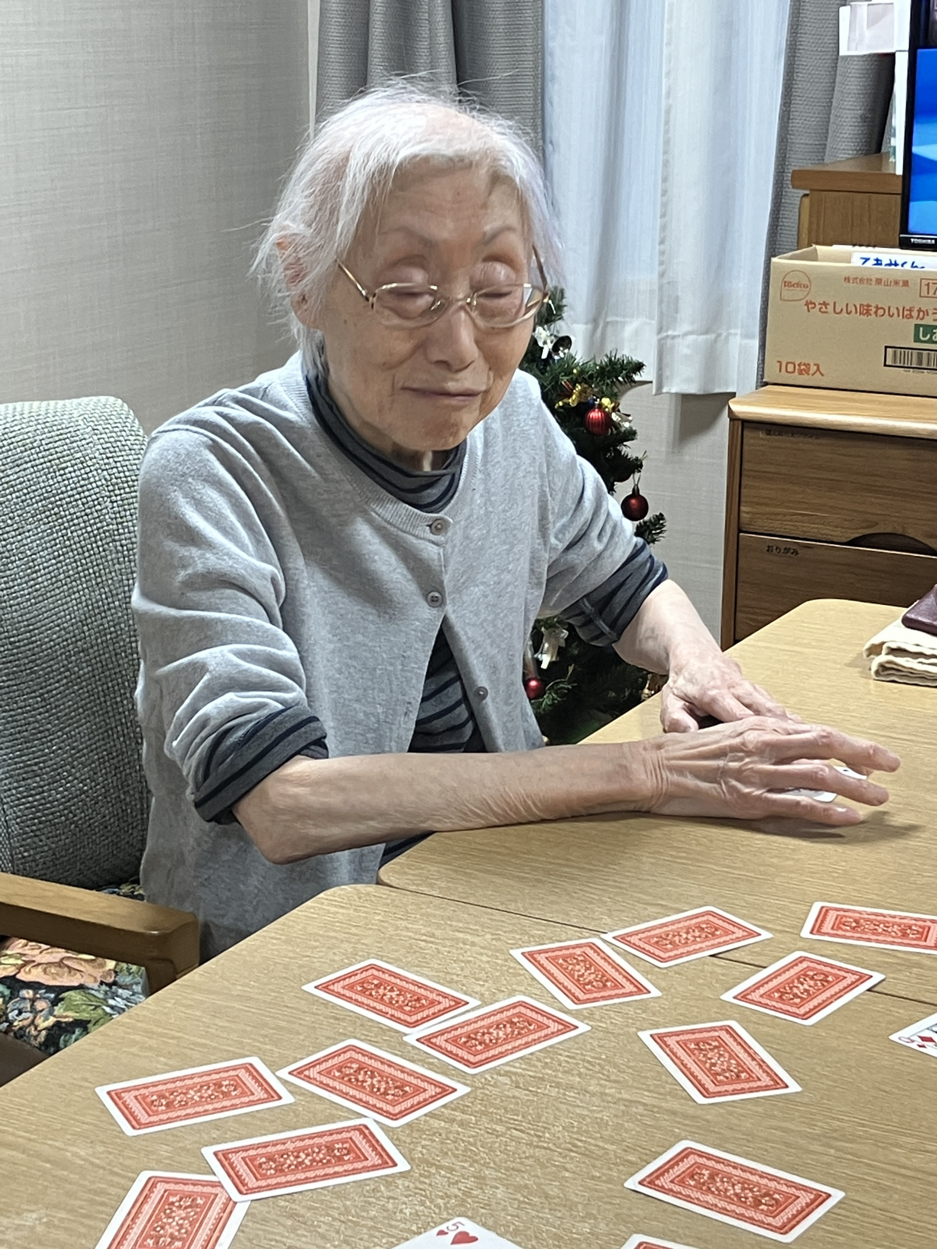 今日は朝から雨が降っています。フロアーではクリスマスの飾り付けをしたり、トランプをしたりしています。