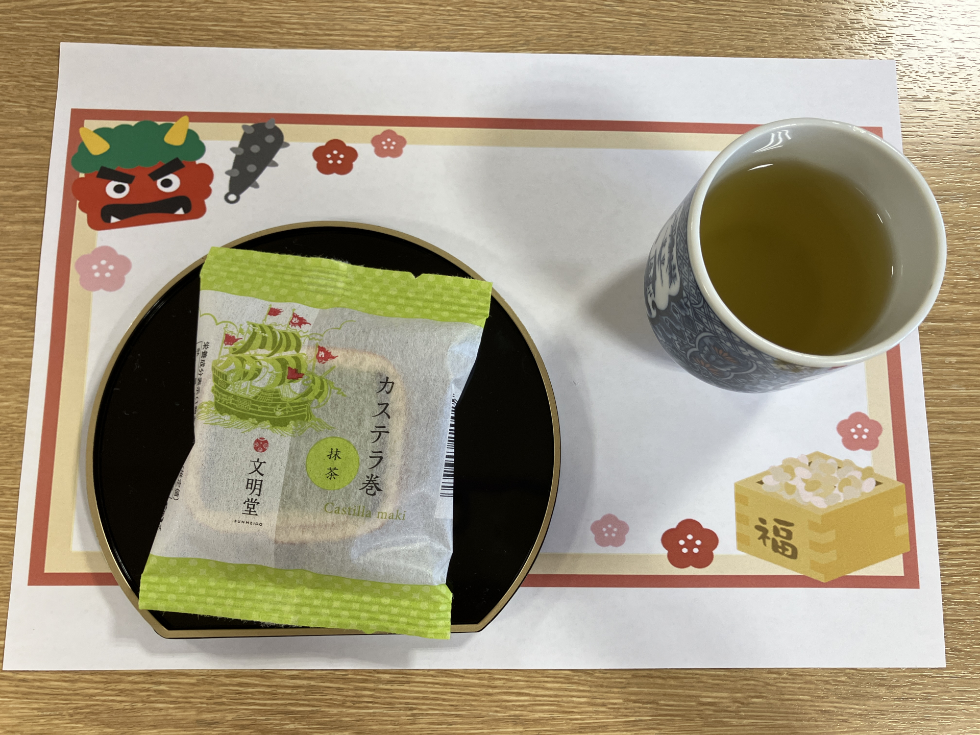 午後は職員が鬼になり、各フロアーを回りました。この後、文明堂のカステラをいただきました。