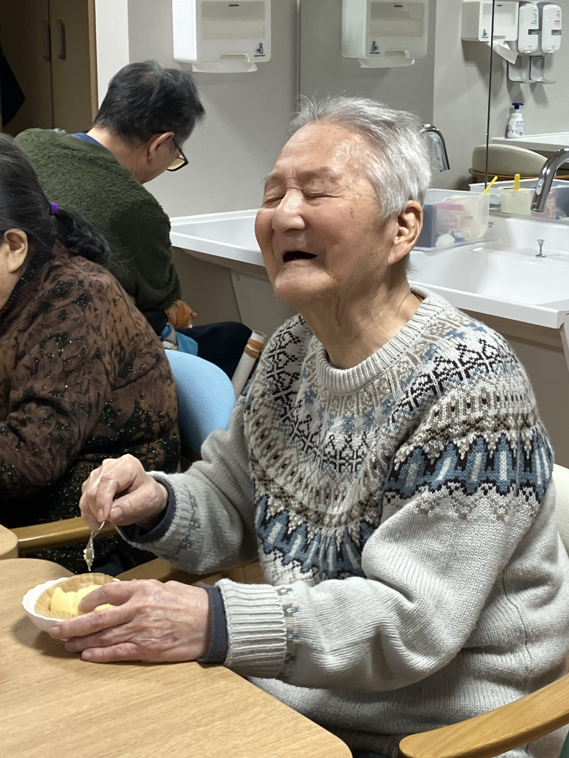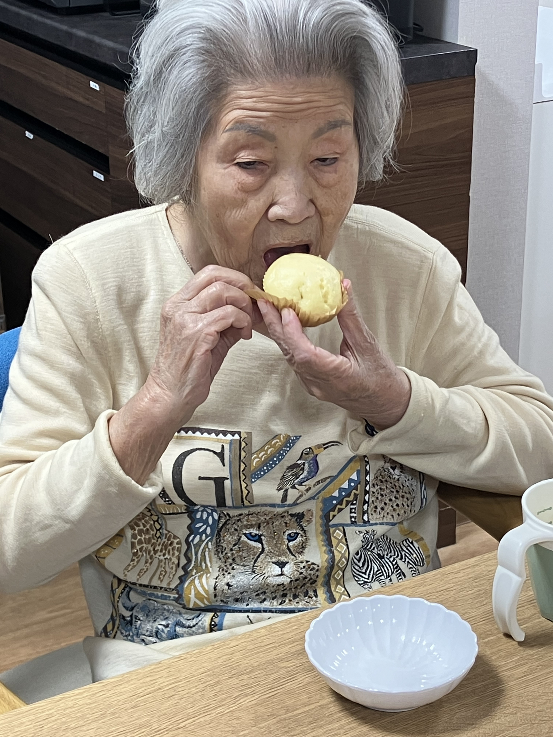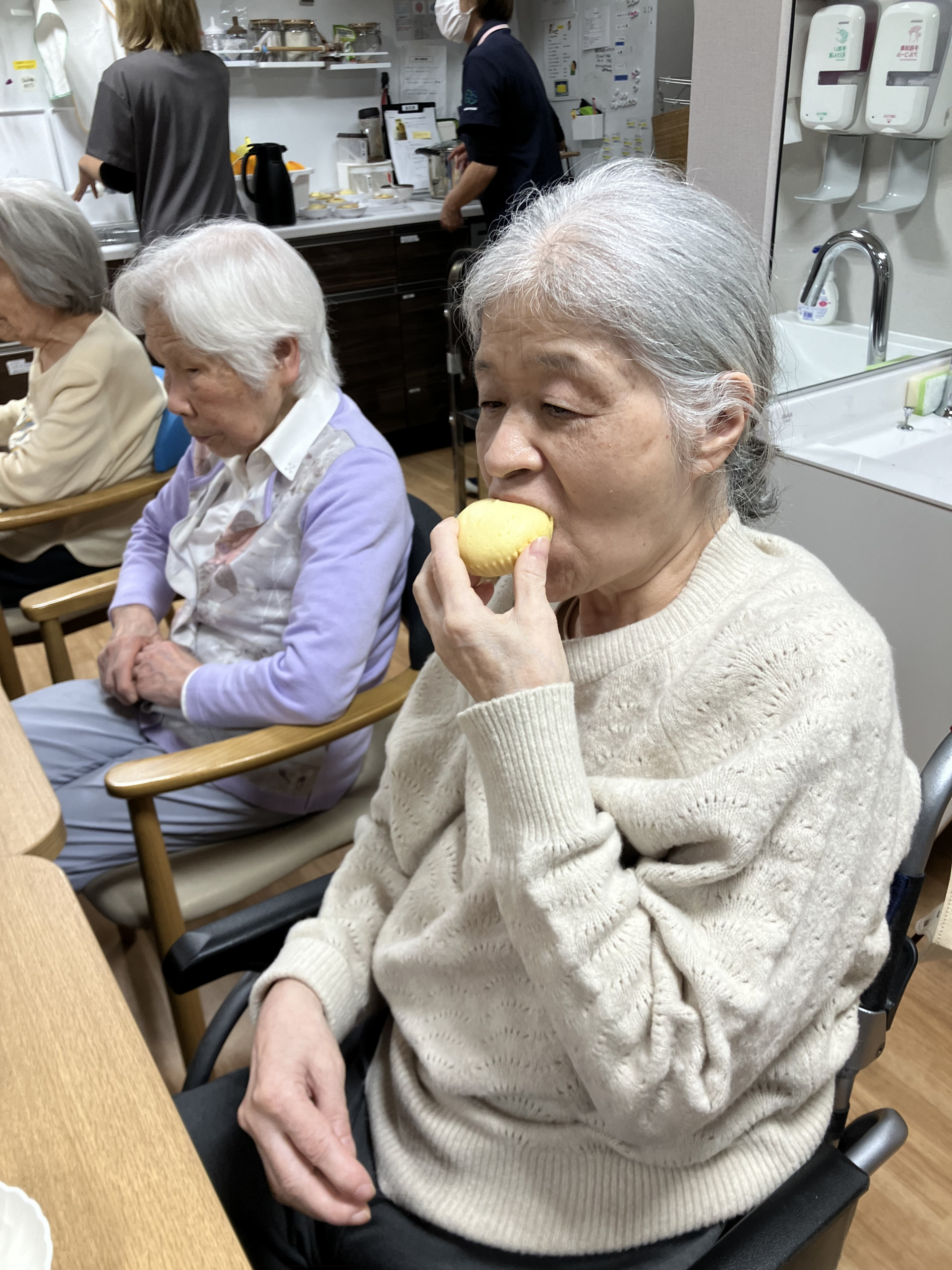 おやつは節分の豆の代わりに、甘納豆を入れた蒸しパンです!