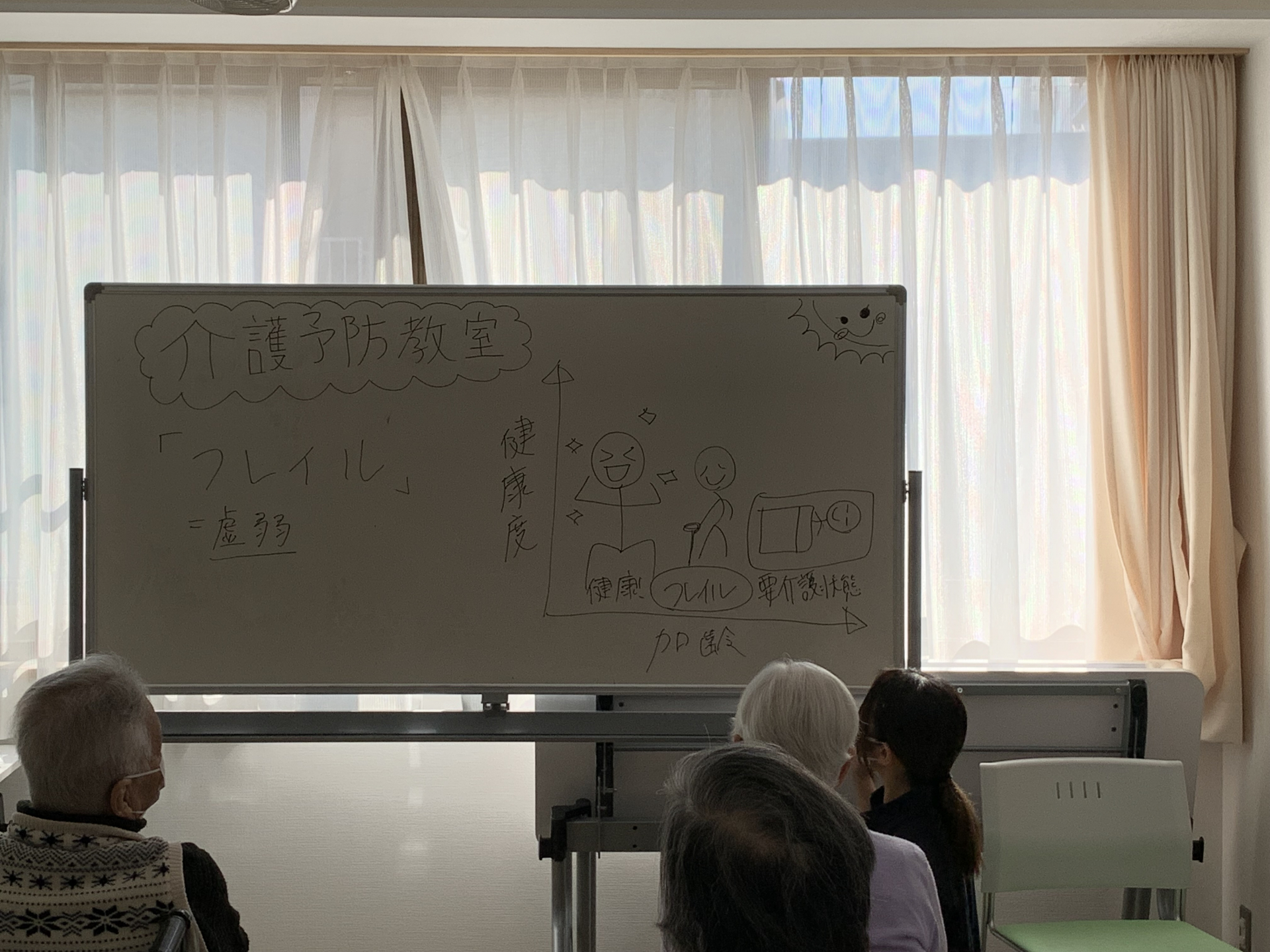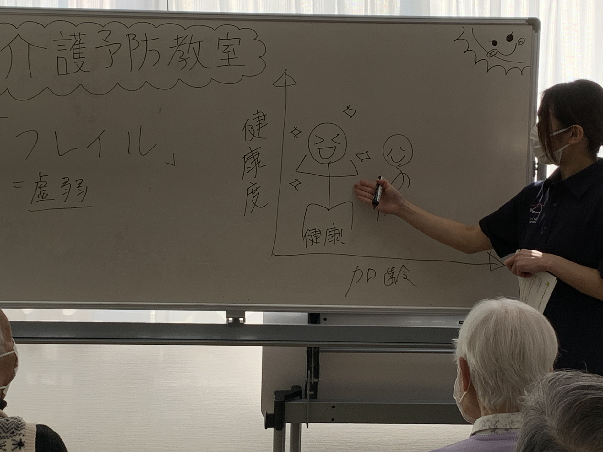 健康と要介護状態の間の虚弱状態を「フレイル」といいます!と、かわいい絵を書きながらの説明でした♪