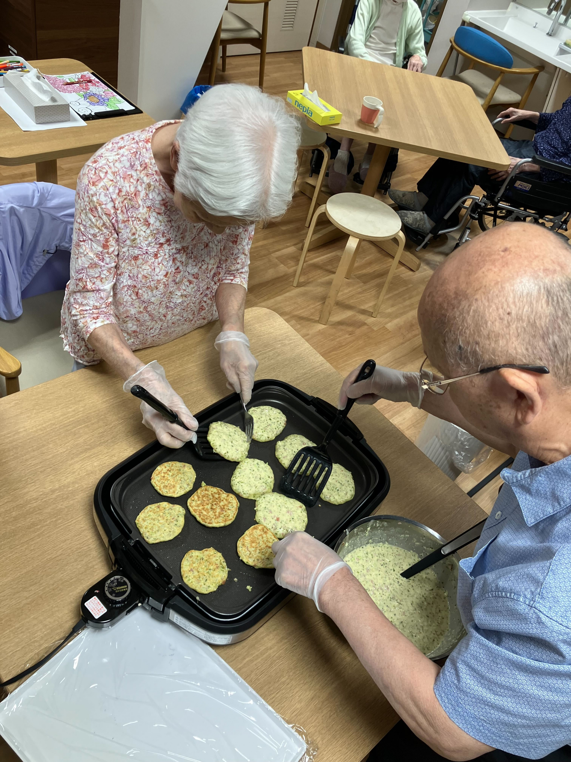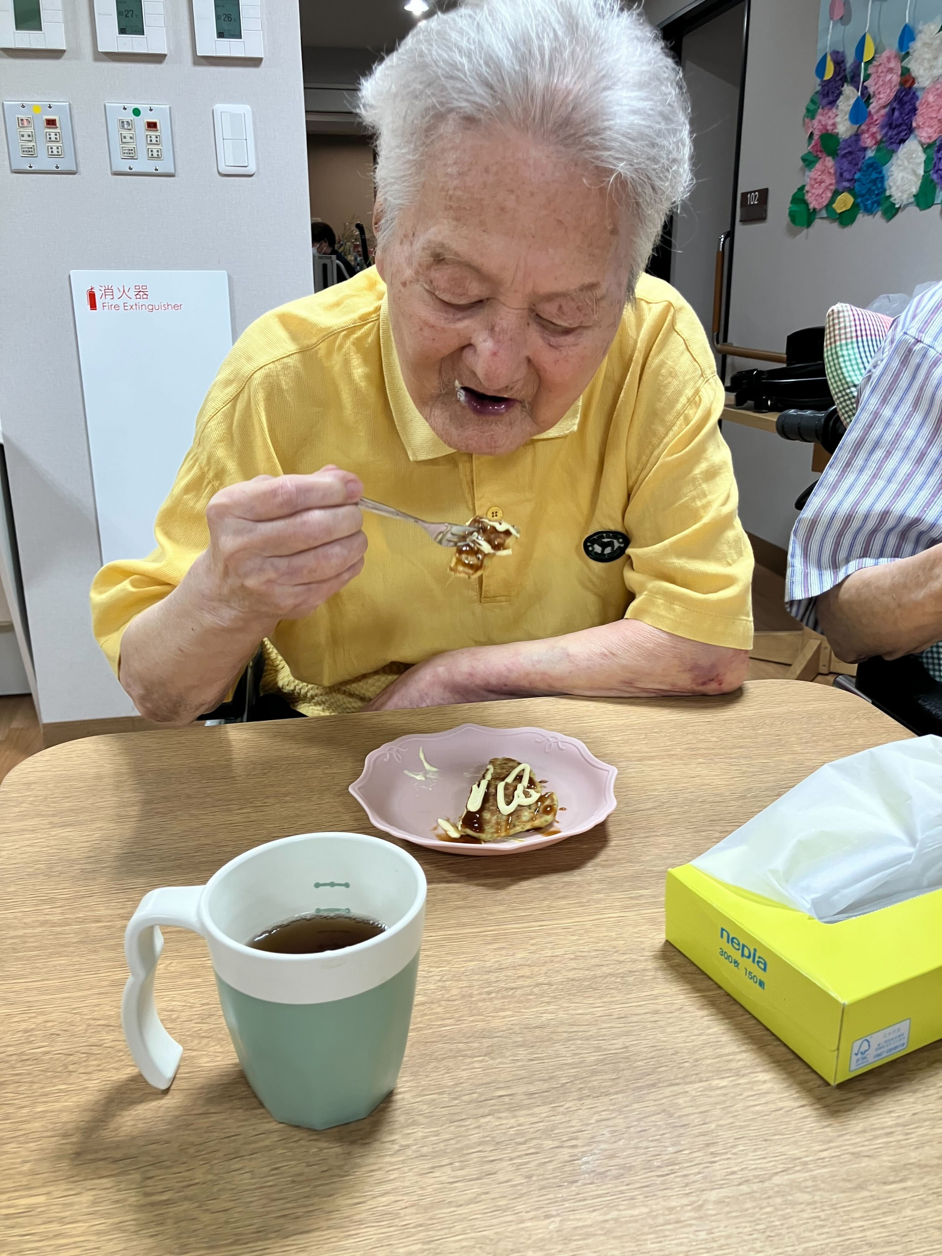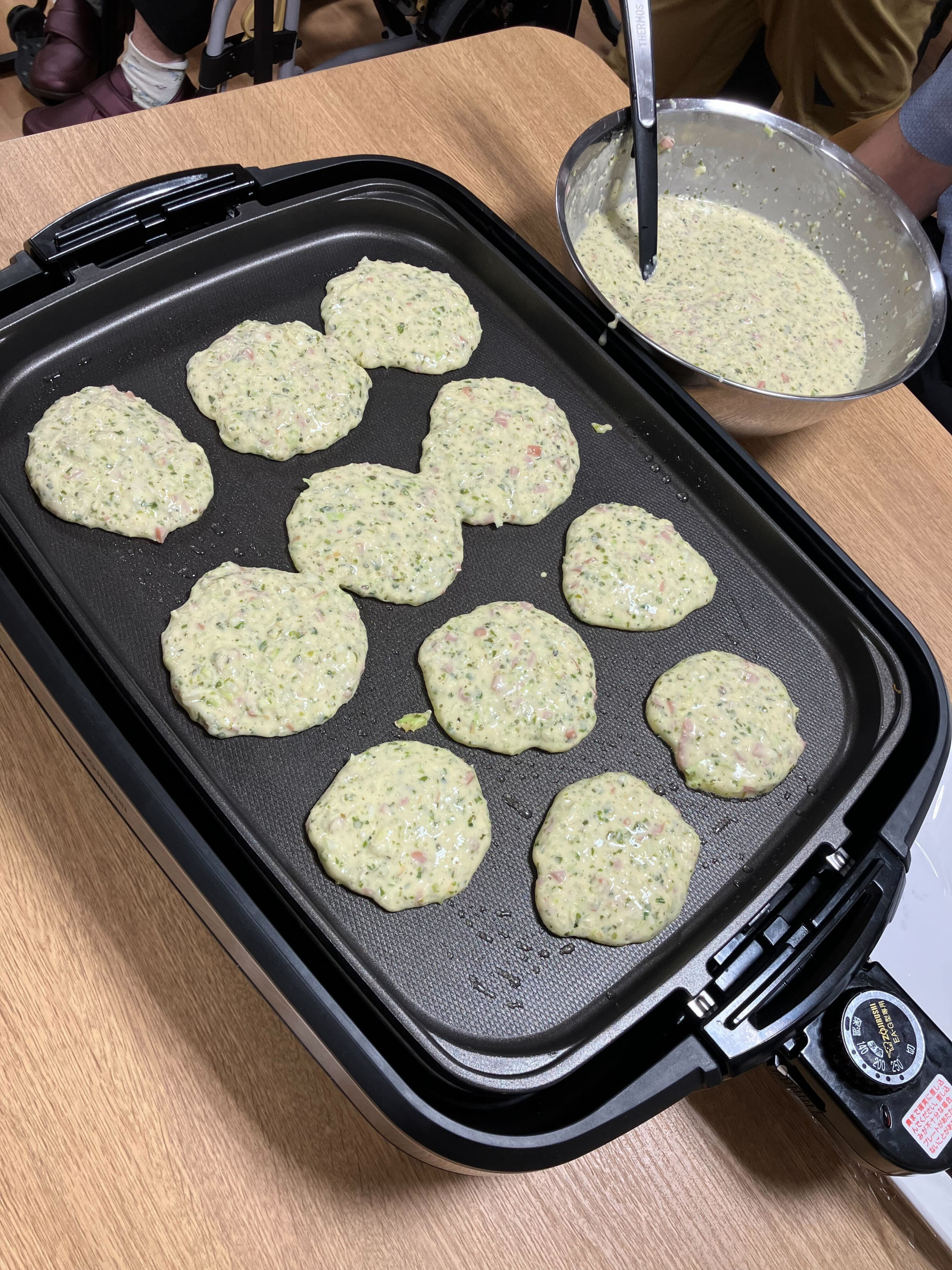今日のおやつはとろろをたっぷり入れた「ふわふわお好み焼き」です(^^)v