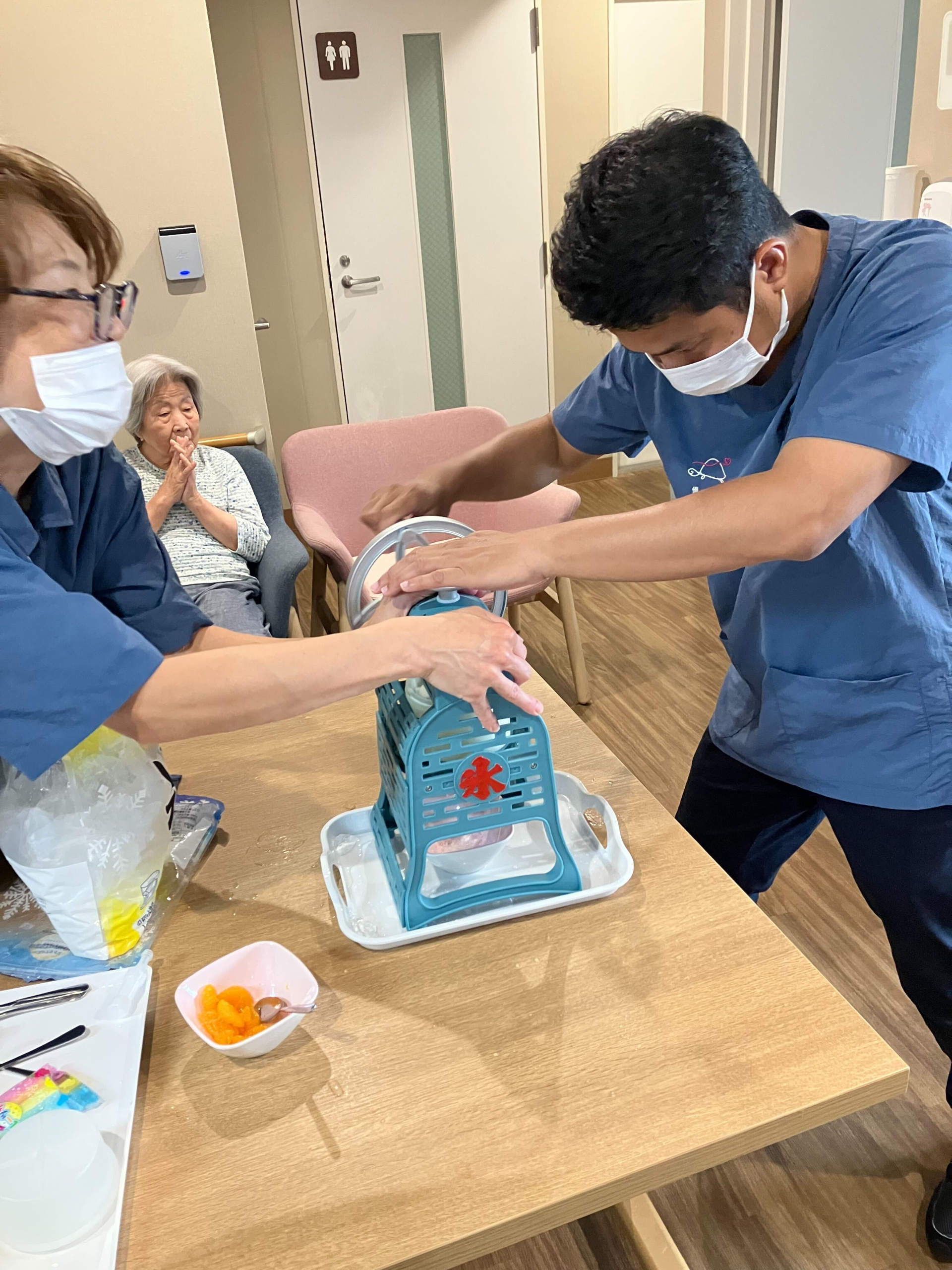 外でかき氷を作るとすぐに溶けてしまうので、かき氷製造は室内で(^O^)