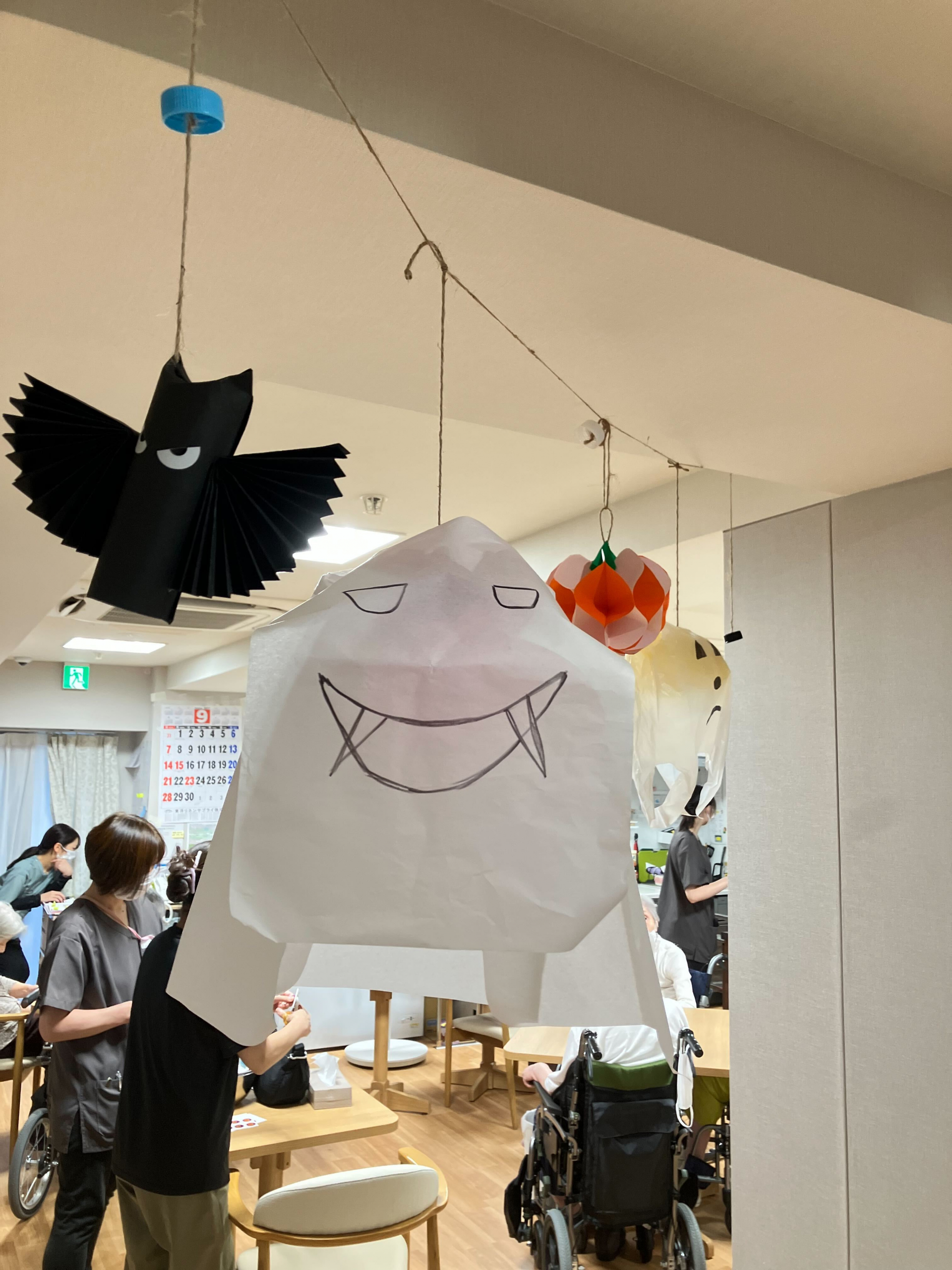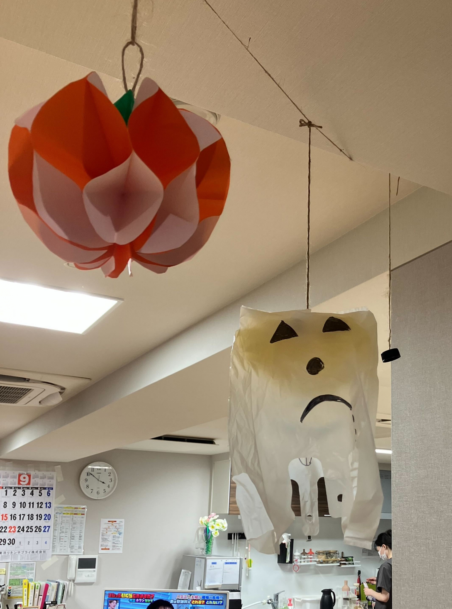 こちらでは野口職員が折り紙のカボチャや、お化けを飾っています(^O^)