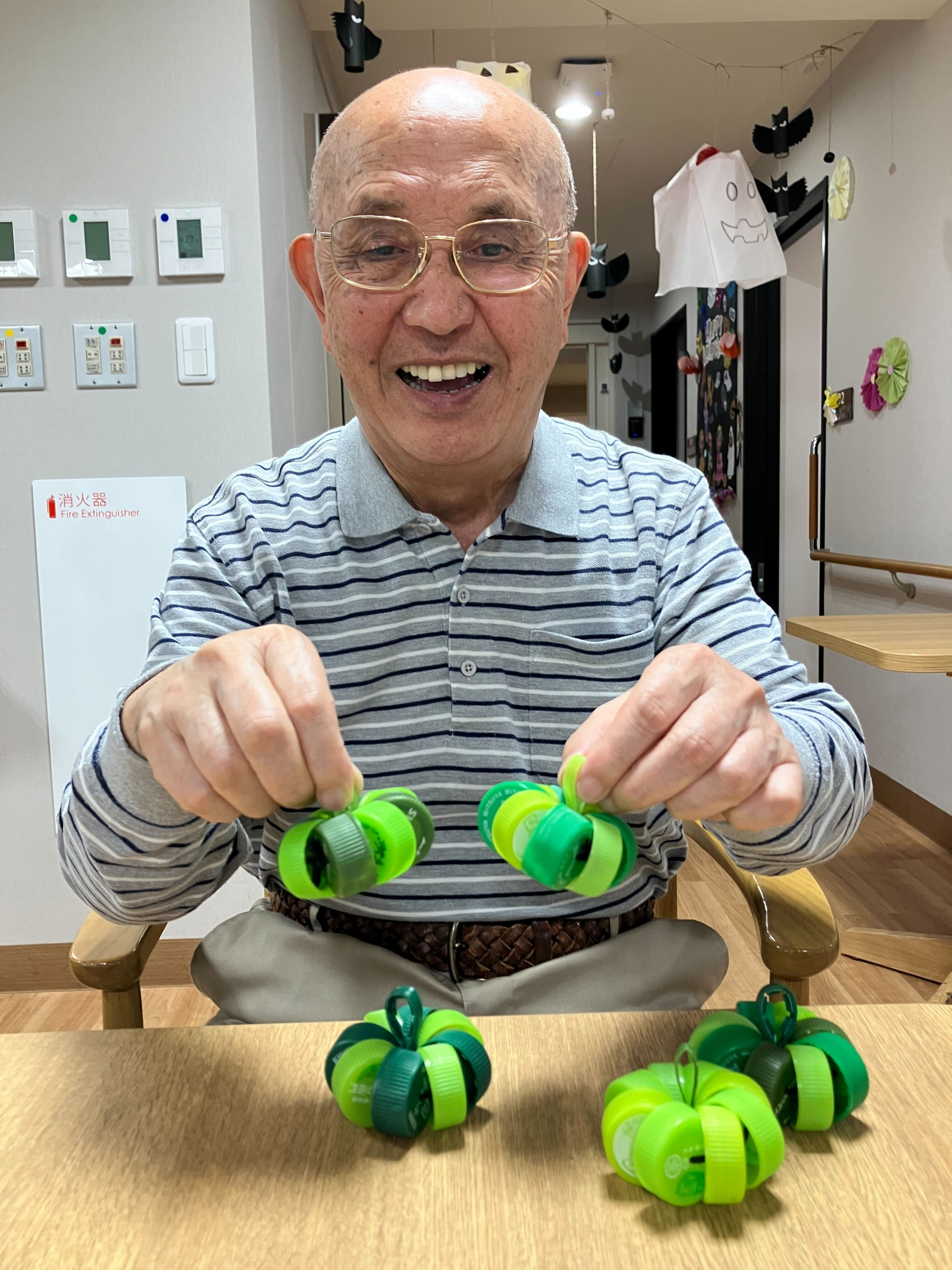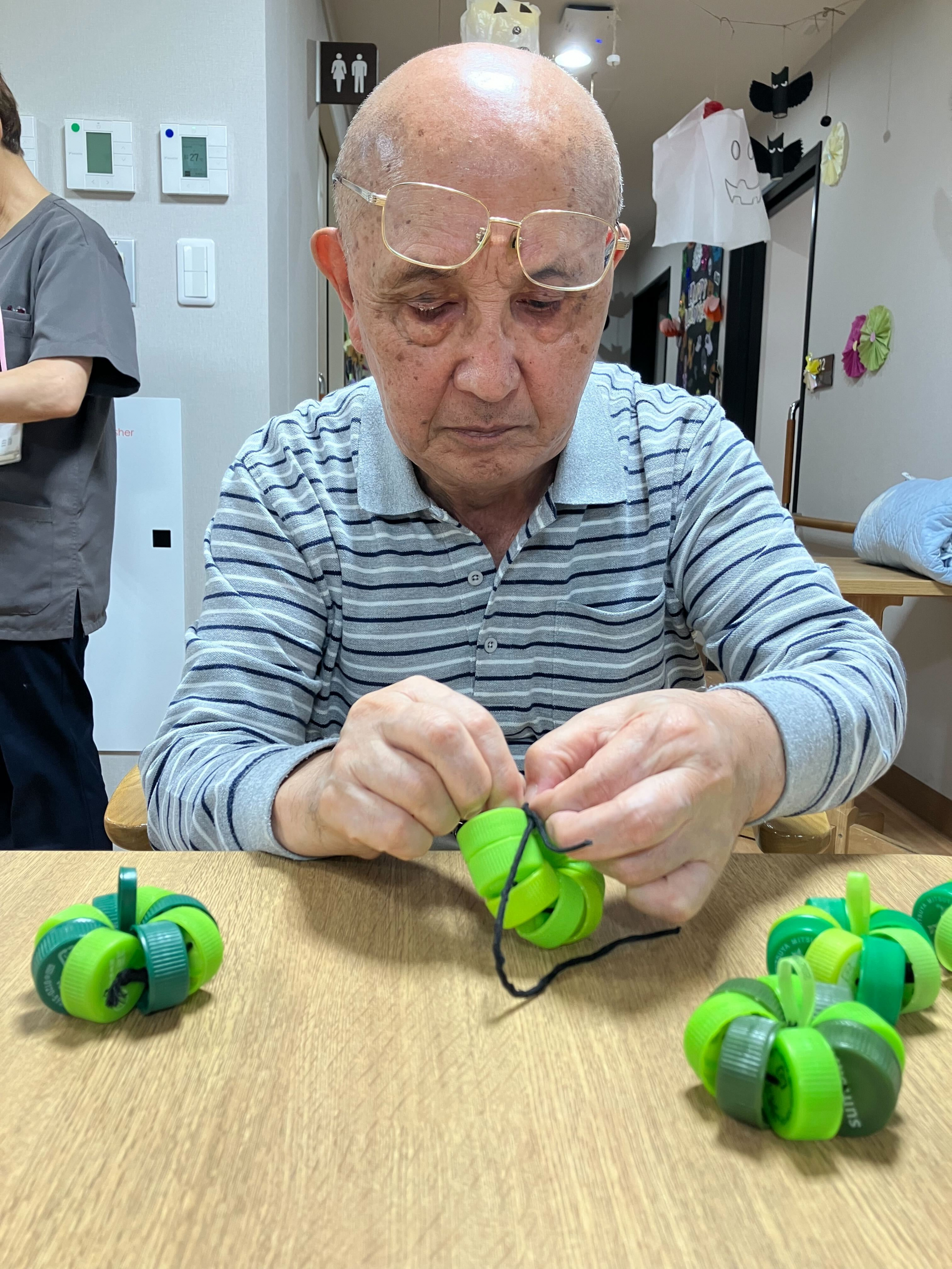 M様がペットボトルのふたにひもを通してカボチャを作ります♪