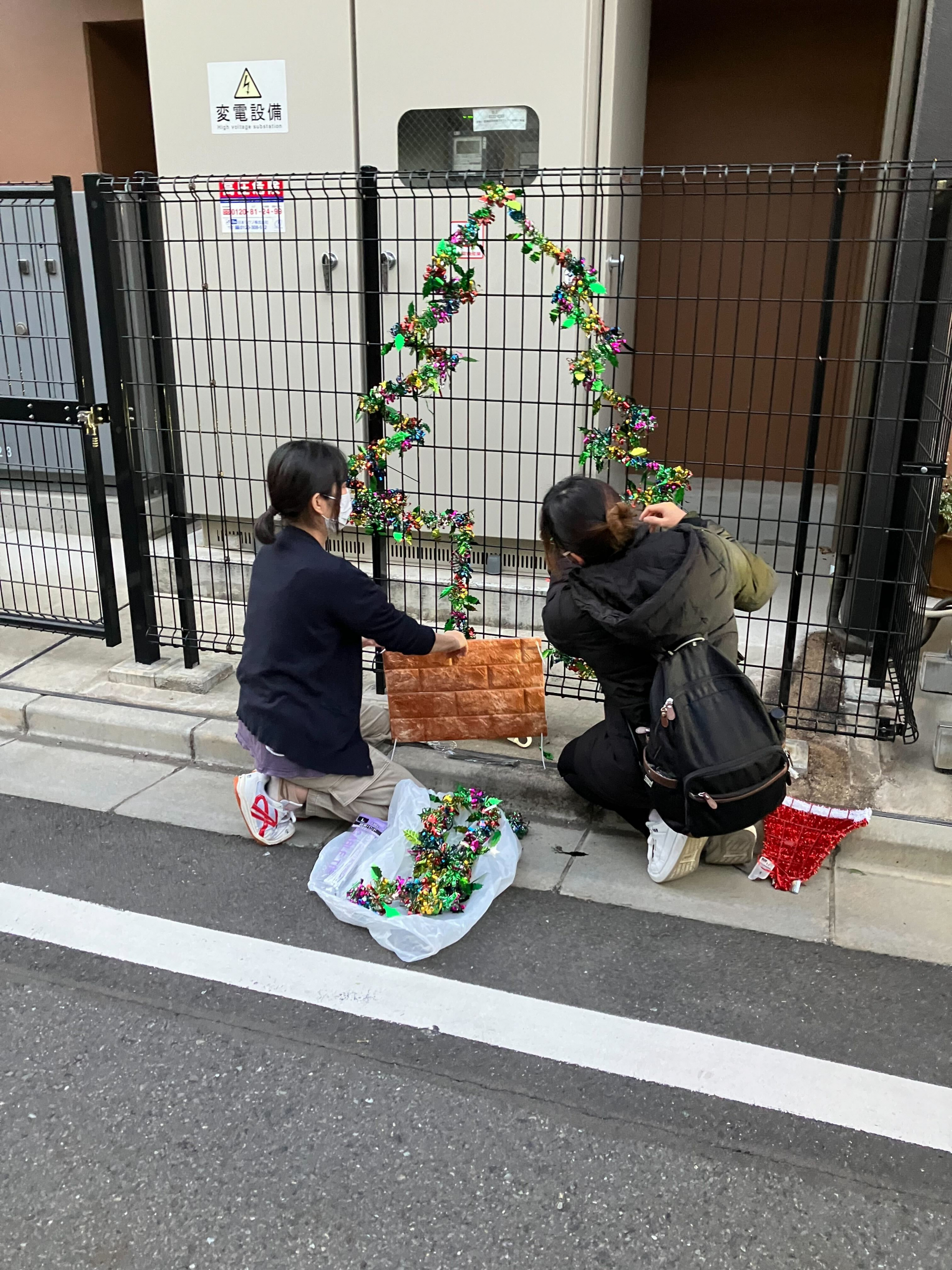 外の柵にクリスマスツリーを飾っています♪