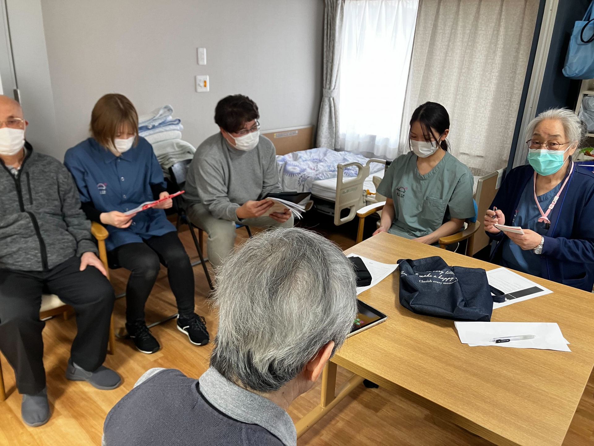 海保支配人、八重樫ケアマネ、岡田理学療法士、安藤看護師、そして介護職員で