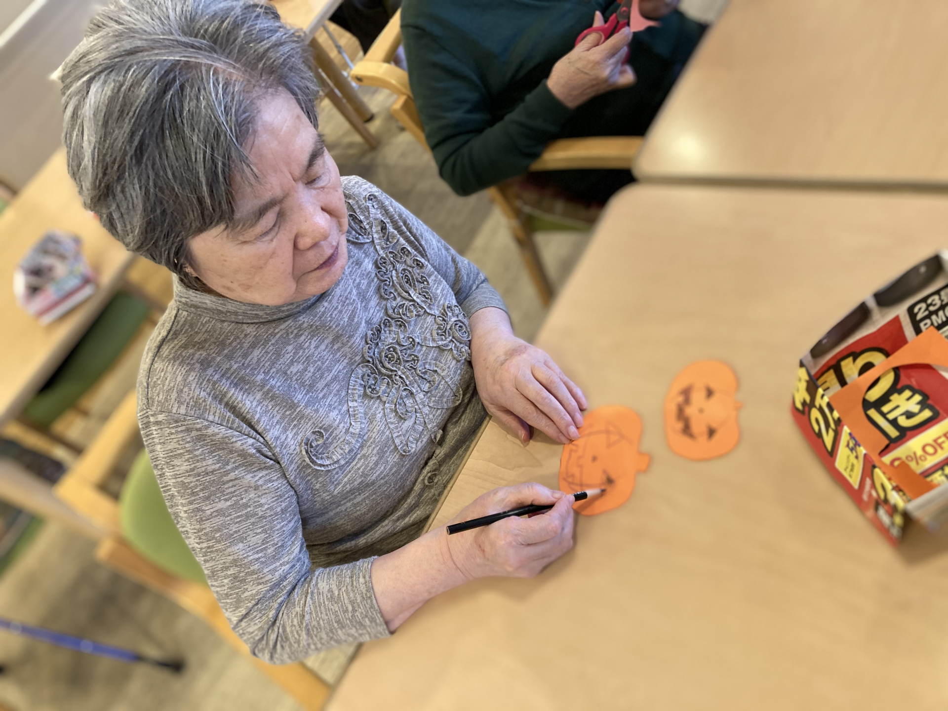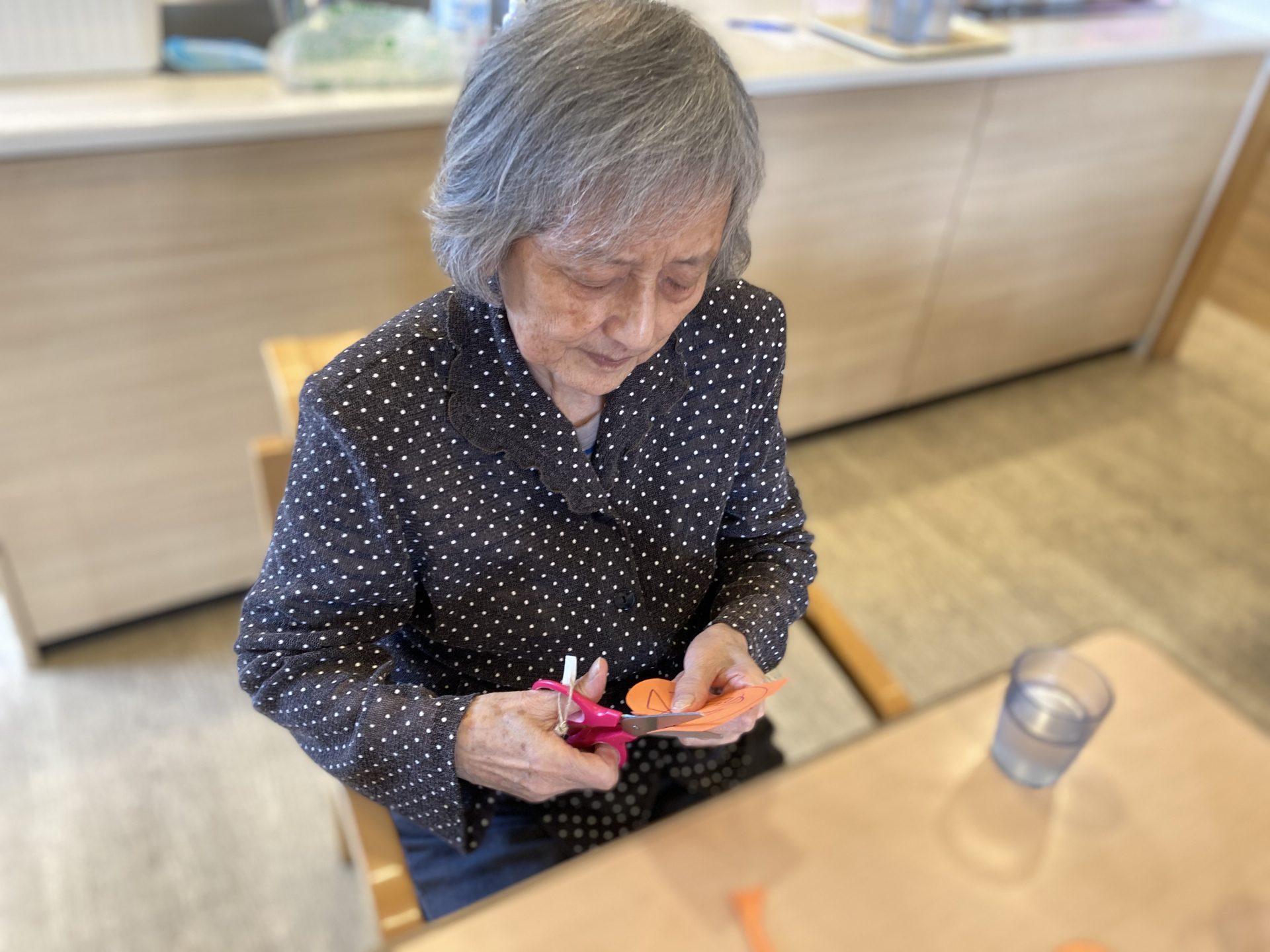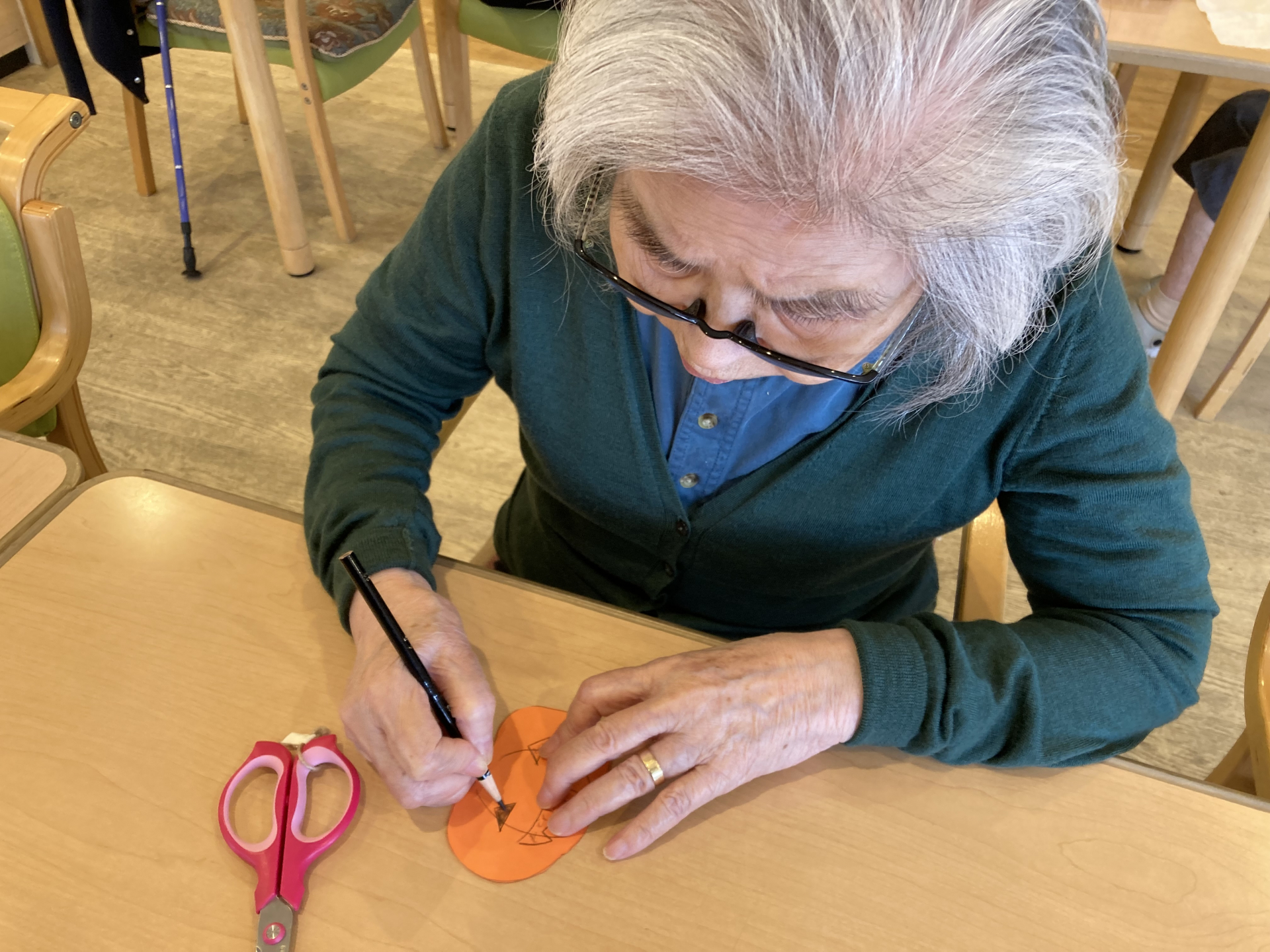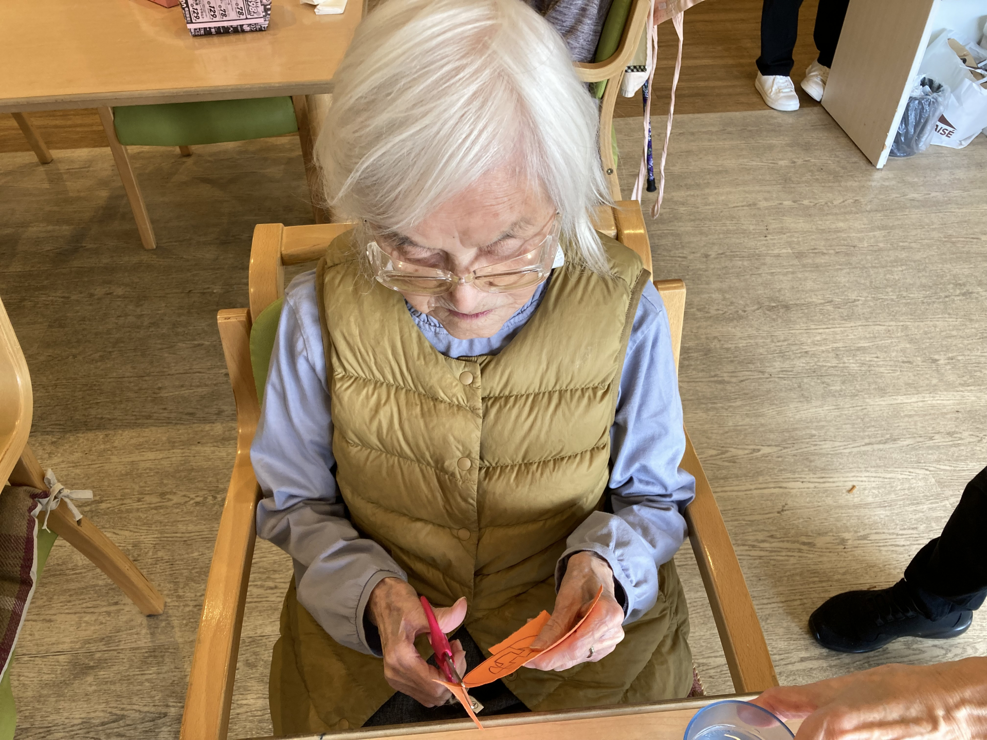 先日、北ユニットでハロウィンの飾り(ガーランド)を皆さまと一緒に作りました♪