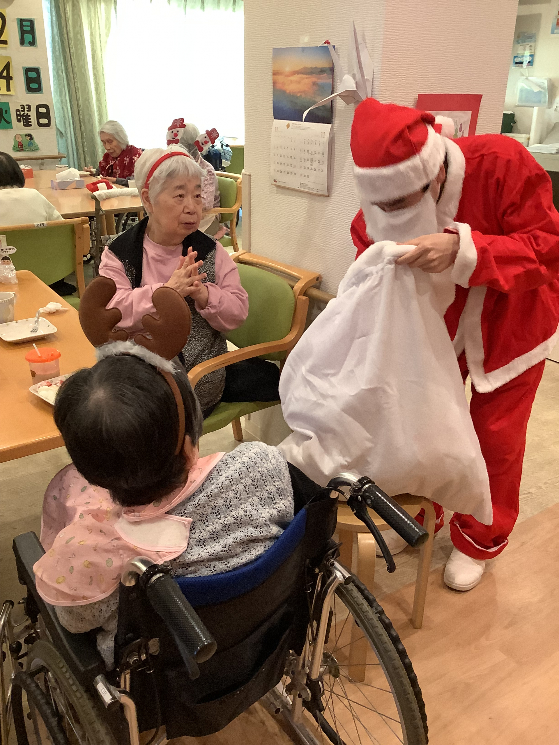 サンタさんが大きな袋からプレゼントをお一人づつ配ります