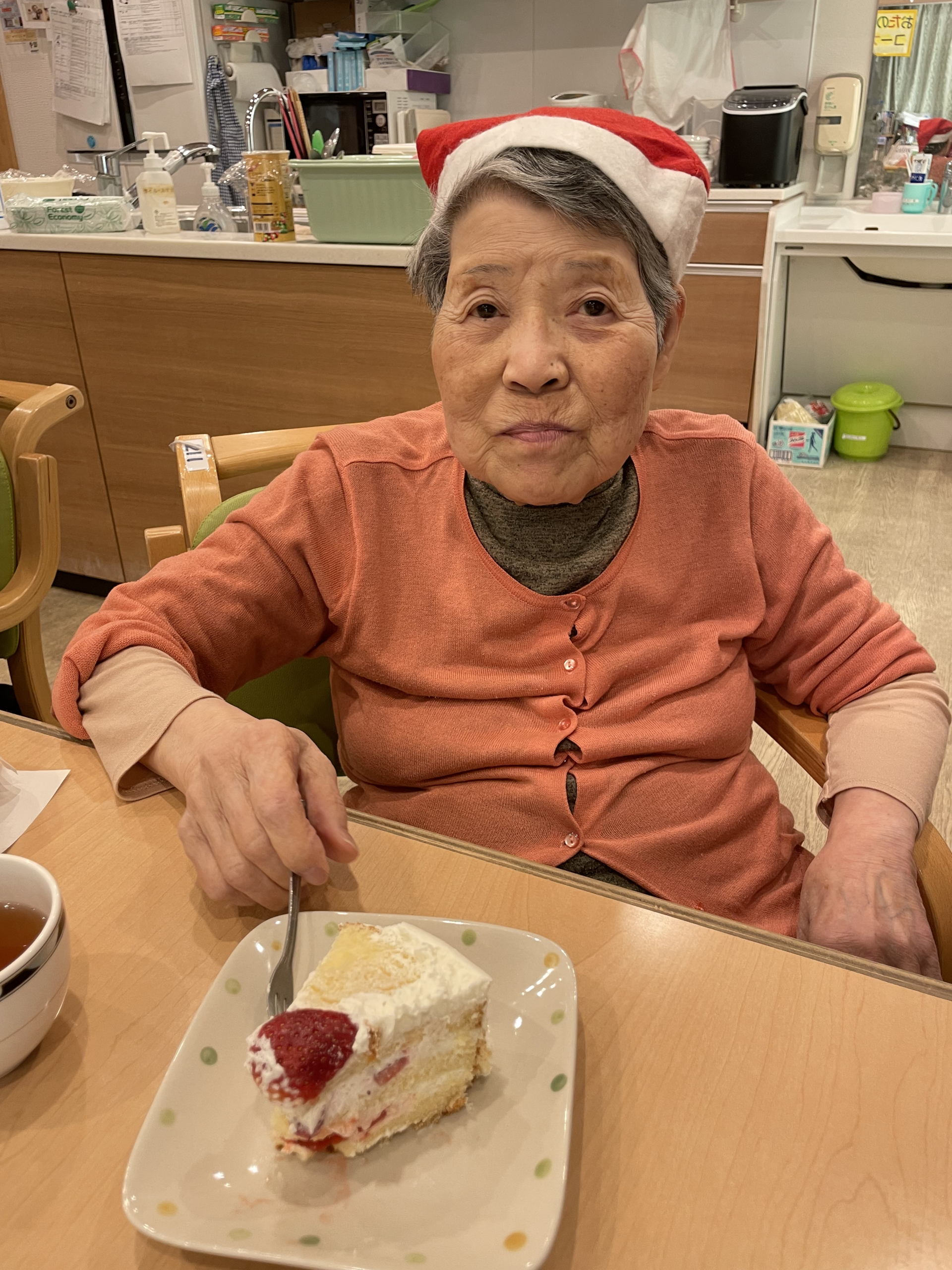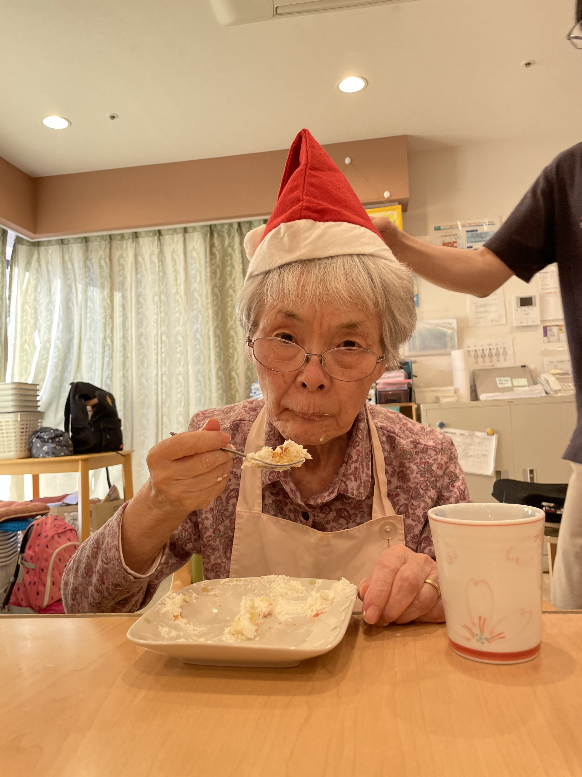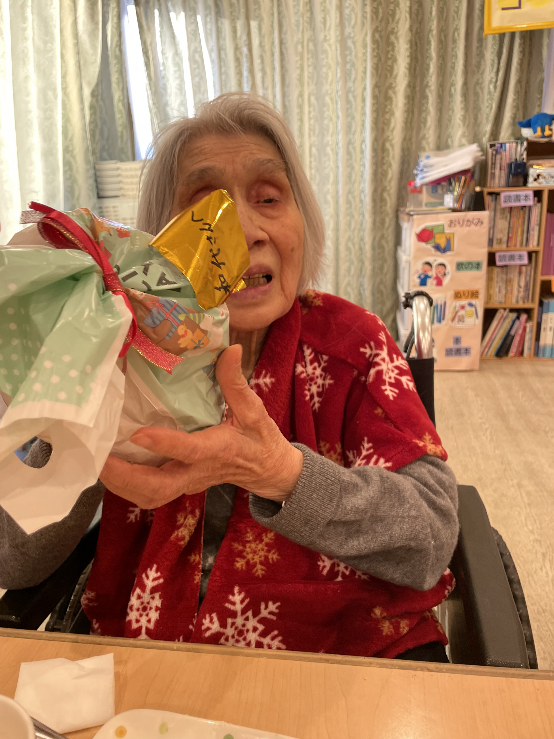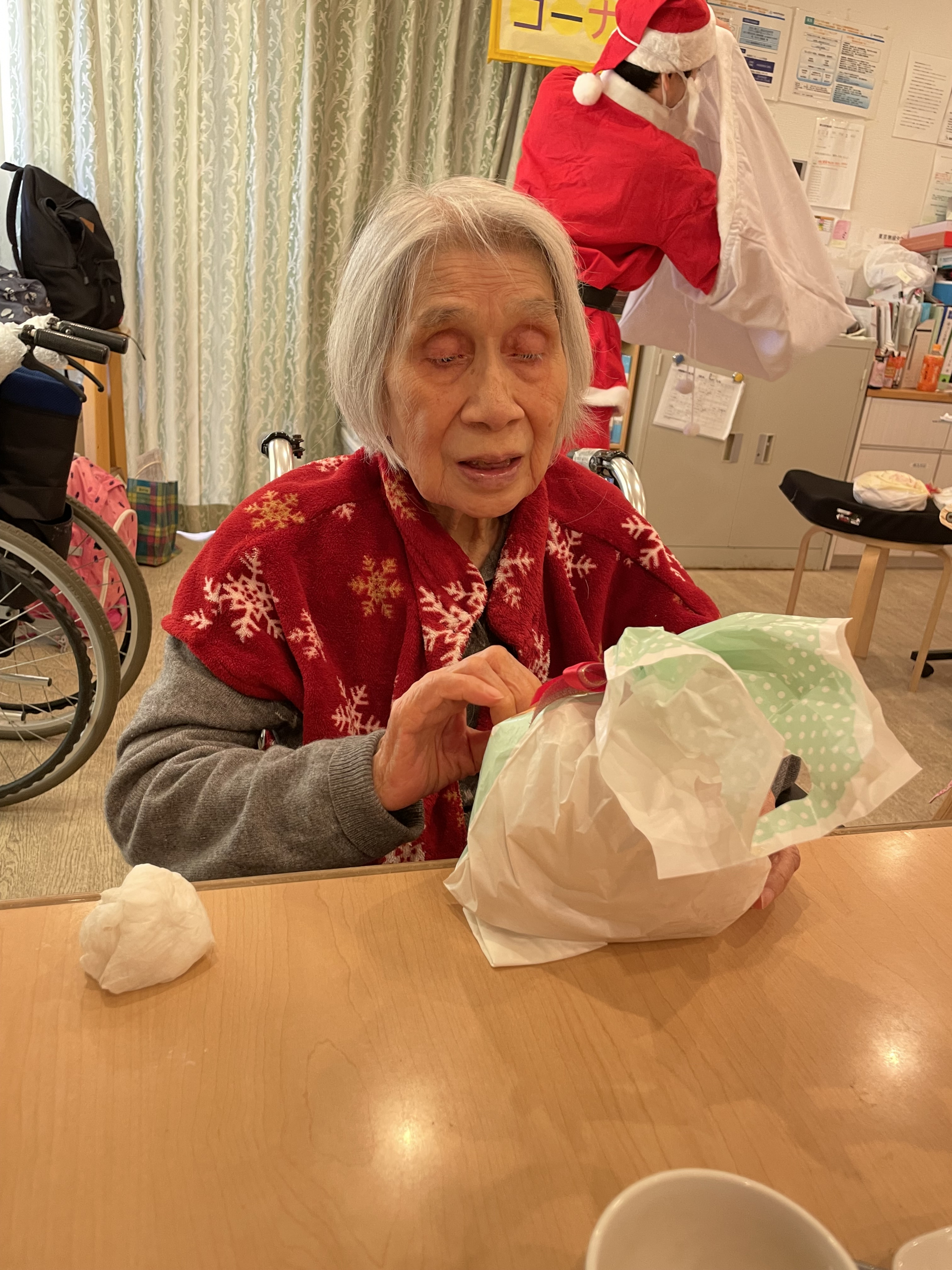サンタのお帽子を職員が用意しかぶっていただいて、写真を撮らせていただきました