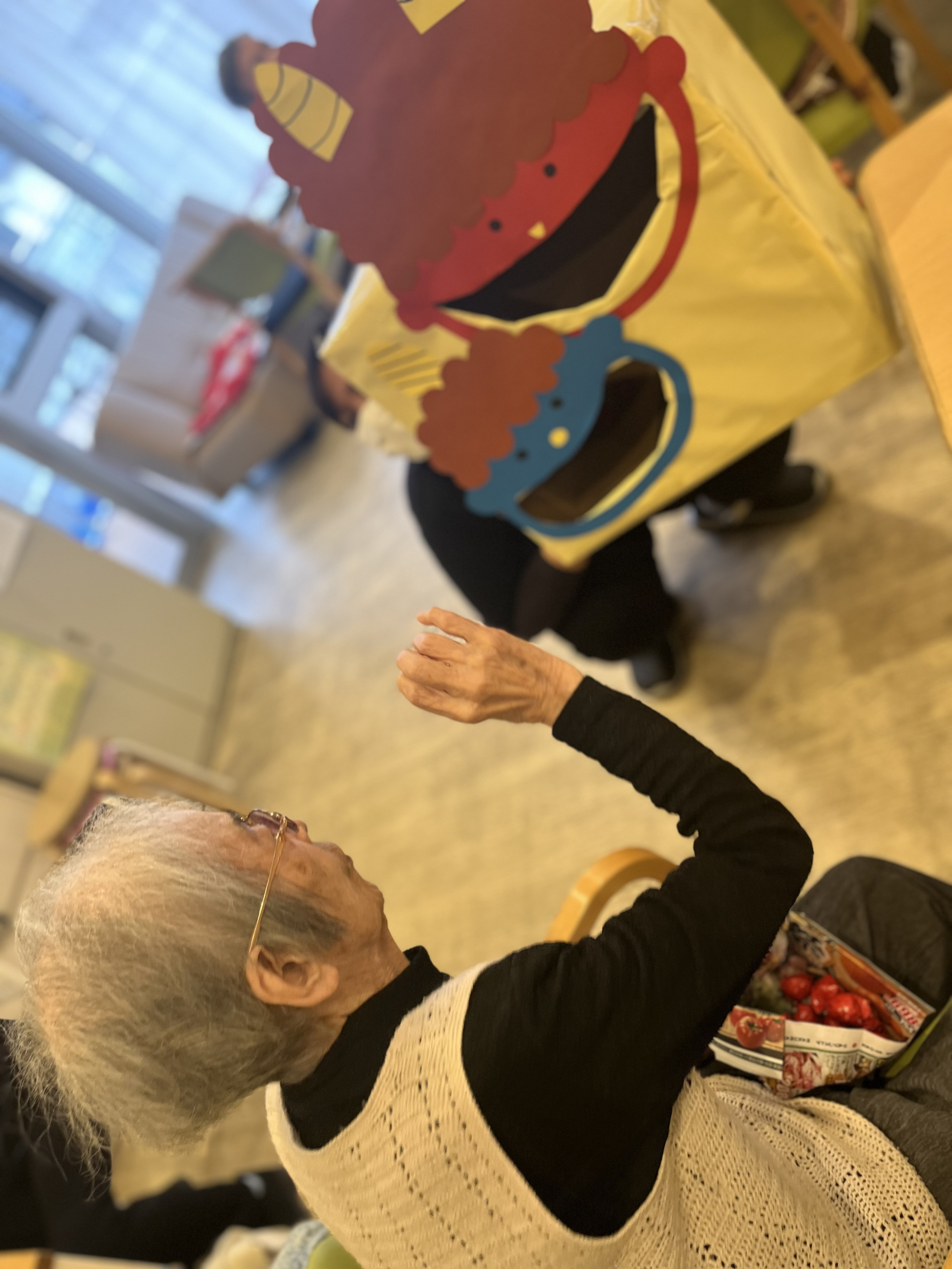 段ボールで作った鬼の口をめがけて、豆(小さく丸めた新聞紙)を投げていました