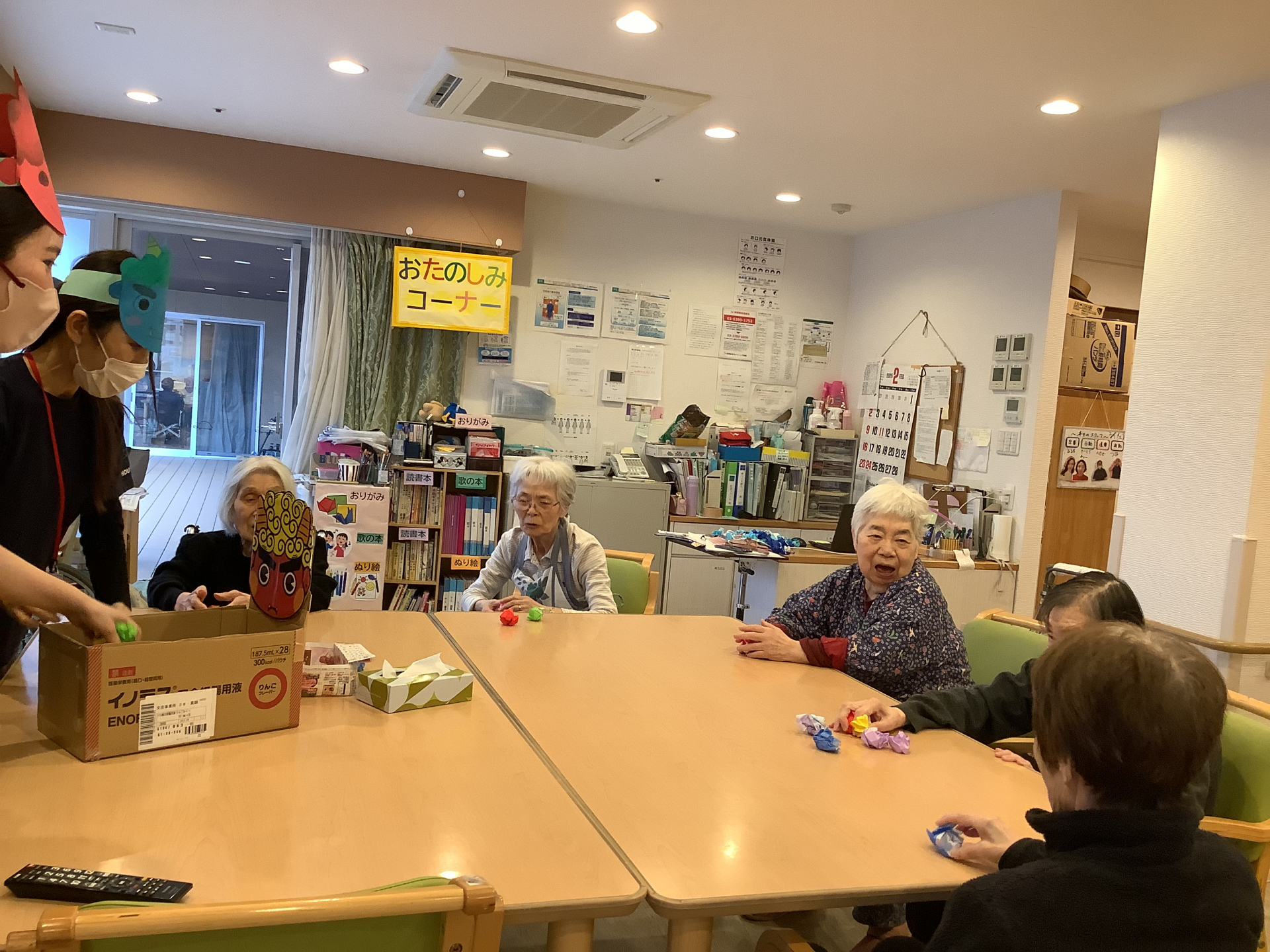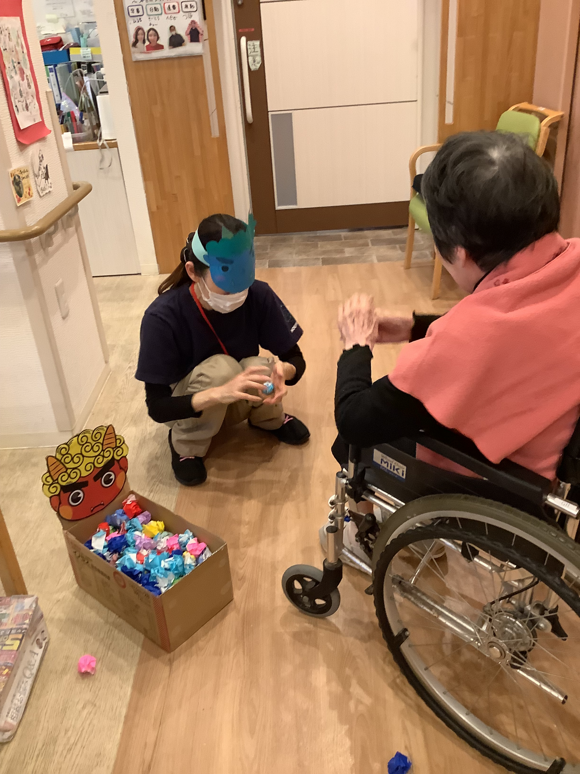 O様にも参加していただき、鬼は外と職員より沢山の福は内の豆を送りました(*^-^*)