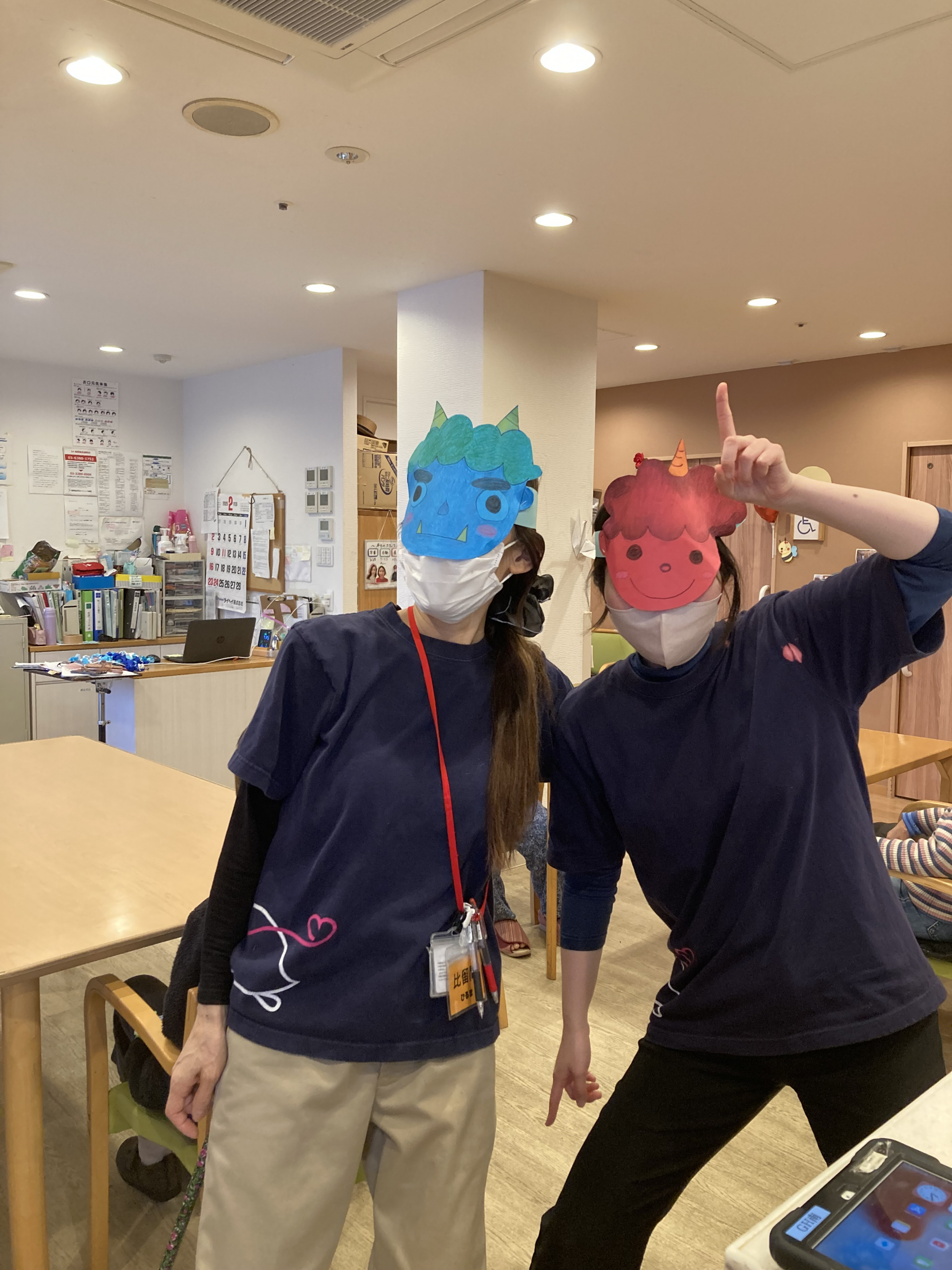 職員が赤鬼と青鬼のお面をかぶり、鬼退治ゲームをしました^^