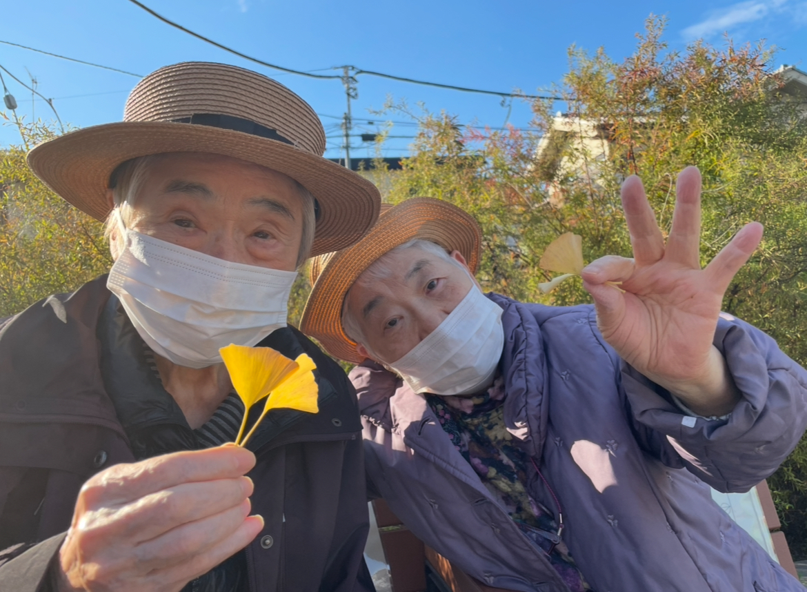 肩を寄せ合いながら落ち葉を手に取って「きれいねぇ」と笑いあうお二人