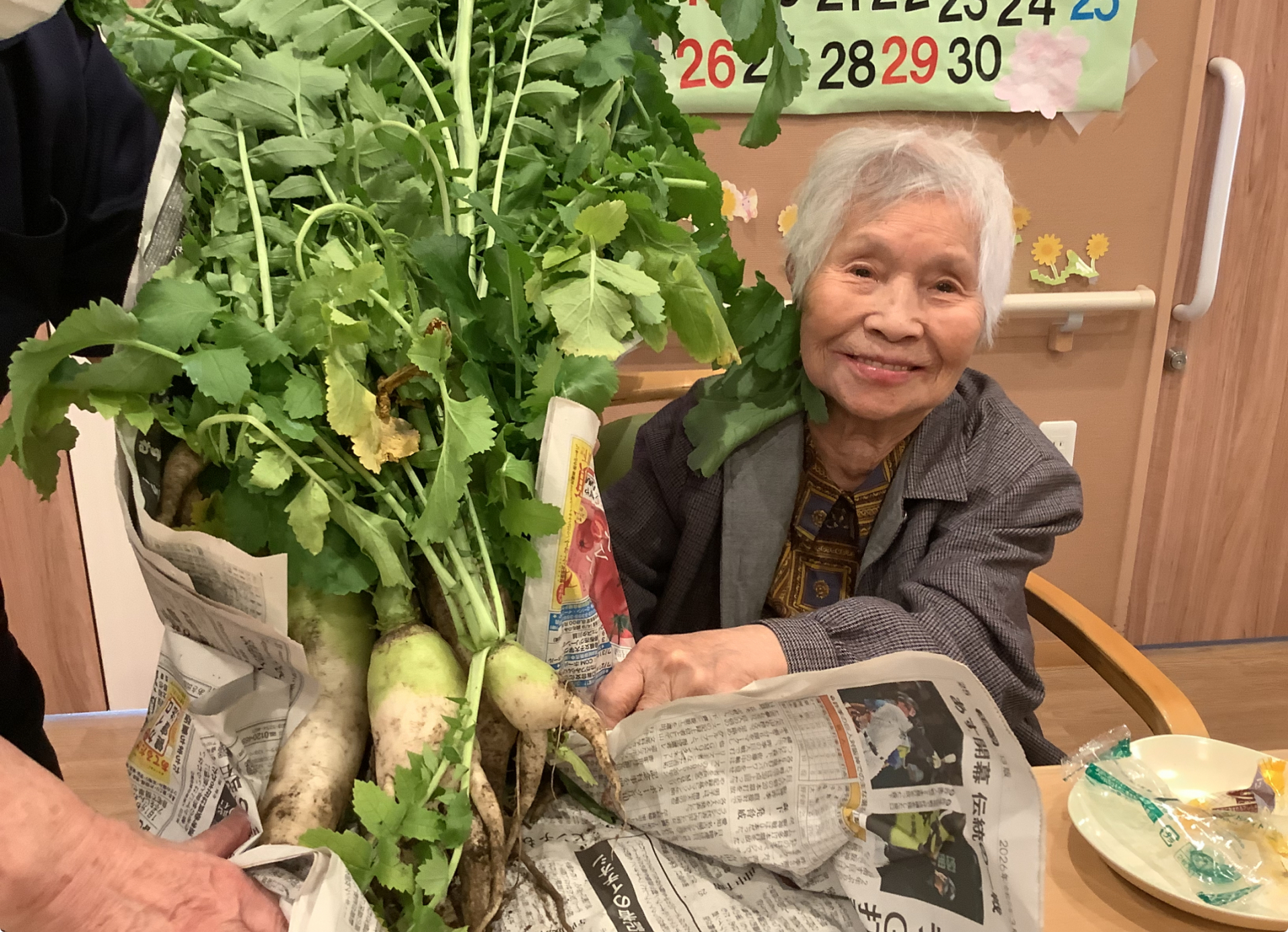 今日はお天気が良くて中庭に出て畑で収穫をしました(^^)
