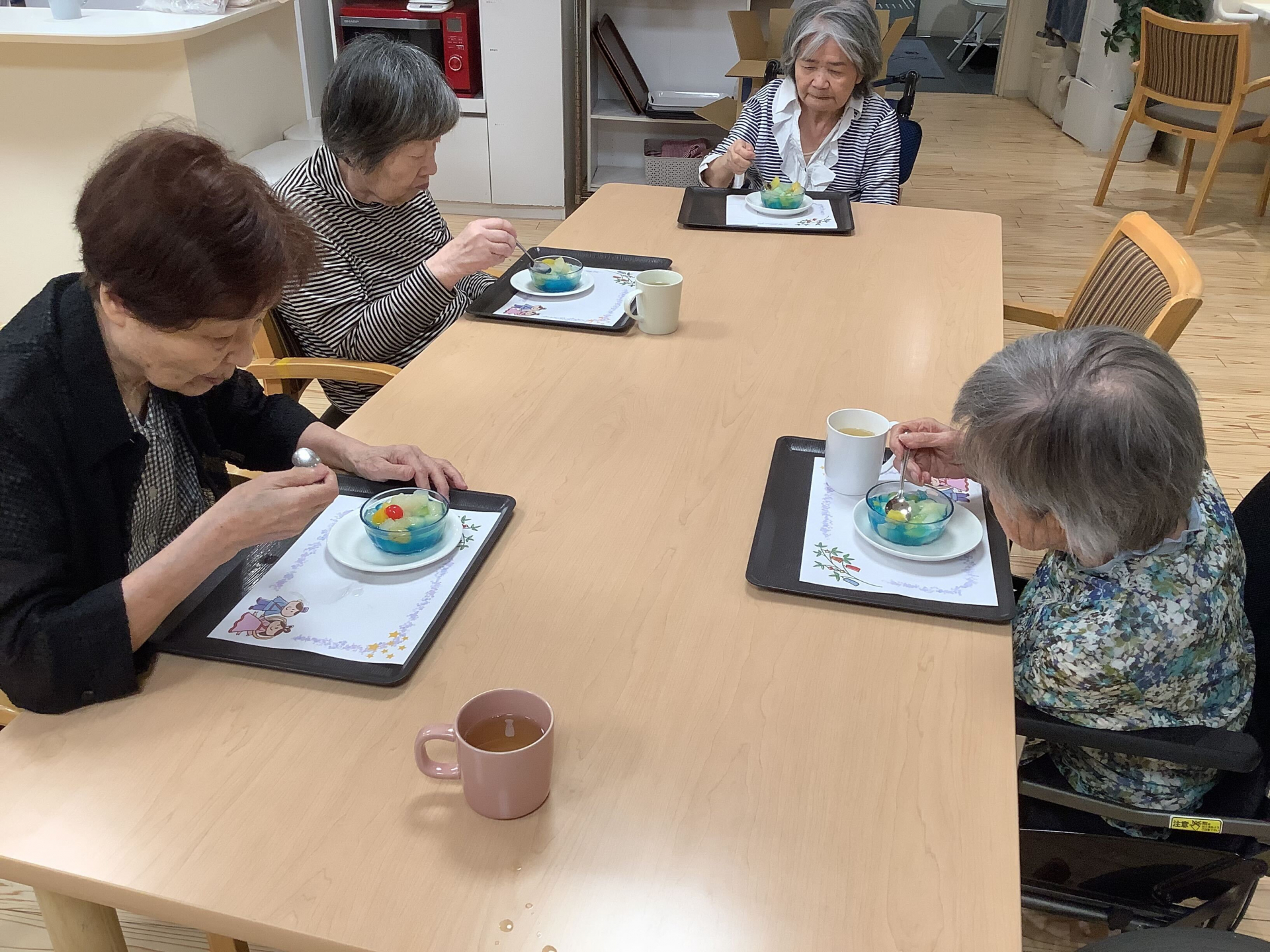 色とりどりのゼリーを前に、利用者様からは「綺麗ね~!」「食べるのがもったいないわ!」