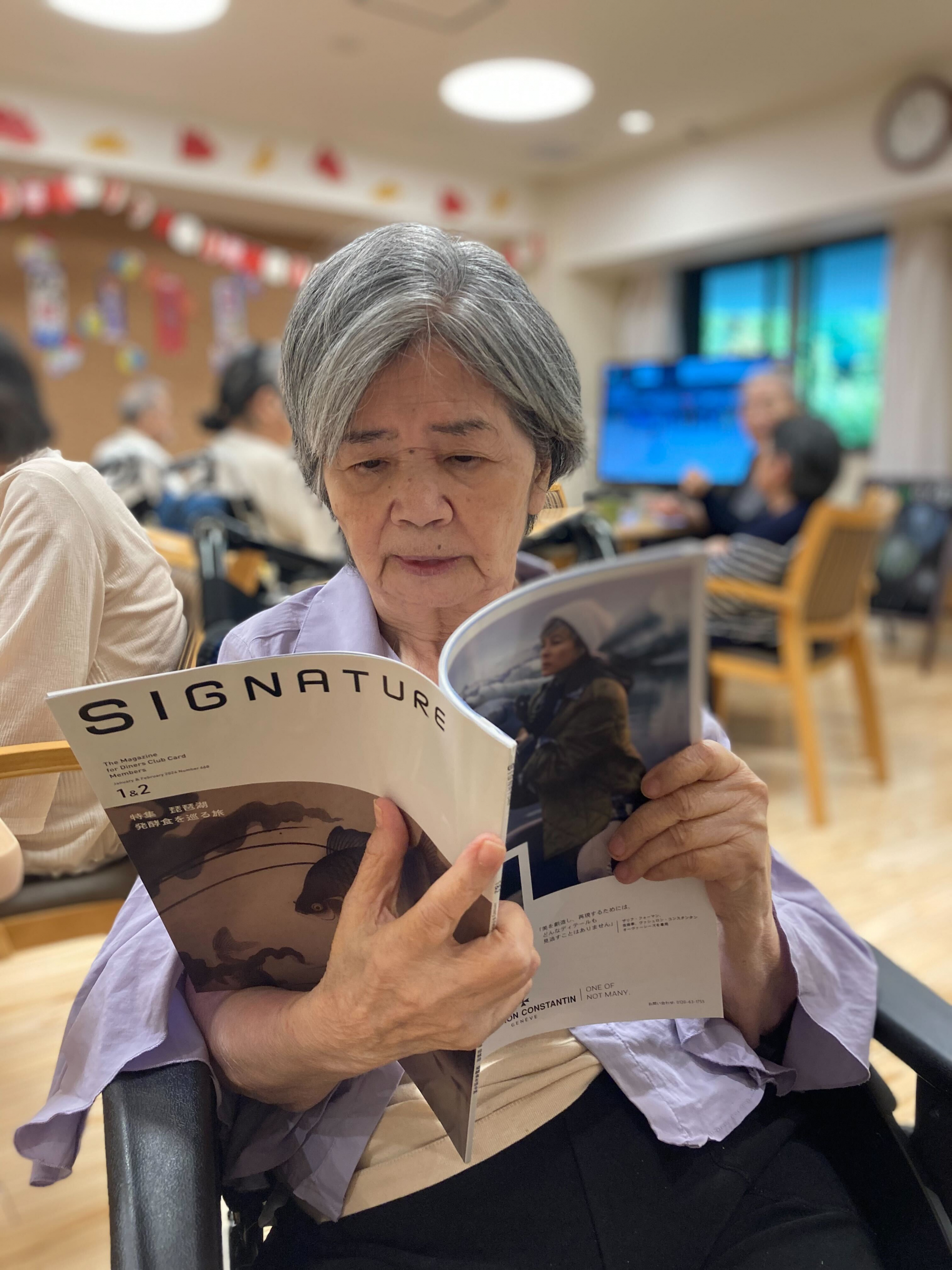 本日、利用者様はゆったりした時間を過ごされ、雑誌を読んでいっらさいました。