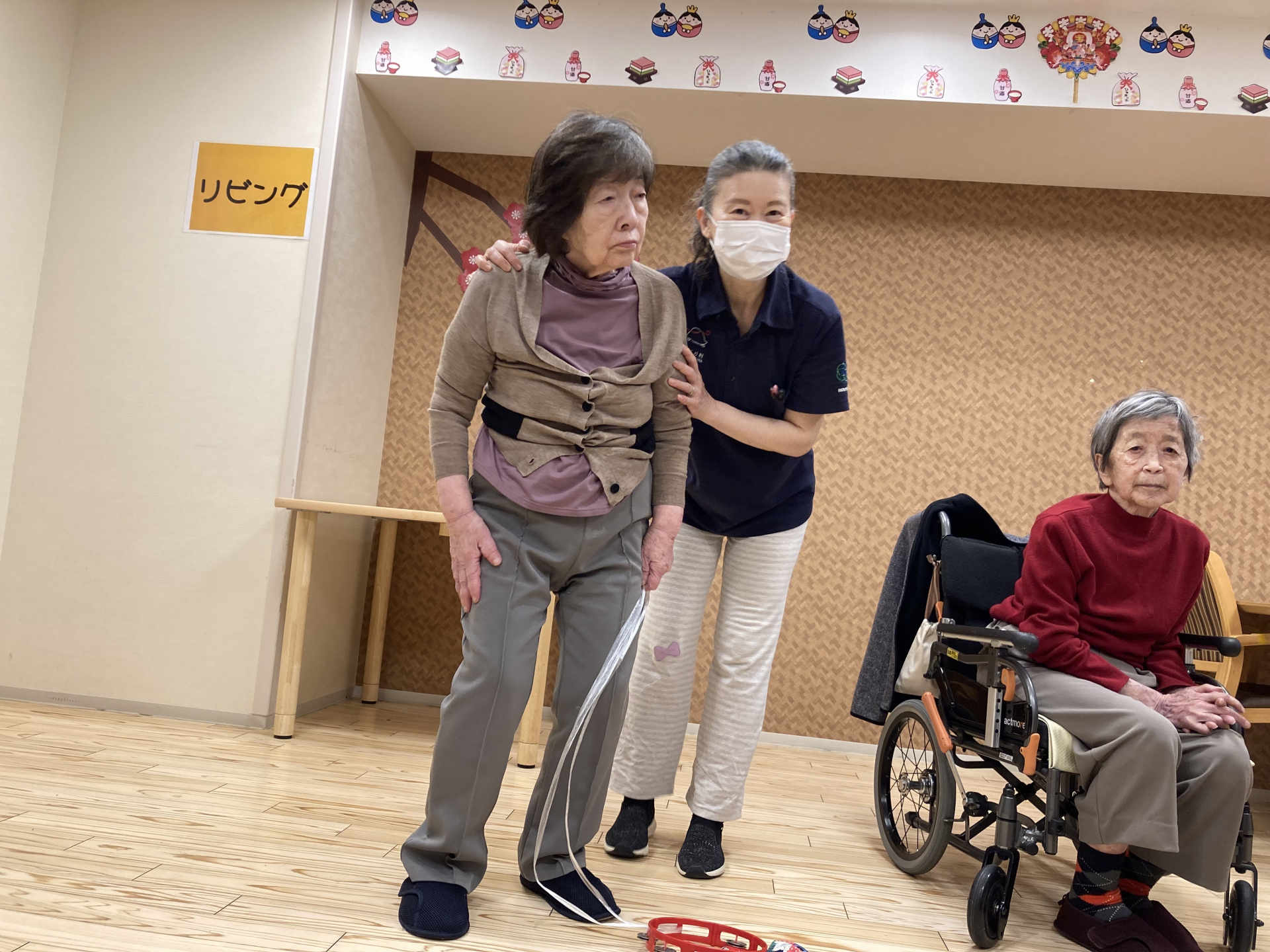 本日のレクでは、「お手玉引っ張れゲーム」を行いました。