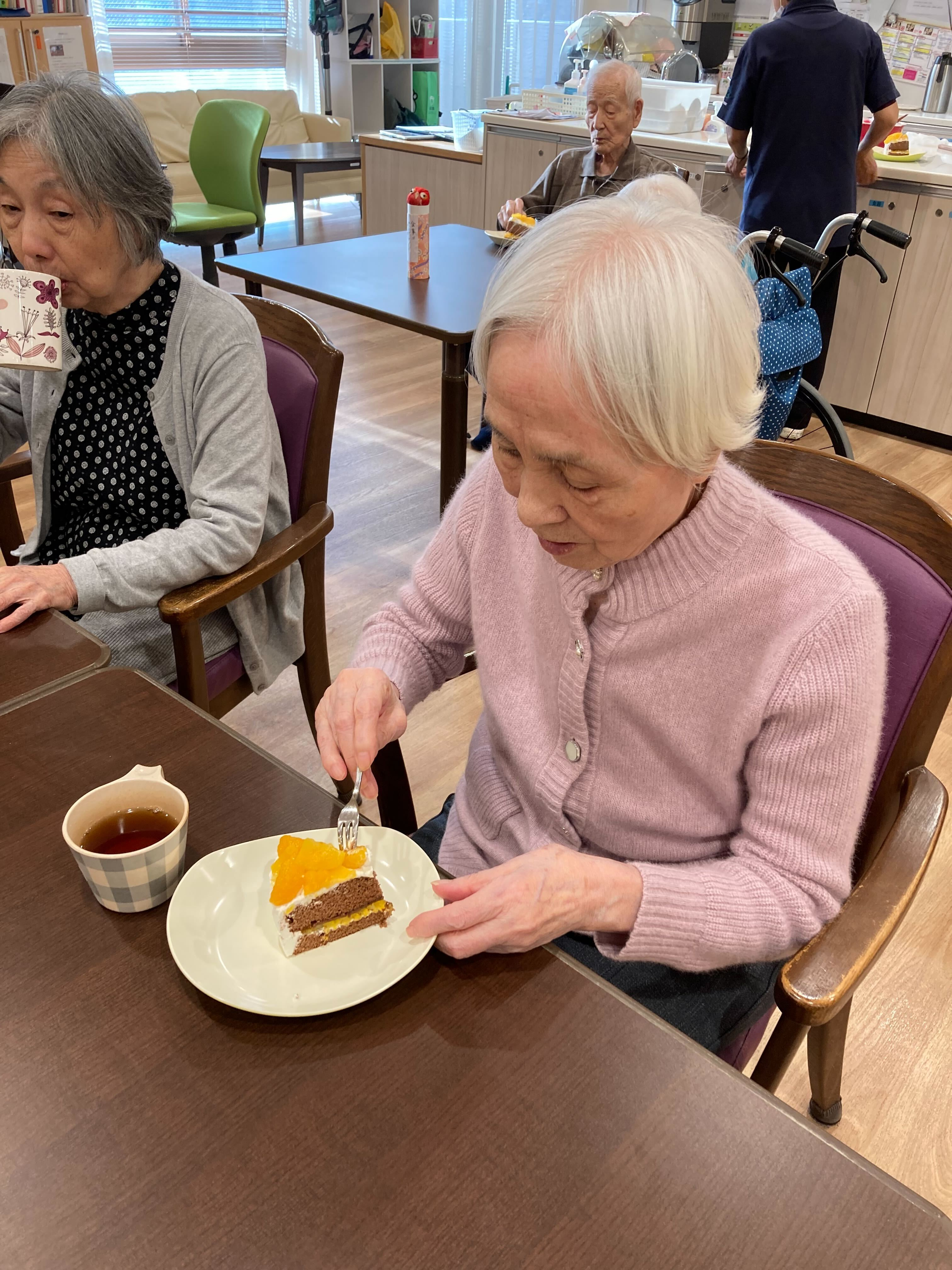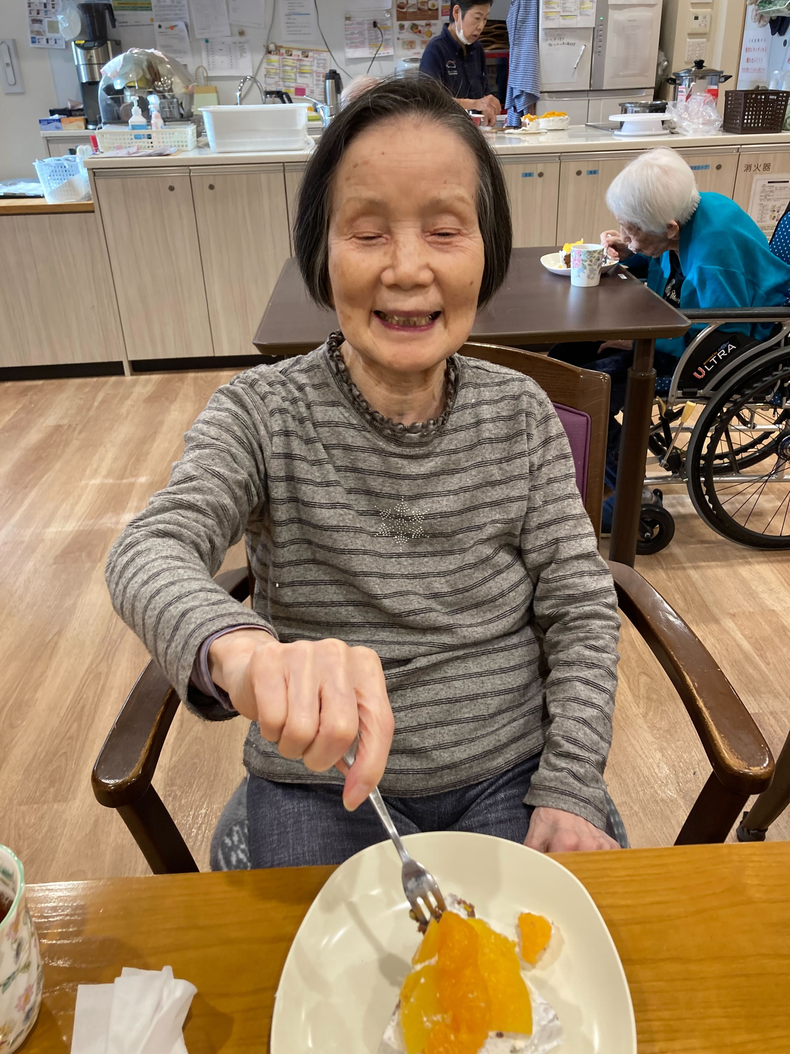 ホイップクリームを塗り 缶詰の黄桃とミカンを飾りました(^^)/