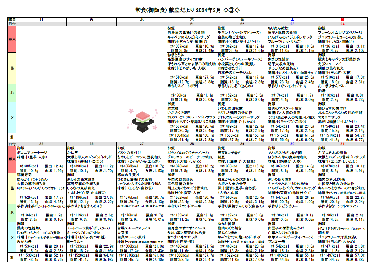 2024.02.29 お食事 3月の献立♬ Tweet シェアする こちらが3月の献立になります♪ 優っくり村下馬 杉原 前の記事 2024.03.01 お食事 幼稚園交流(*^^)v 6丁目 次の記事 2024.02.28 お食事 まったりtime 一覧へ戻る