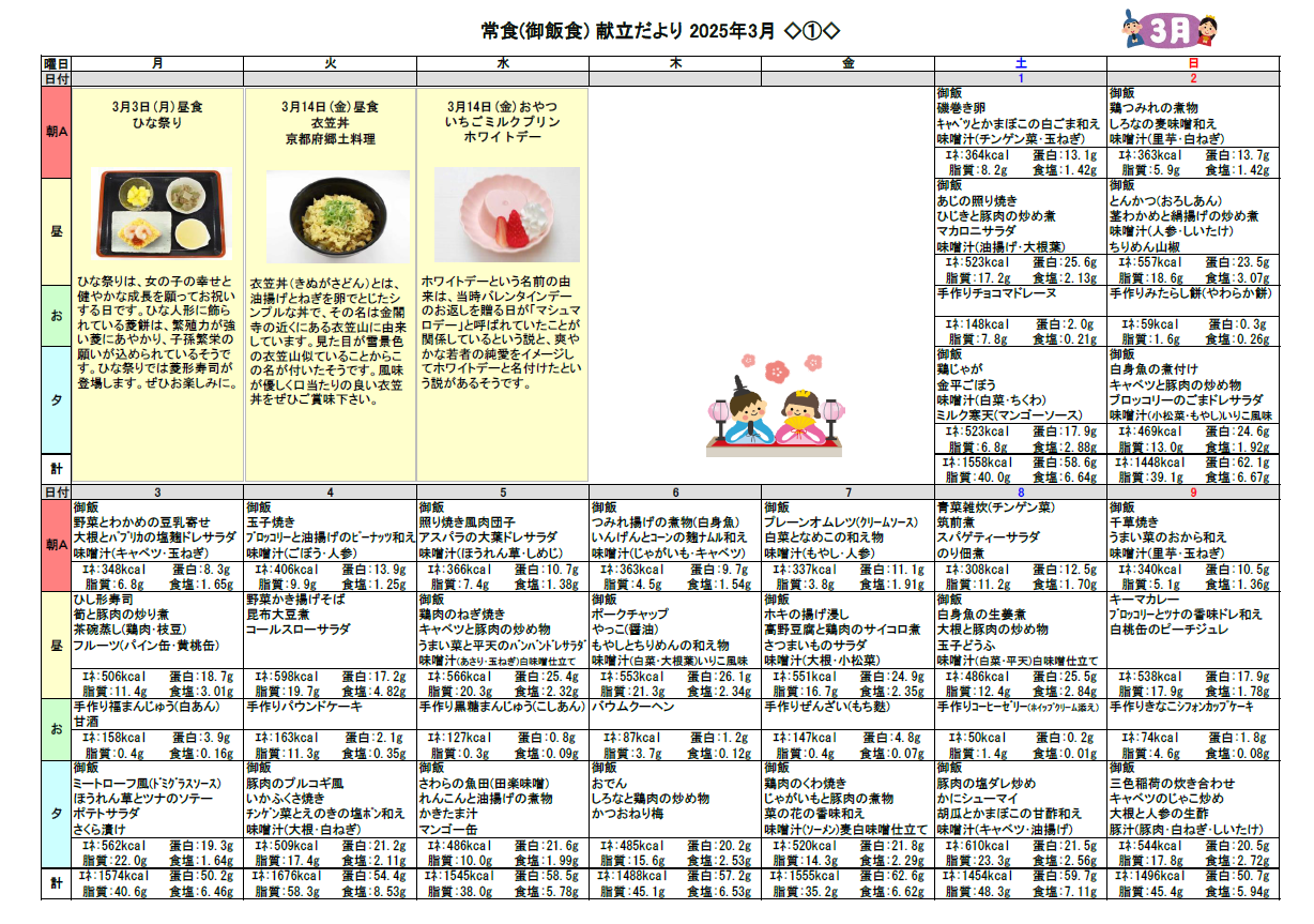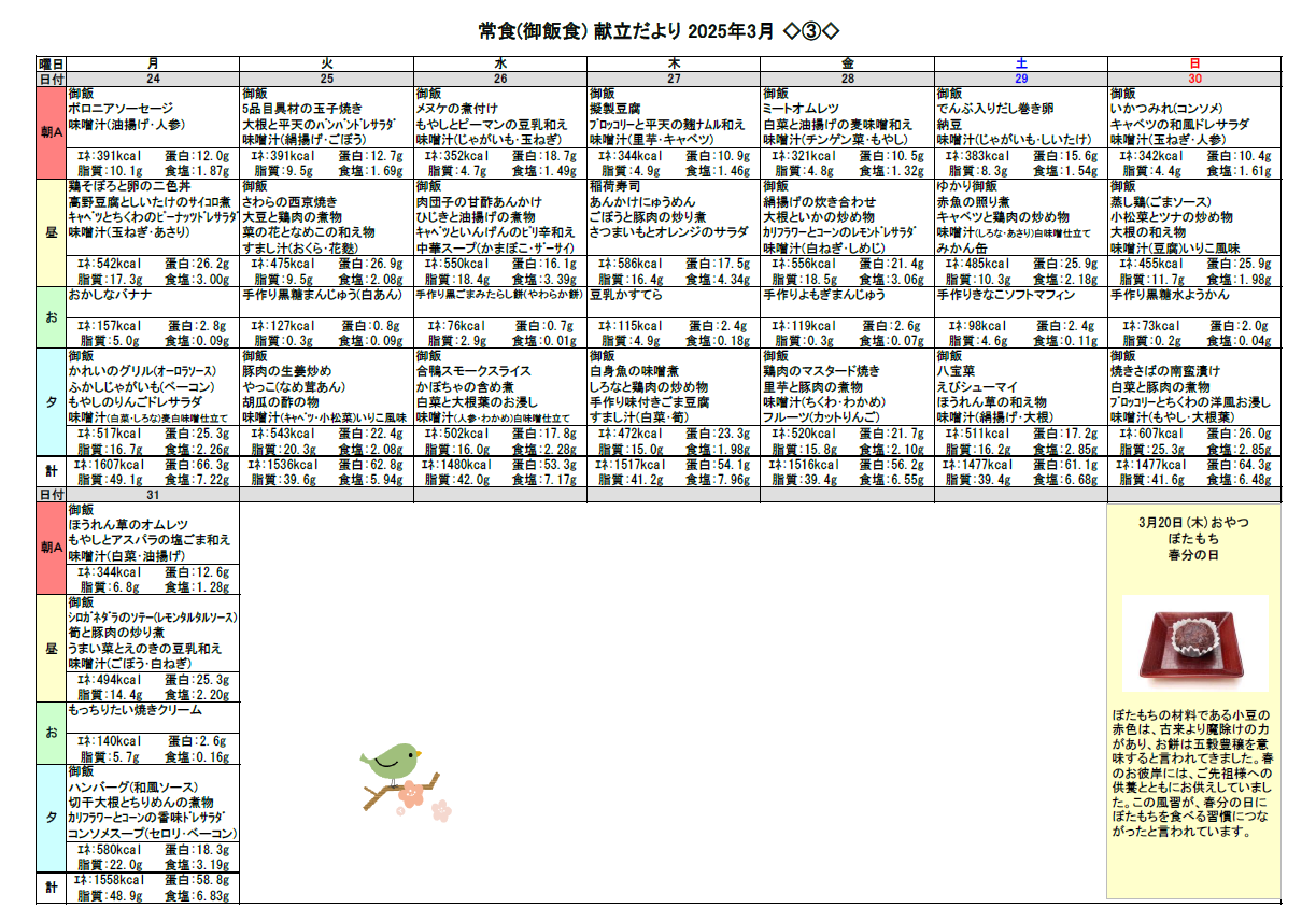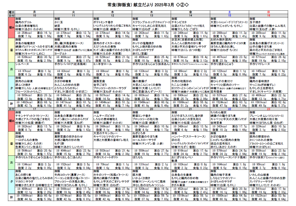 2025.02.23 お食事 3月の献立♬ Tweet シェアする 3月の献立をお伝えします☆彡 優っくり村下馬 杉原 前の記事 2025.02.24 お食事 美容レク(^^)/ 次の記事 2025.02.22 お食事 歩行訓練② 一覧へ戻る