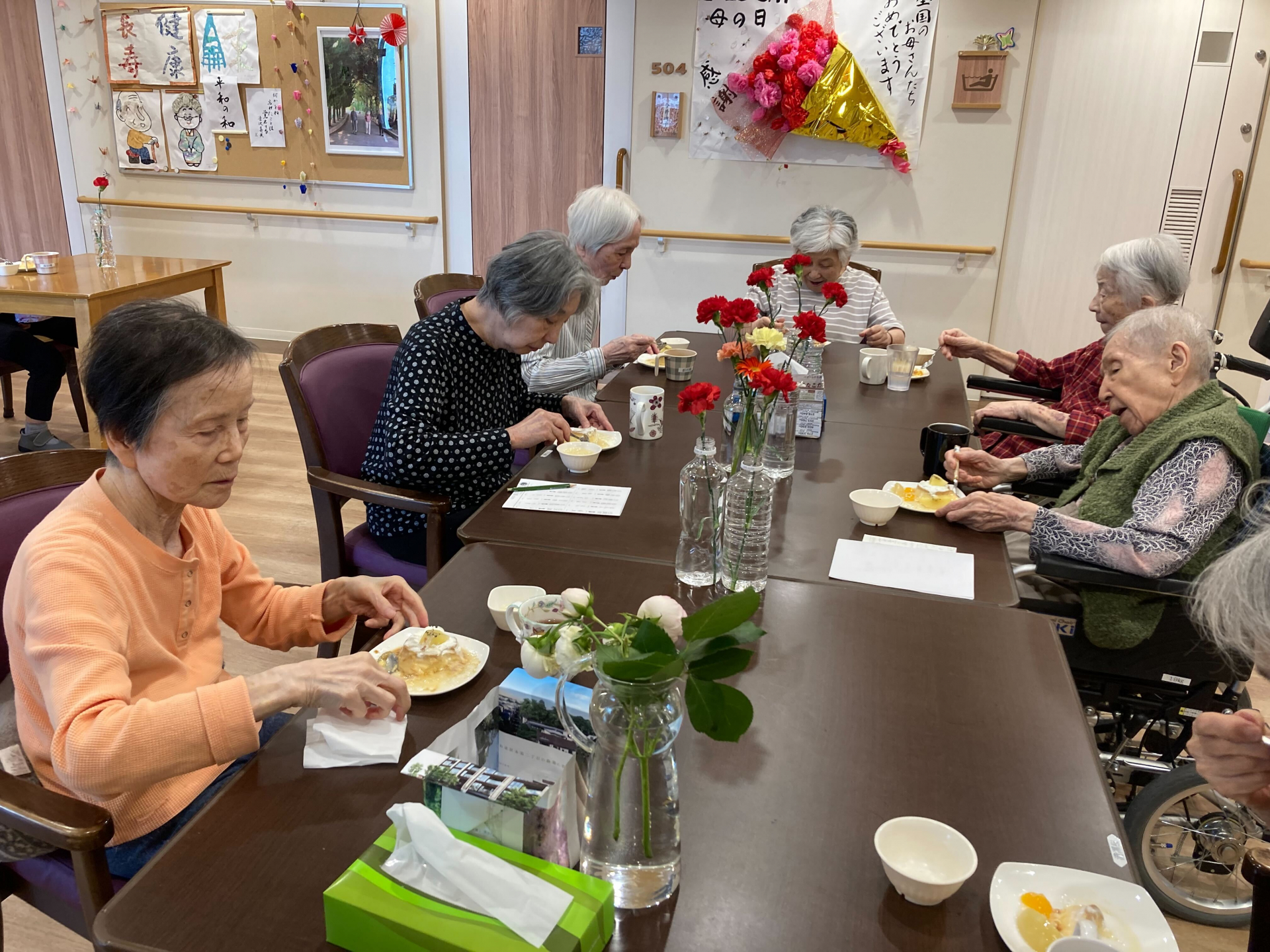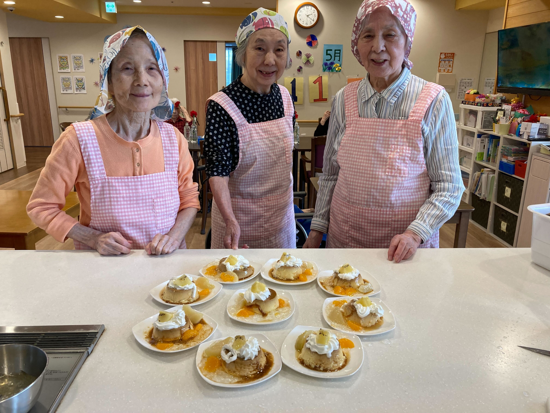 本日のおやつはプリン・アラモード皆様が一緒に作って下さいました