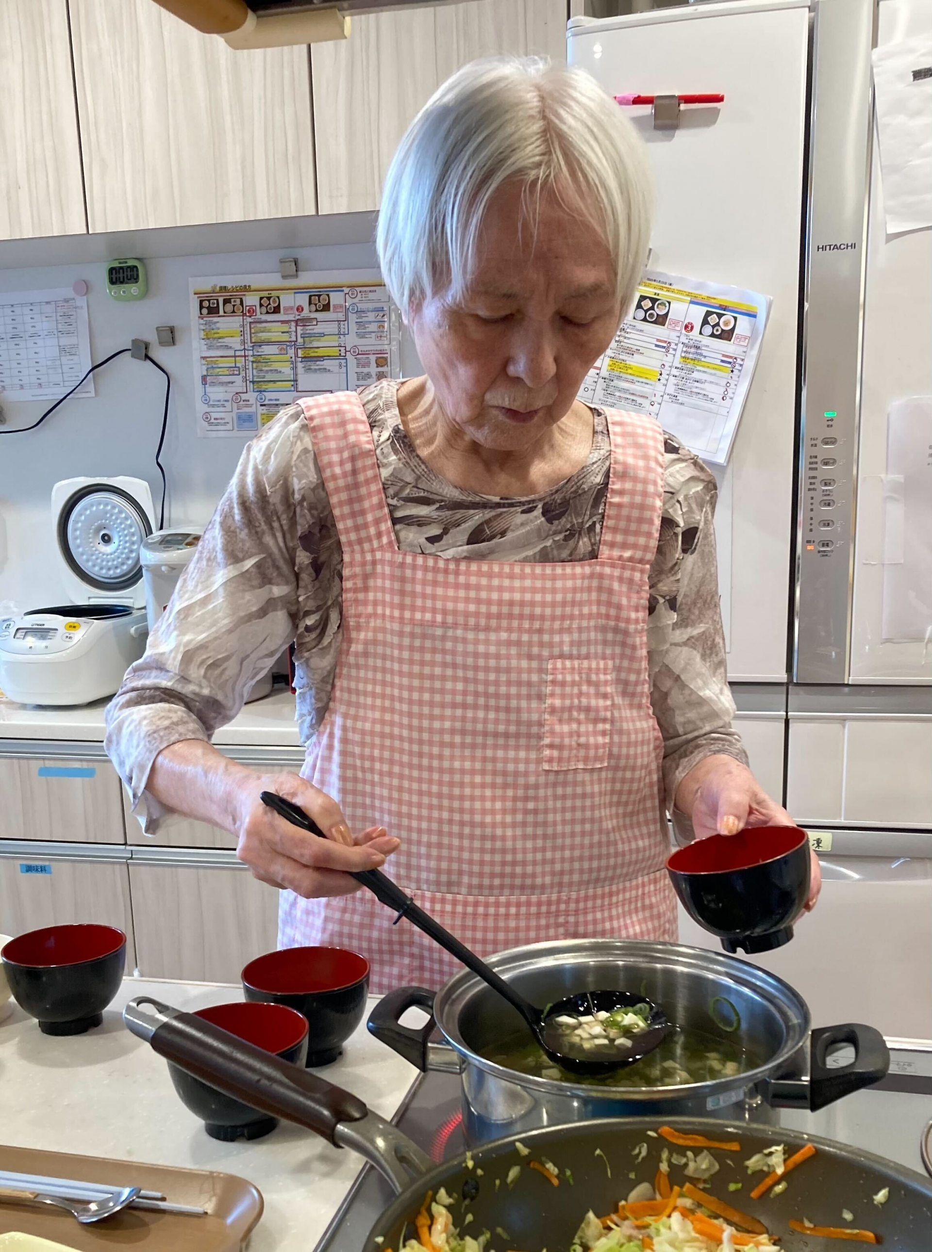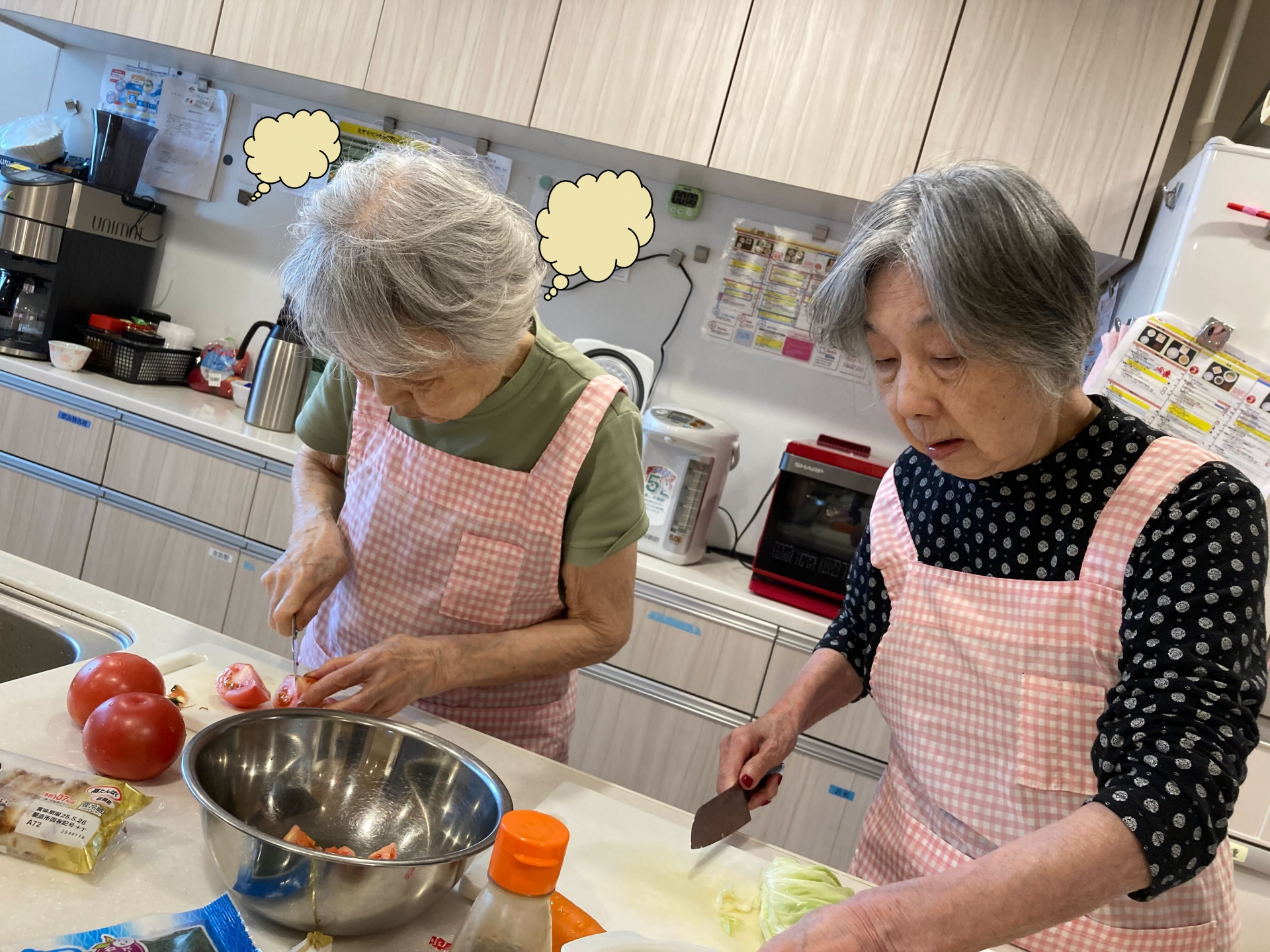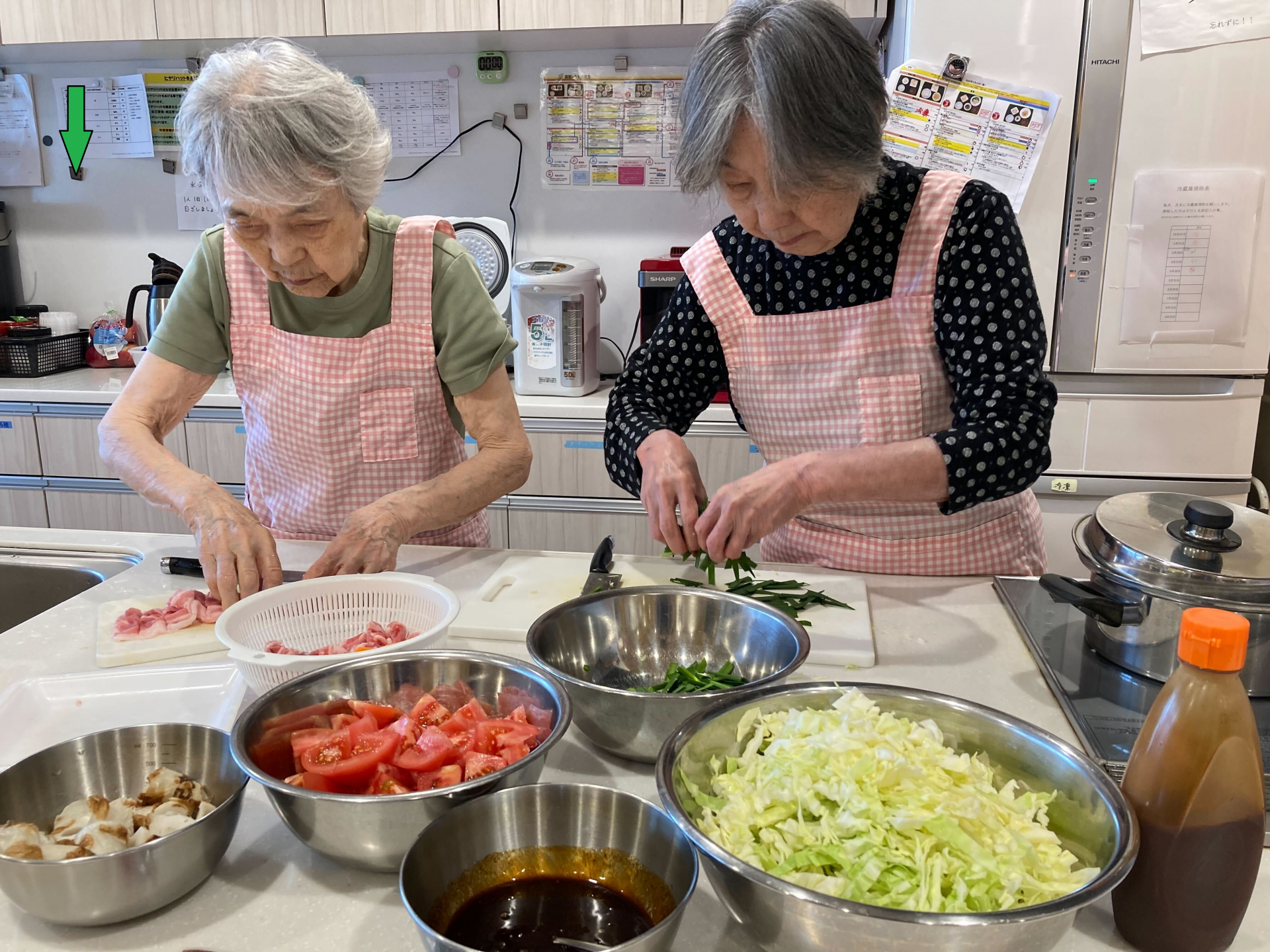 メニューはどうしても余りがちな青のりを使った竹輪の磯辺揚げとトマトのマリネ、お吸い物です。皆さんに材料を刻んで頂いたり、お吸い物や焼きそばをよそって頂きましたー(^∇^)
