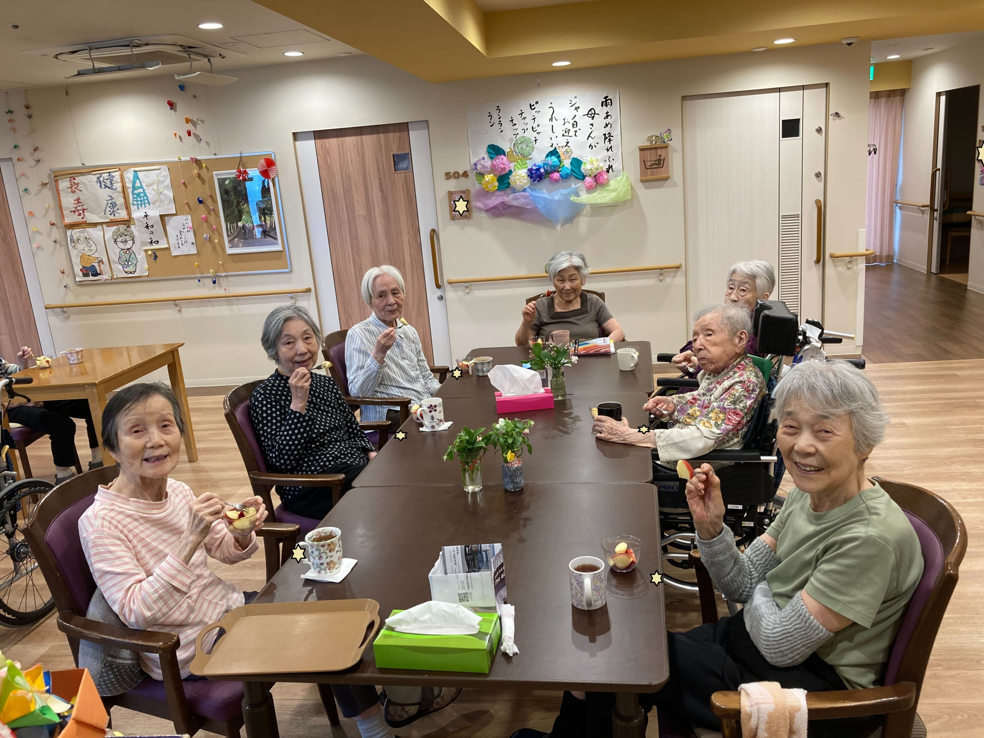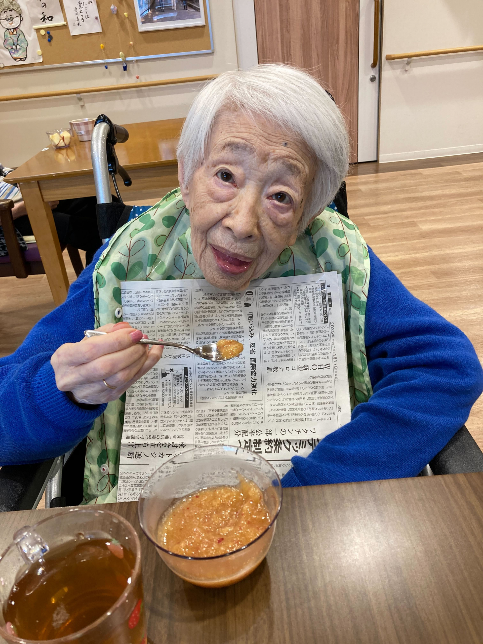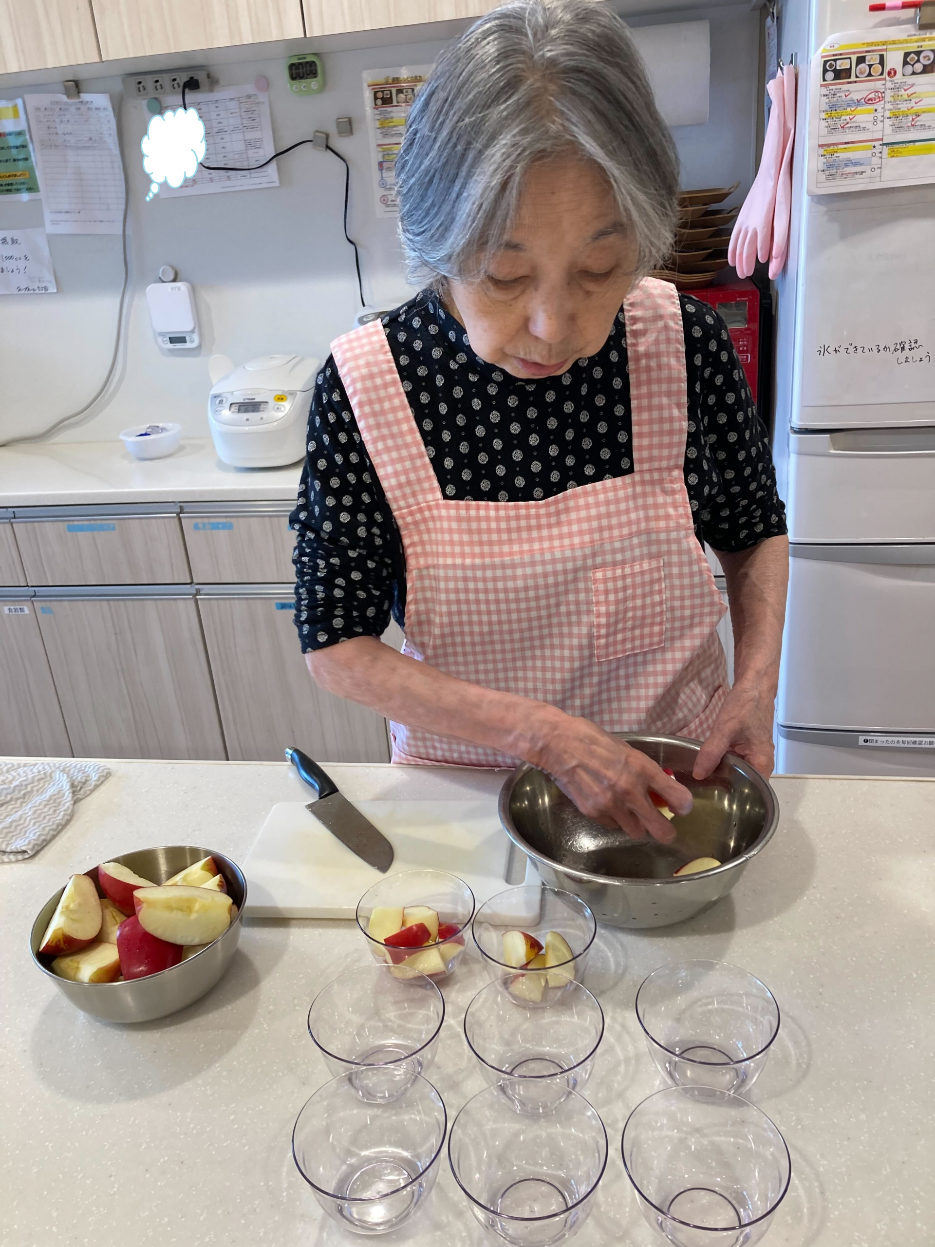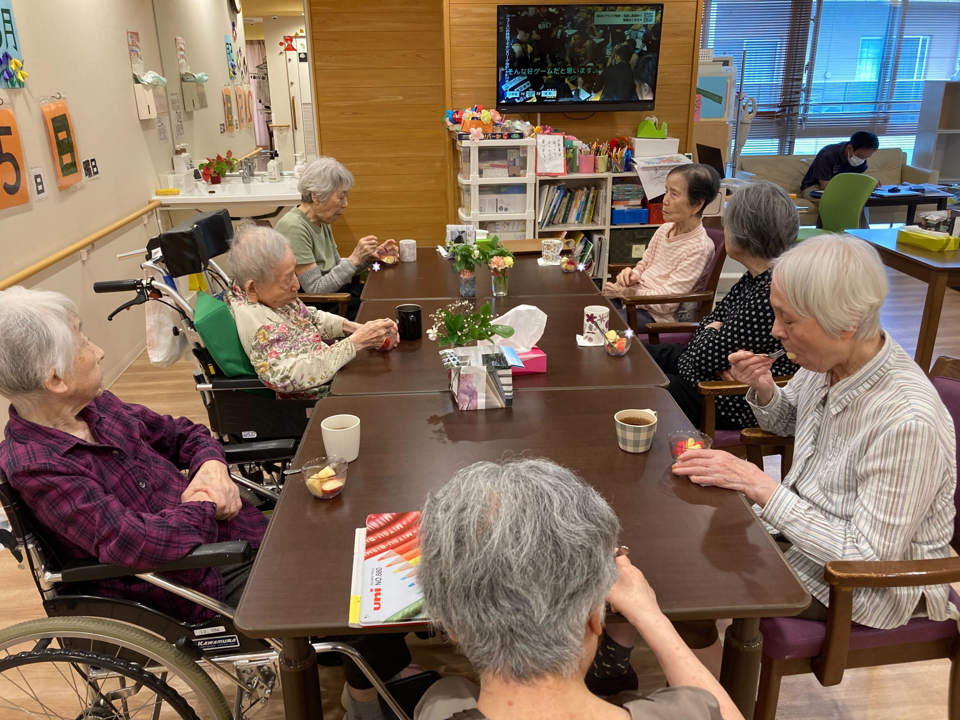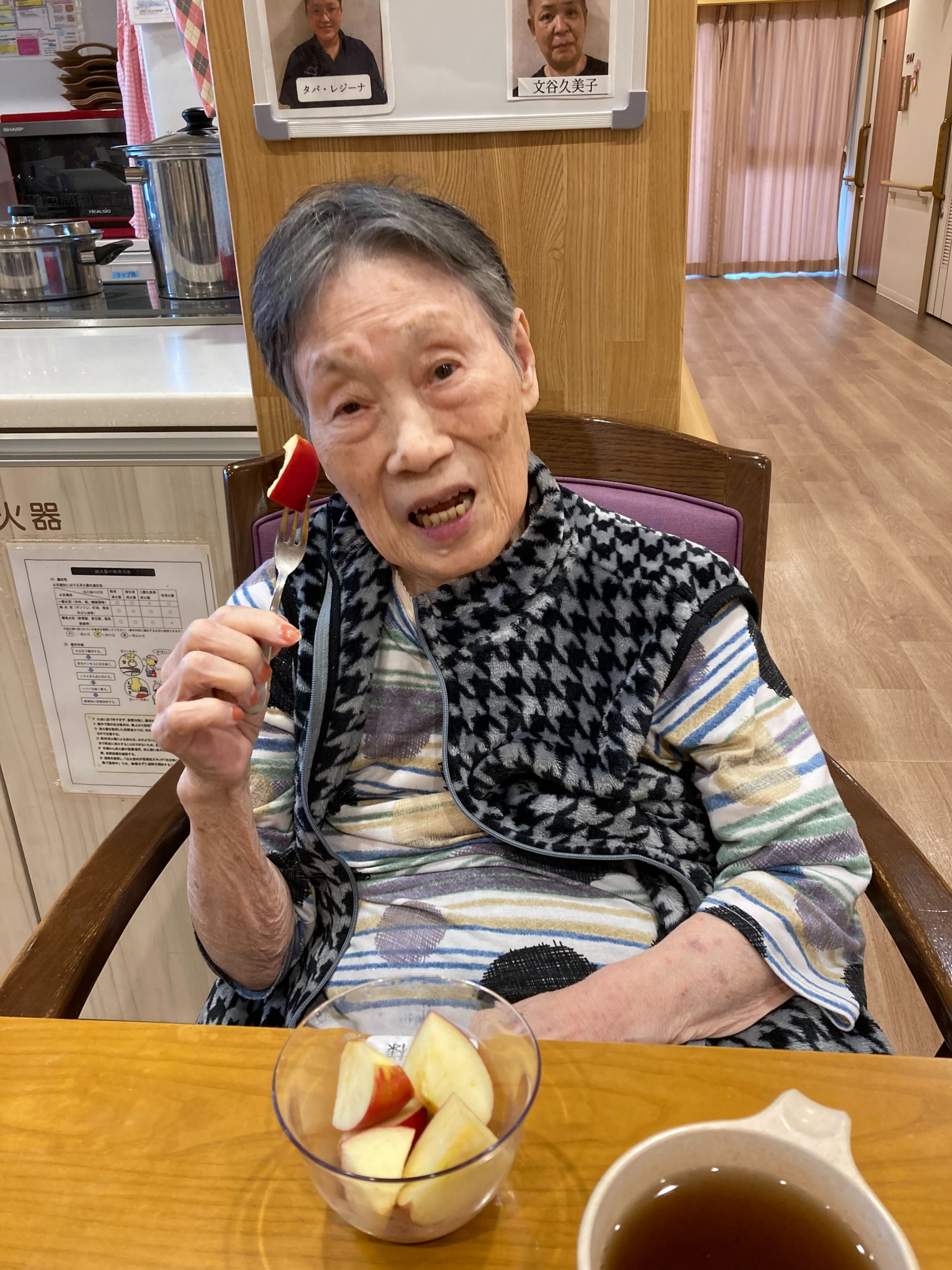 本日のおやつにニュージーランド産のリンゴを召し上がられました。皆さまと相談した結果、「リンゴは皮をむかないほうが栄養を多く摂れる」という話になり、その通りに皮をむかずにお出ししました😋リンゴを切るのは、料理が大好きなN様にお願いしました(^_-)-☆