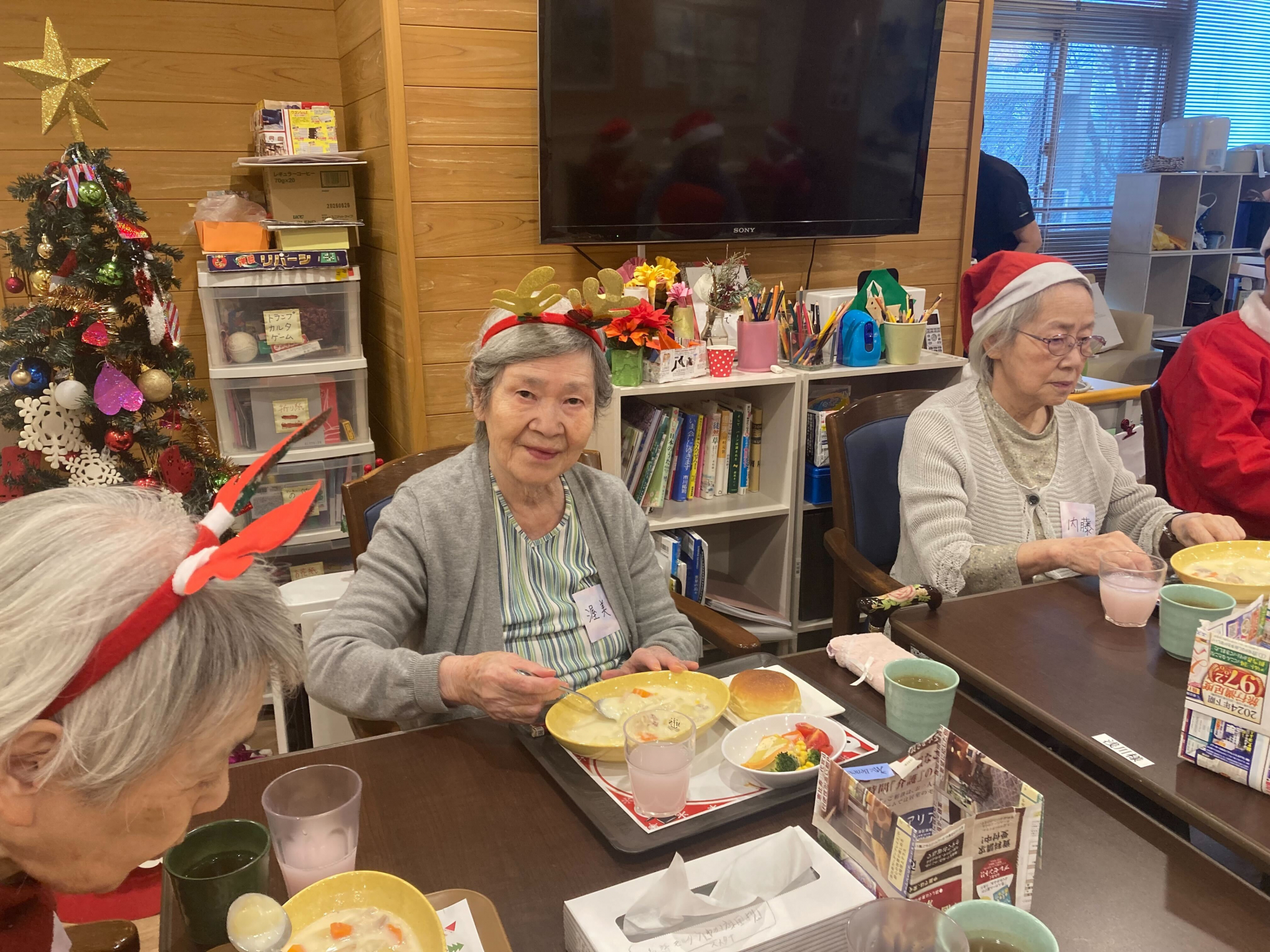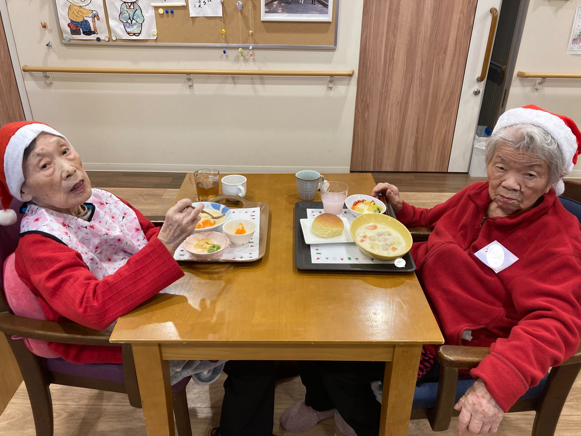 食事の時間には、「おいしいね」「あたたまるね」といった声も聞かれ、皆様終始笑顔で、和やかなひとときを過ごされていました。利用者様同士の交流も深まり、心温まるクリスマス会となりました(^^♪