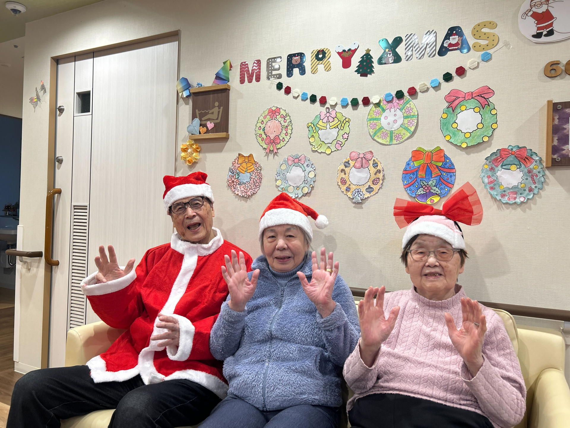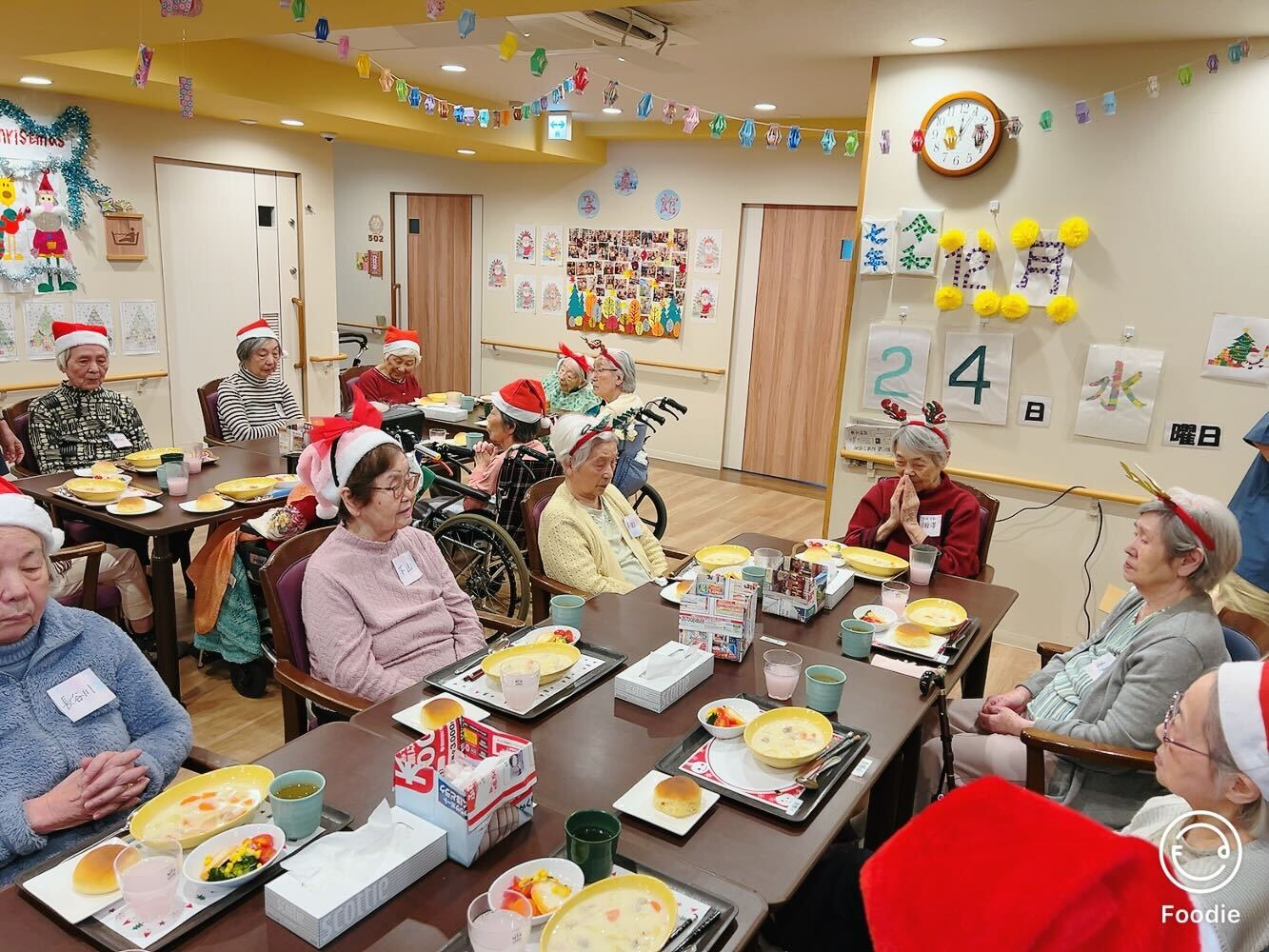 12月24日、5丁目ユニットと6丁目ユニット合同でクリスマス会を開催しました!今回は、5丁目ユニットに全ご利用者様が集まり、にぎやかで温かい雰囲気の中で行われました☆彡