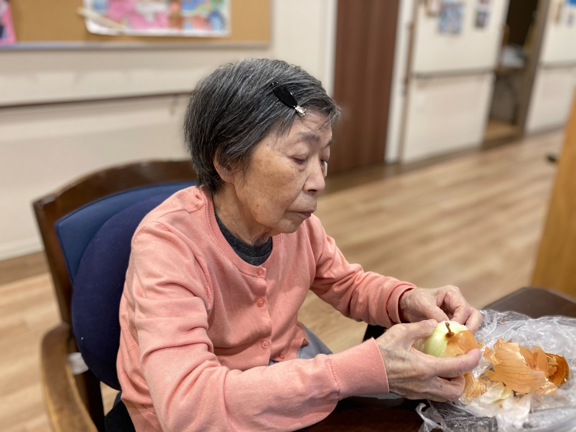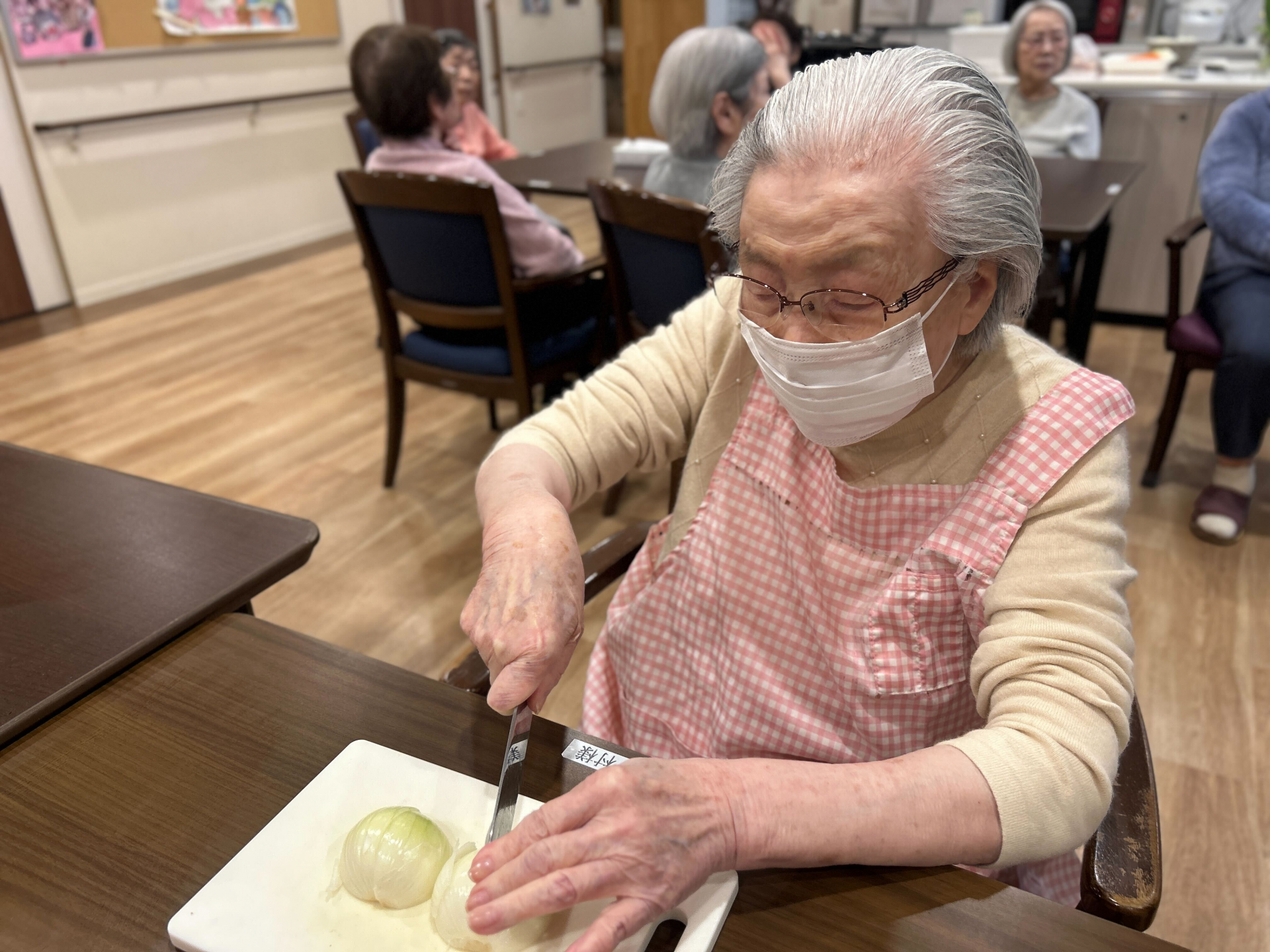 当日の昼食は、シチュー、ゆで野菜サラダ、サーモンのテリーヌ、手作りパン、カルピスをご用意しました。シチュー作りには、主に6丁目ユニットのご利用者様にお手伝いいただき、野菜を切ったり、たまねぎの皮をむいたり、具材を炒めたりと、それぞれ出来る作業に積極的に参加してくださいました♬