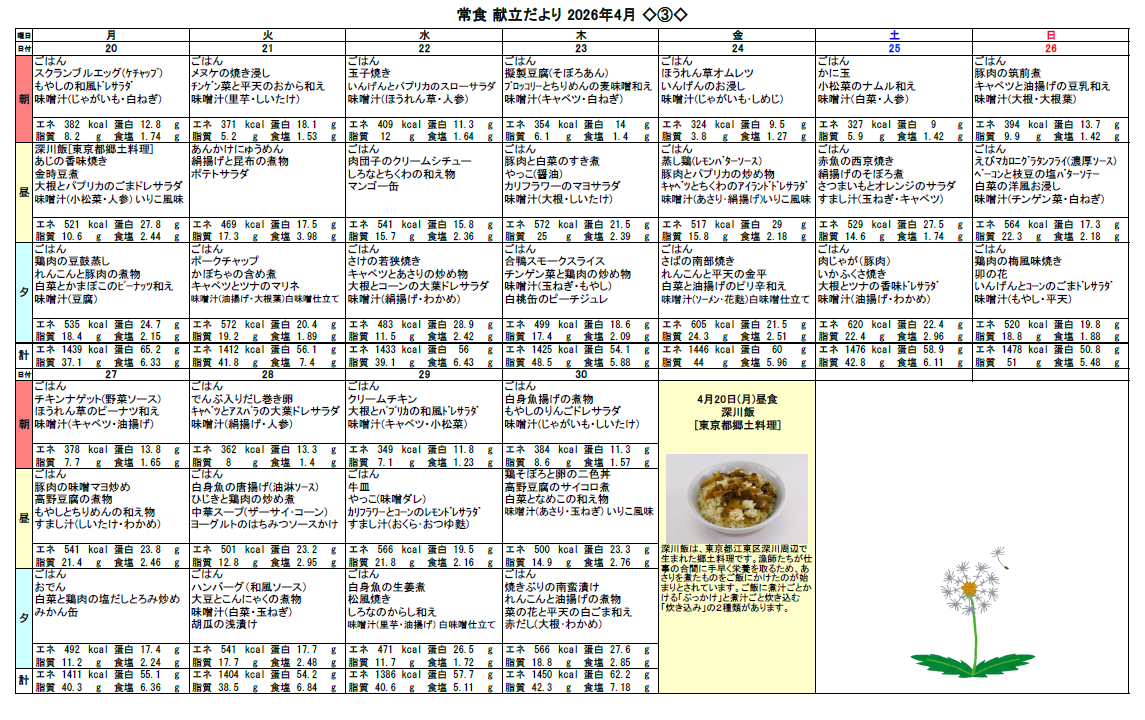 2026.03.28 お食事 4月の献立♬ Tweet シェアする 4月の献立をお伝えします☆彡 優っくり村下馬 杉原 前の記事 2026.03.29 お食事 昭和小学校の皆様、ありがとうございました! 次の記事 2026.03.27 お食事 【グループホームの雰囲気】お花見♬ 一覧へ戻る