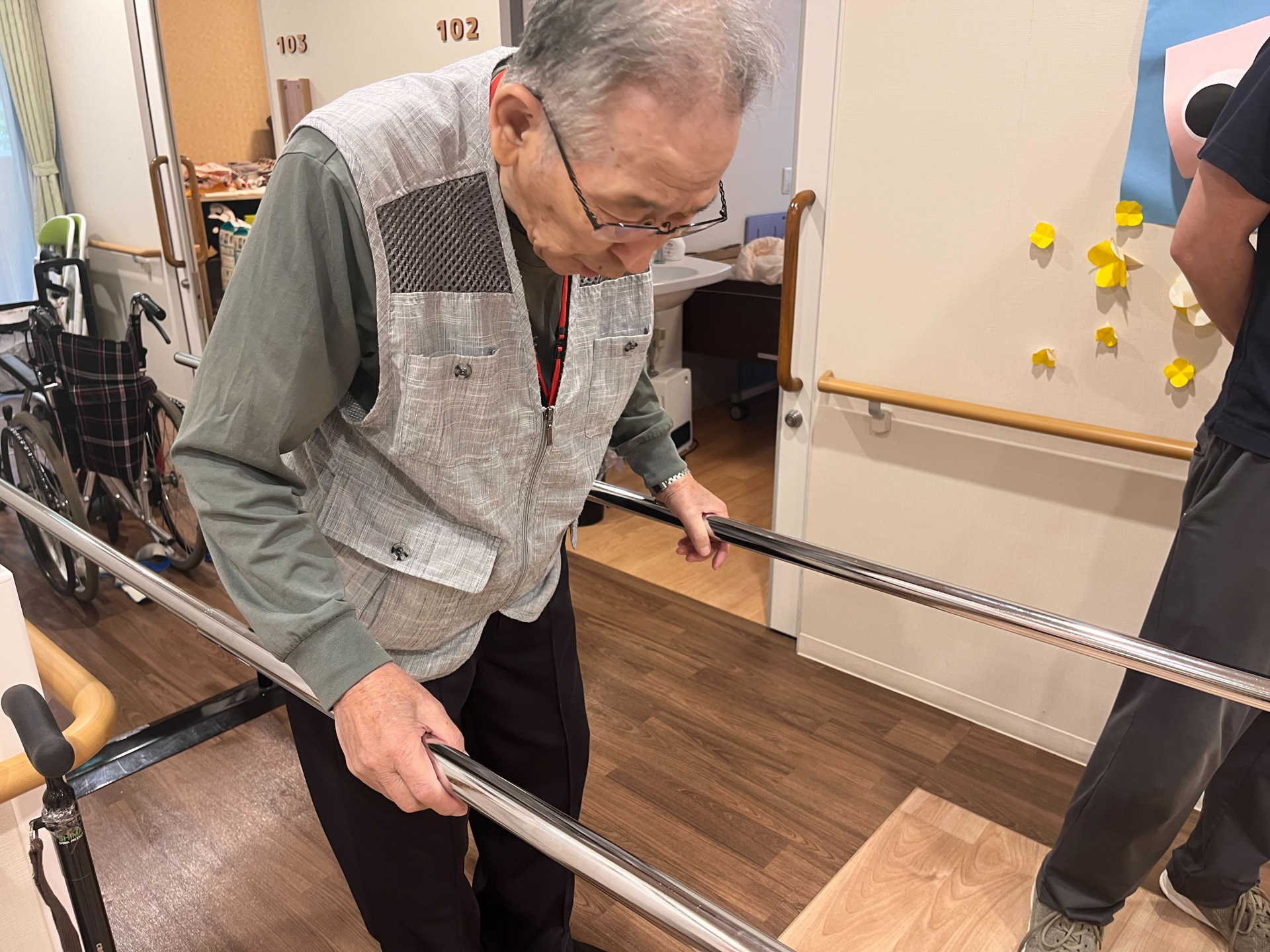平行棒を使って、自分の脚力で歩行する練習を行っています。