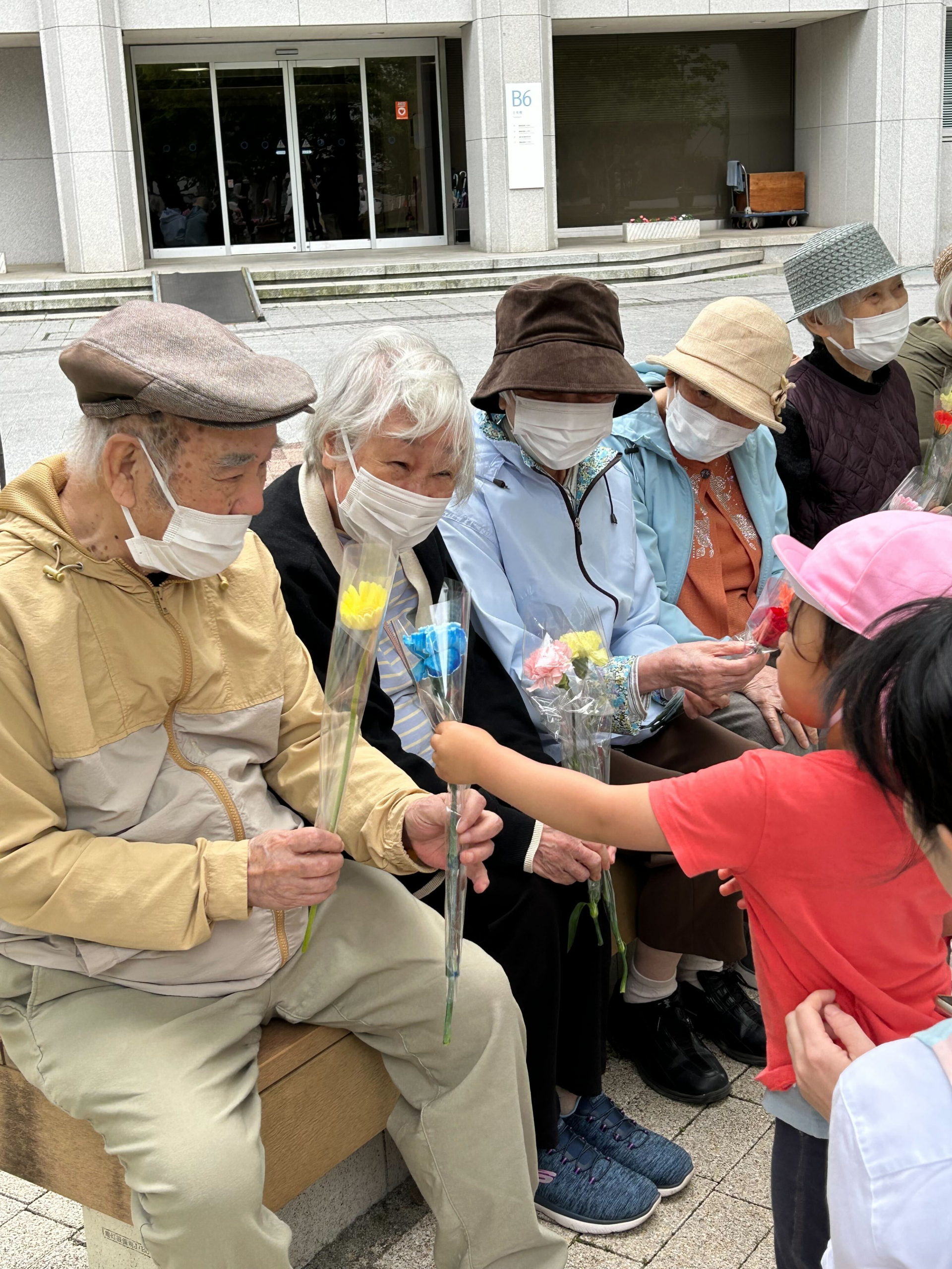 園児と手をつなぎながら、敷地内の公園、池へ散歩をしました。池には立派な鯉が泳いでおり、園児、利用者みんなで手をたたいて、鯉を呼び寄せていました。最後に園児がこの日の為に買ってきたお花をもらい、無事交流は終了しました。