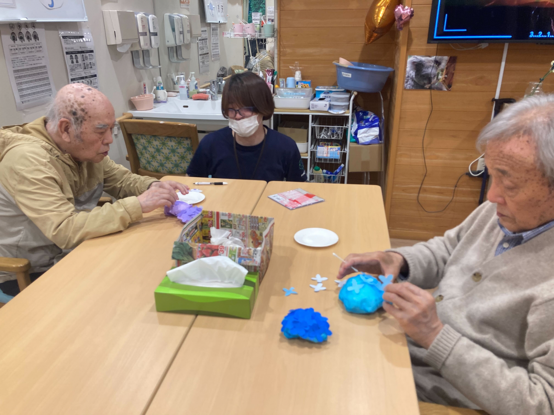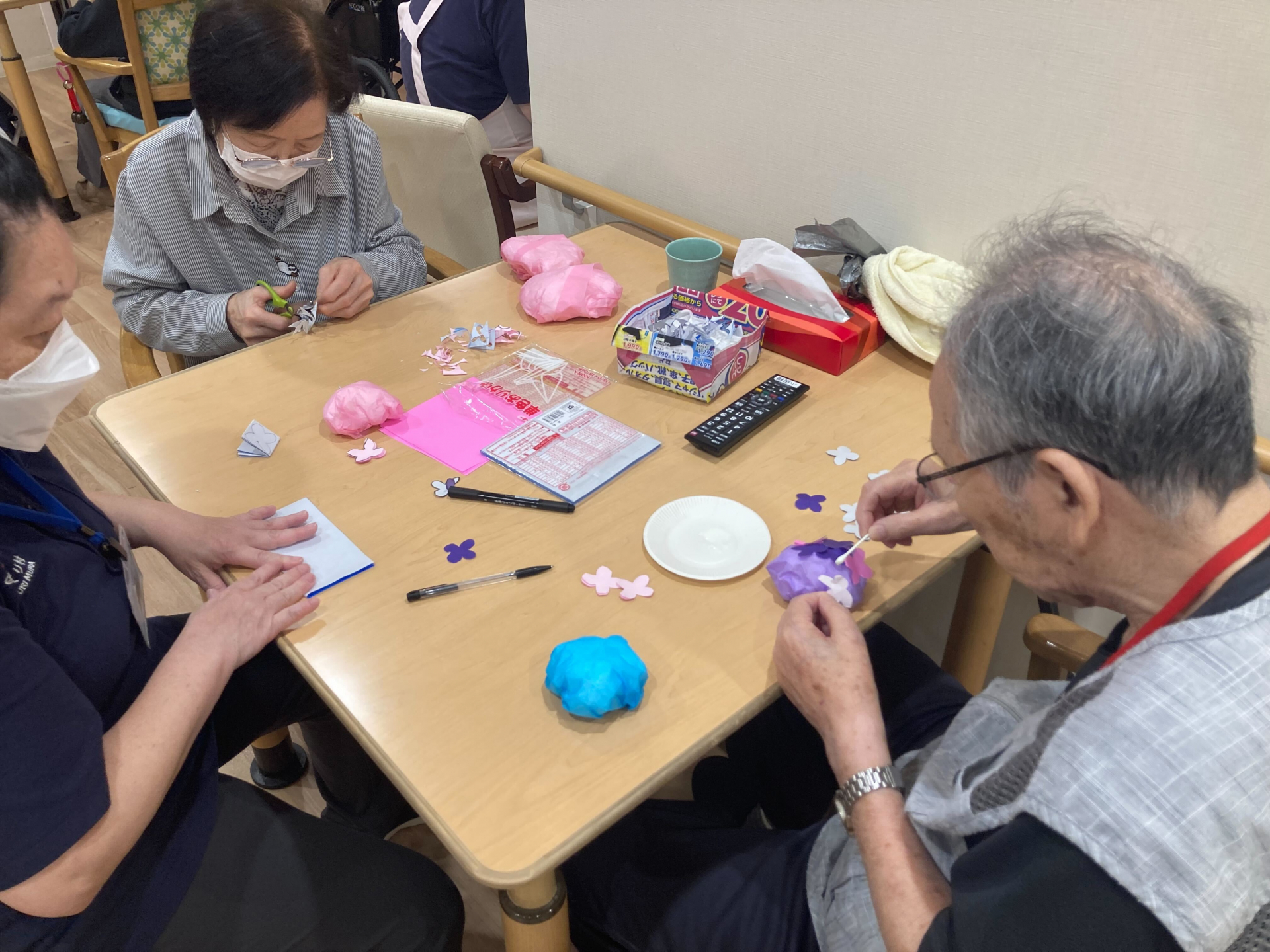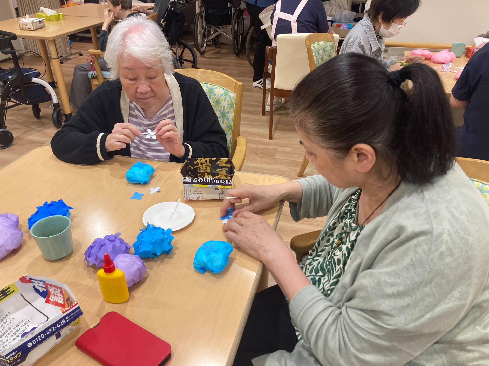 今回は、紫陽花の花の飾りを皆で作成している様子をお届けいたします。