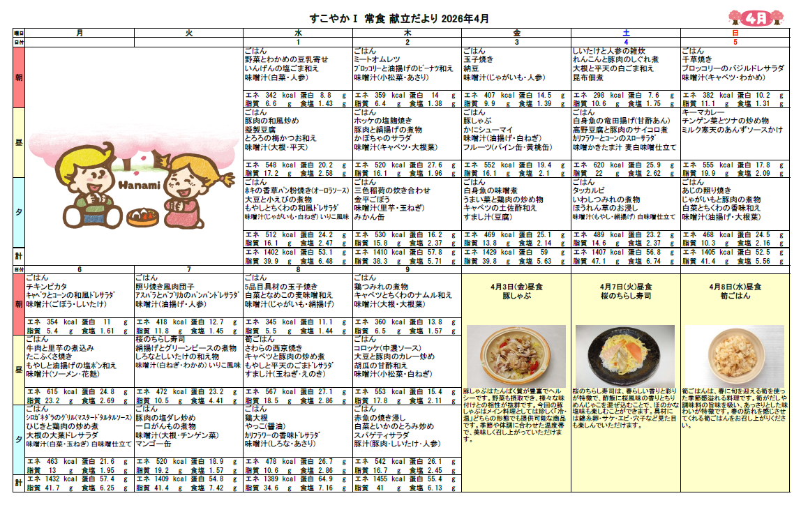 2026.04.01 お食事 4月の献立♬ Tweet シェアする 4月の献立をお伝えします☆彡 優っくり村下馬 杉原 前の記事 2026.04.04 お食事 【体操】今日の体操ᕦ(ò_óˇ)ᕤ 次の記事 2026.03.29 お食事 【地域交流】団地の桜まつり 一覧へ戻る