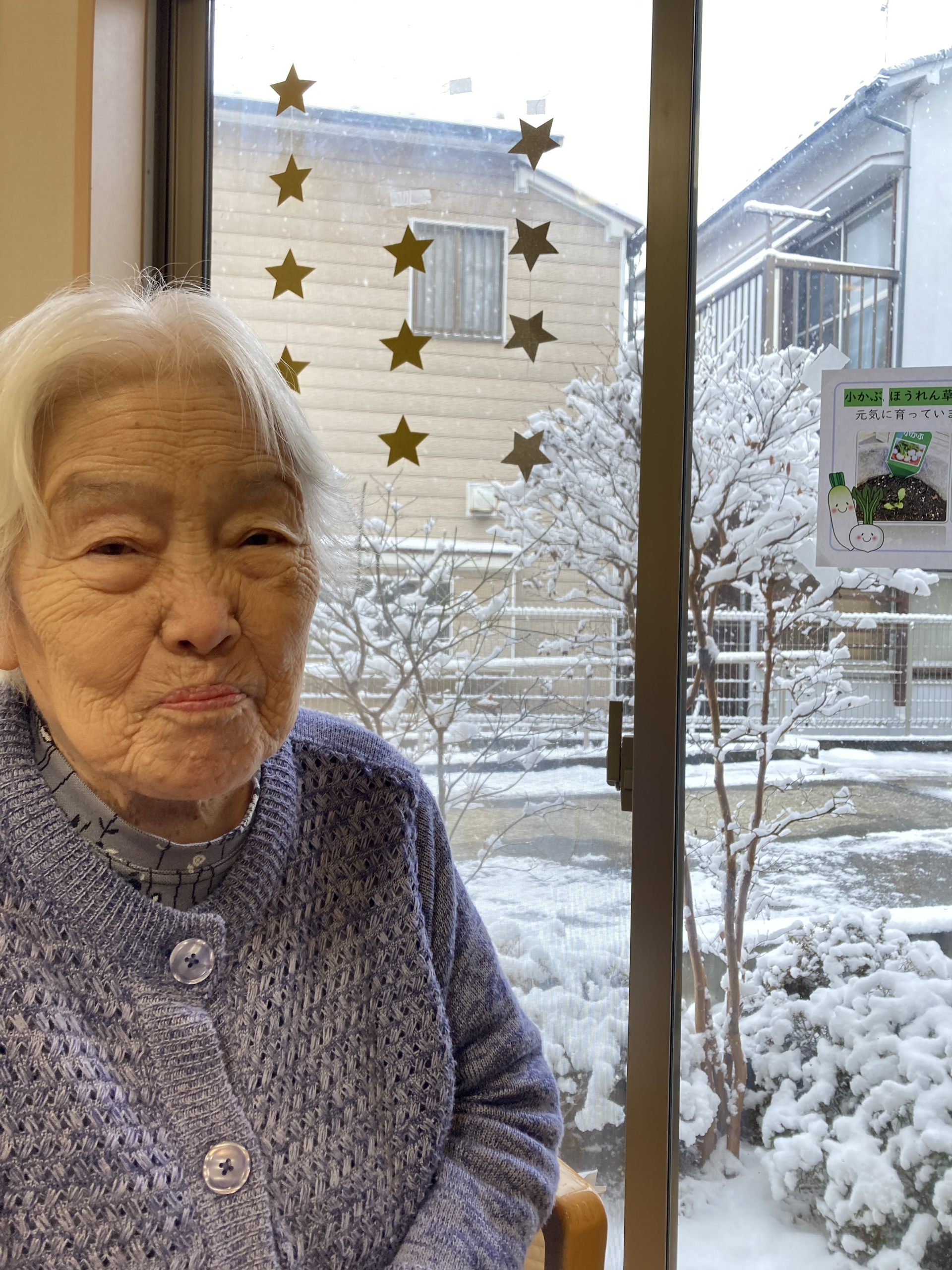 窓の外に広がる白い雪景色に、「きれいね」「懐かしいわね」と自然と会話が弾み、皆さまの表情もいつも以上にやわらいでいました。