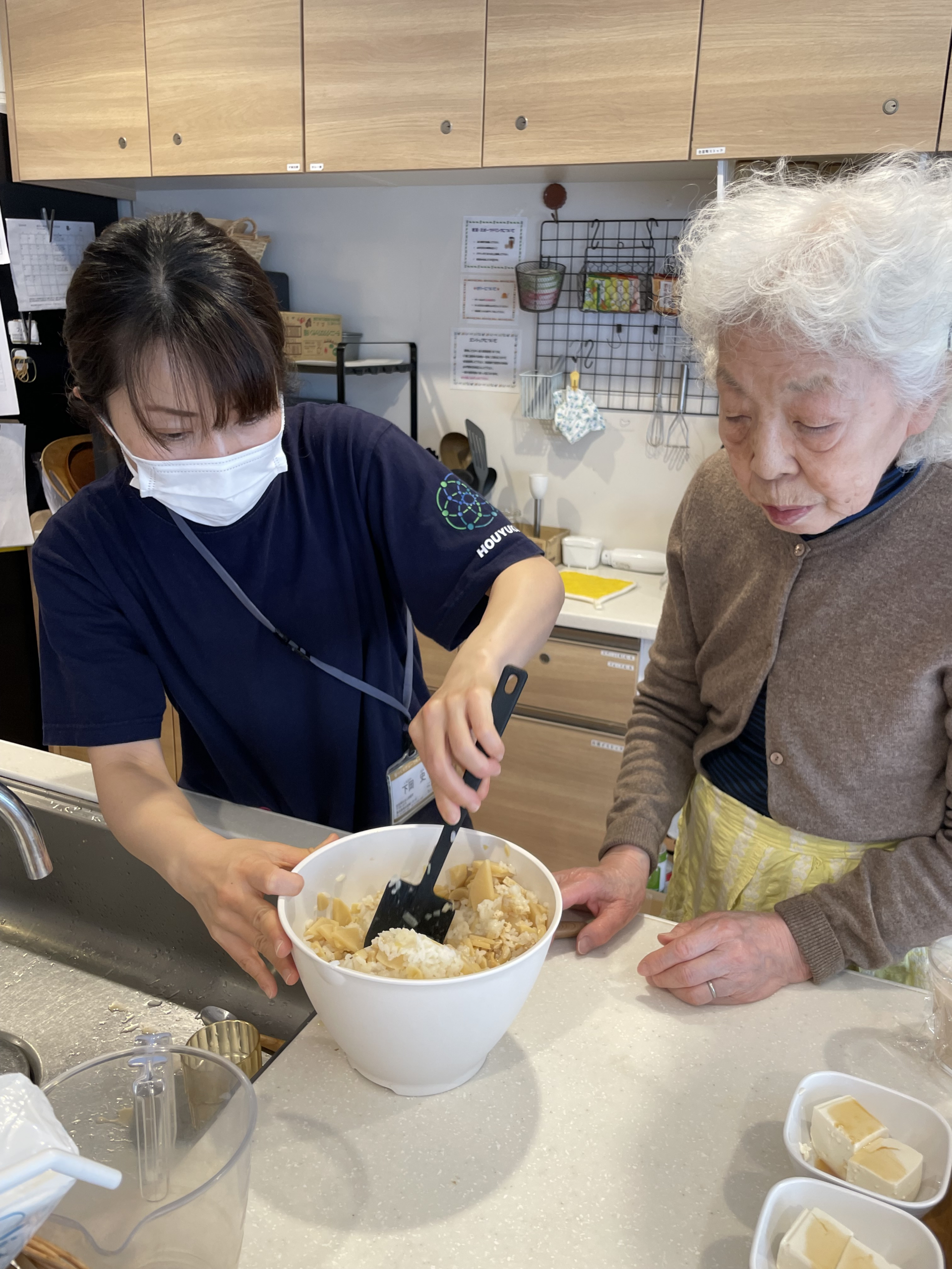 S職員とT様の腕で美味しいたけのこご飯出来上がりました。