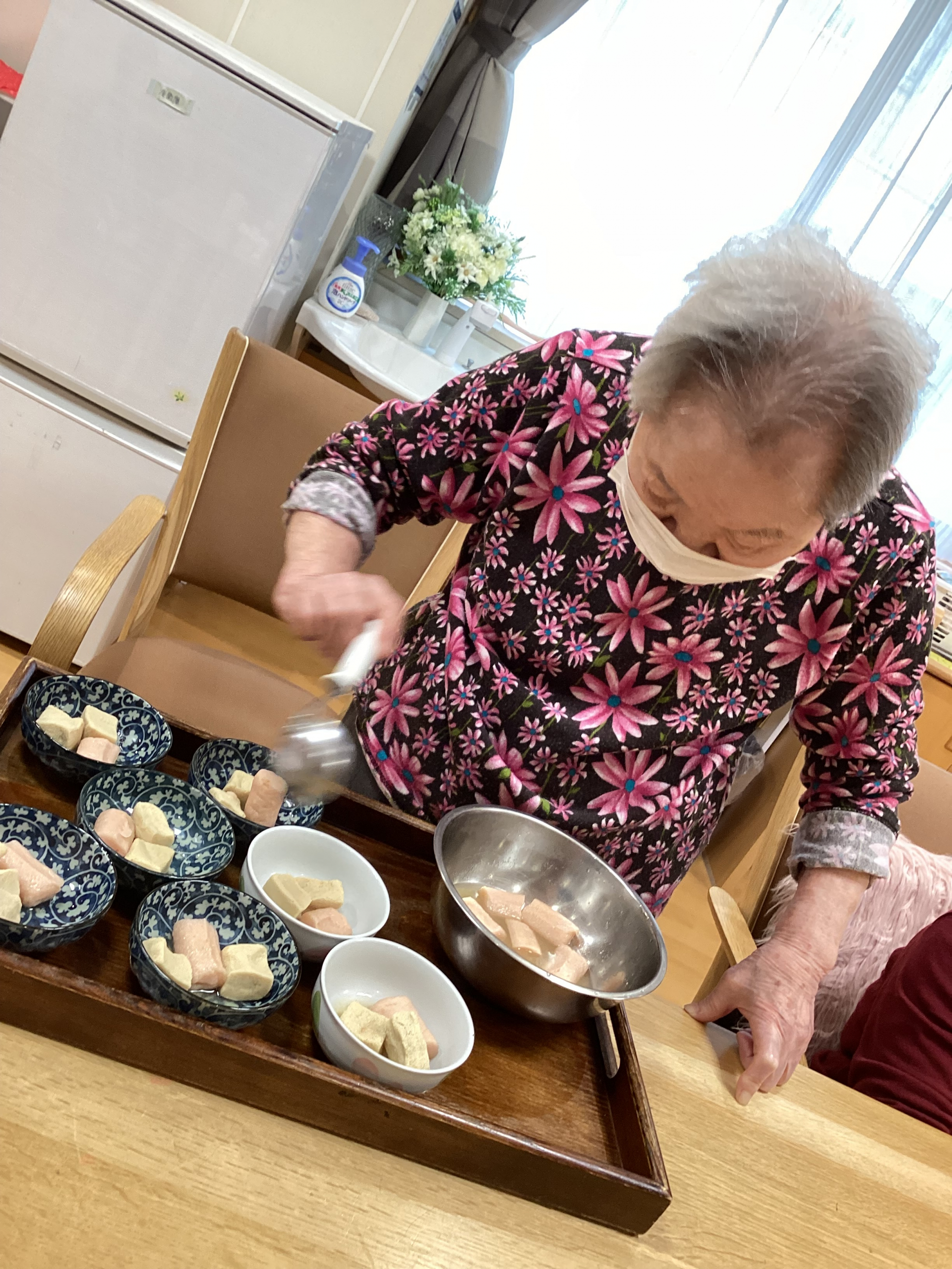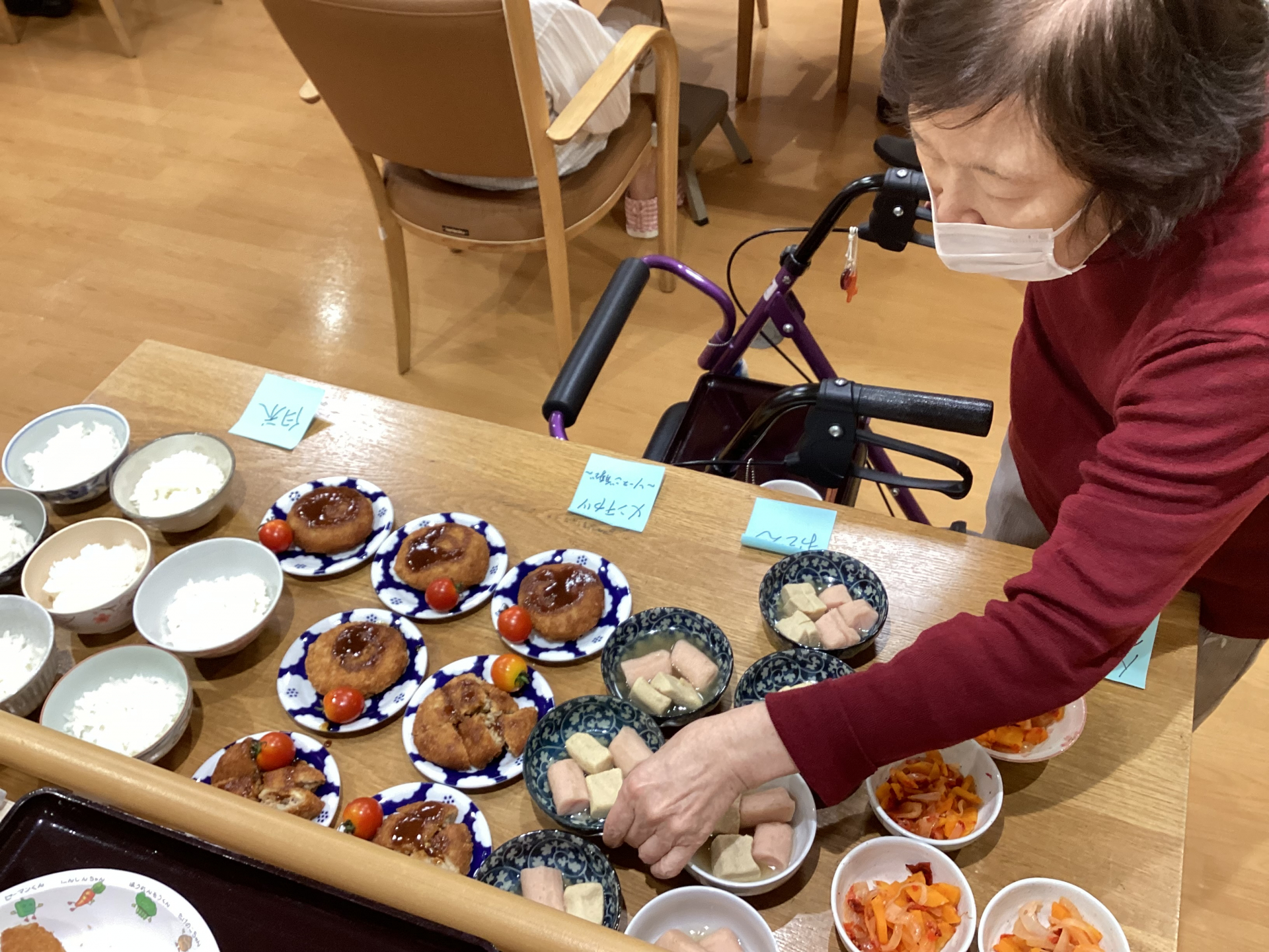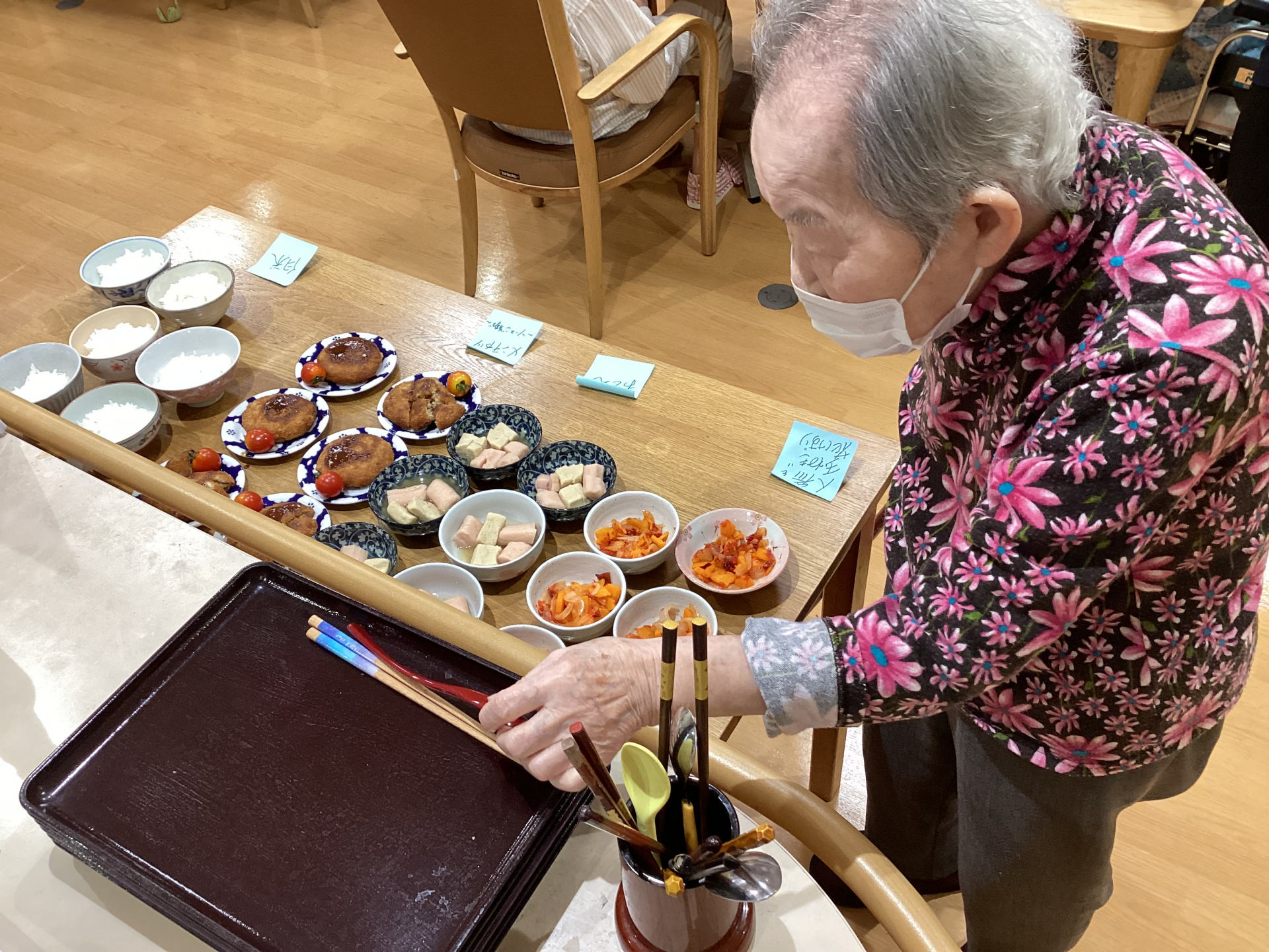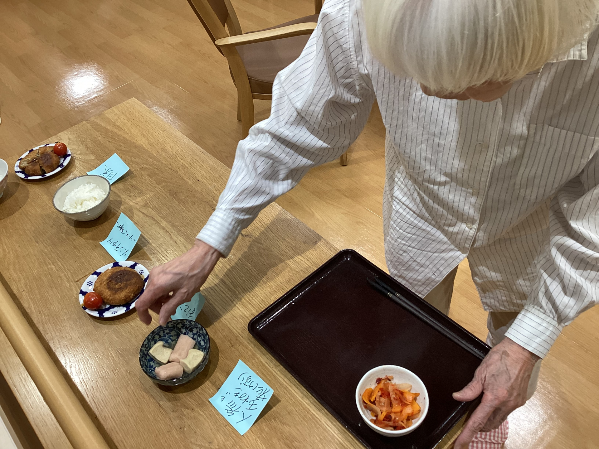 つばめの里では、高齢の皆様が自分でできることを尊重しながら日々の生活をサポートすることが大切なことで今回は、高齢者の方々が自分で食事を選び、取ることができるようにする工夫と安全で美しく食べ物の配置です。