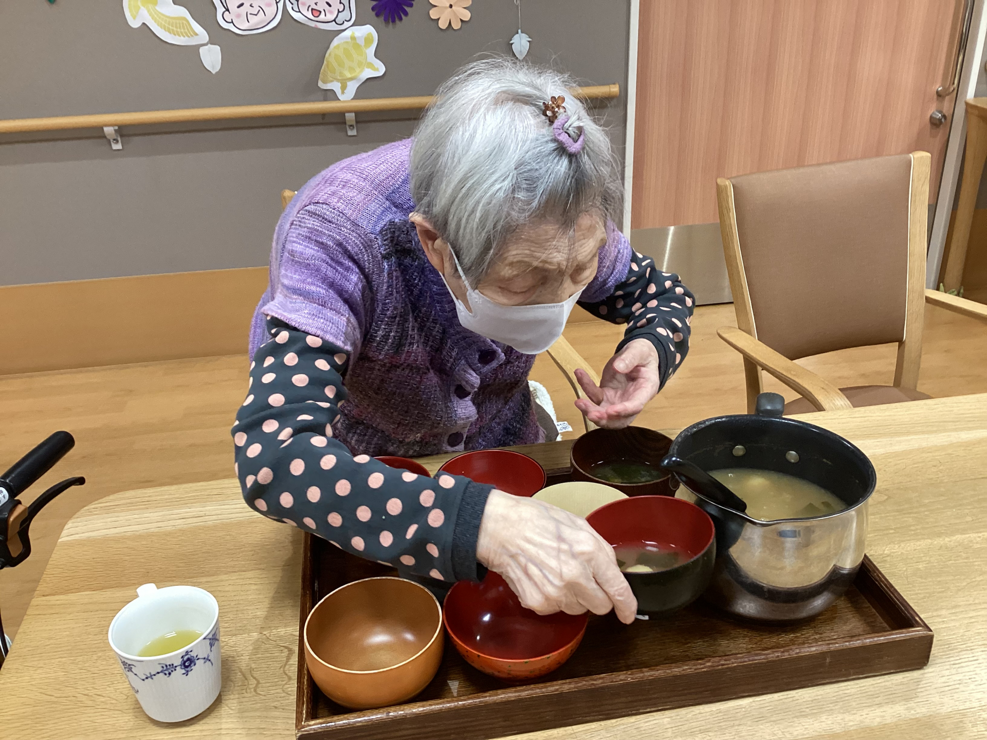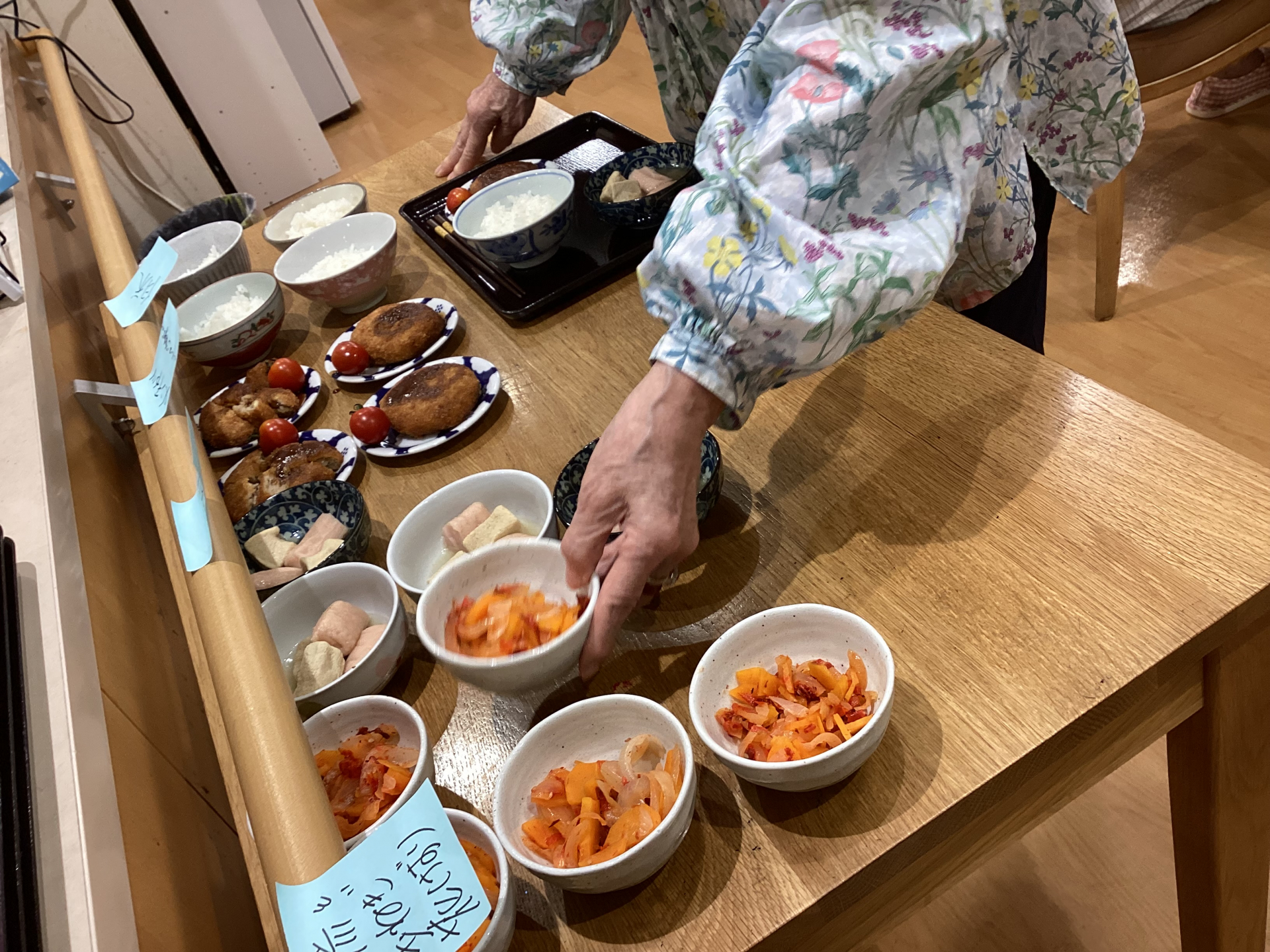 今昼は、ランチ盛り付けで自由に取れるセルフサービスでもちょっとしたマナーを守ることと一緒に準備することで高齢の皆様が気持ち良く食事を楽しめます。