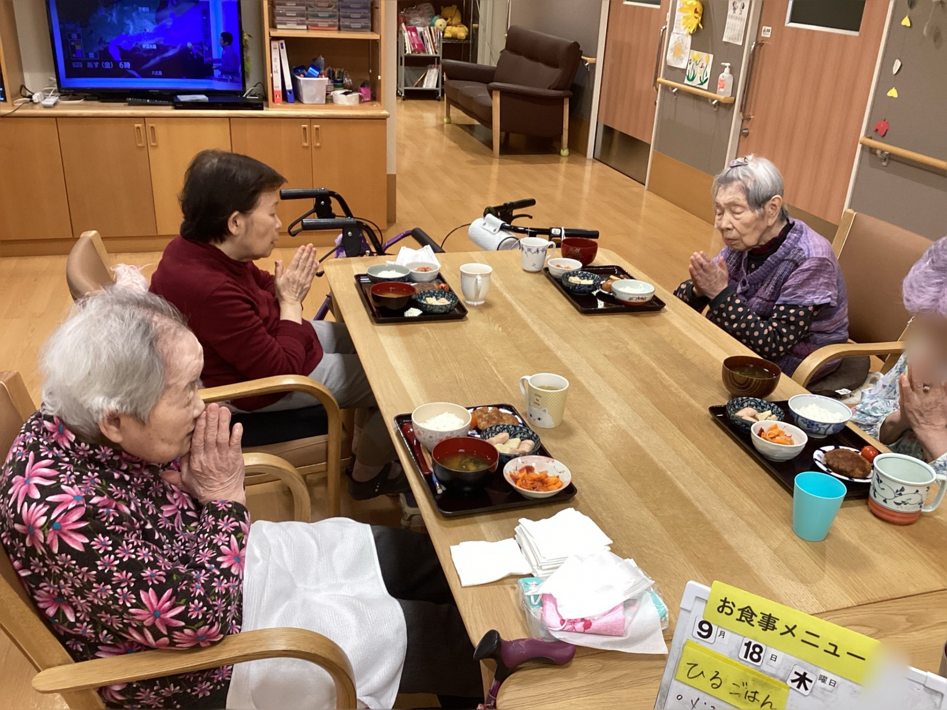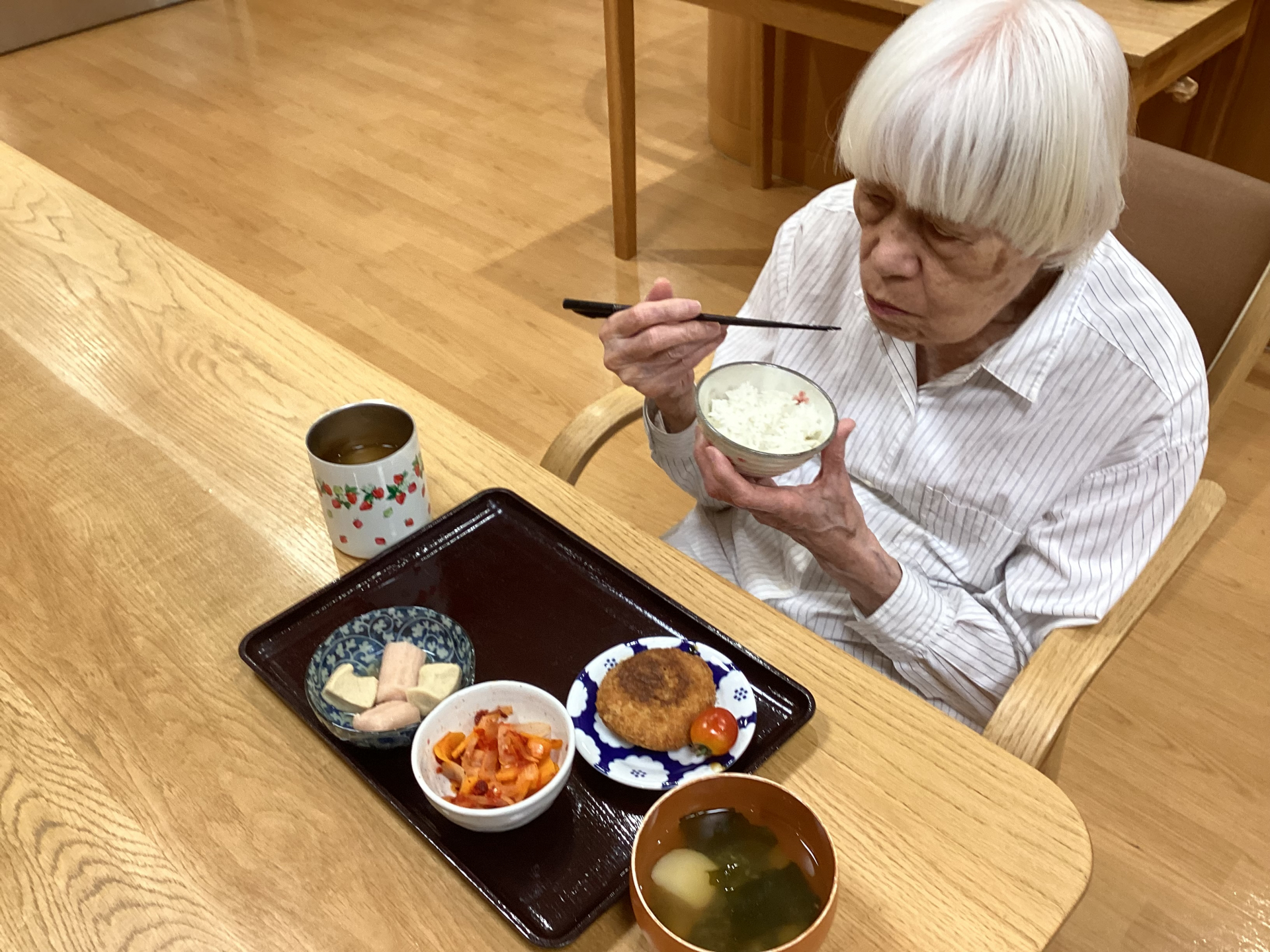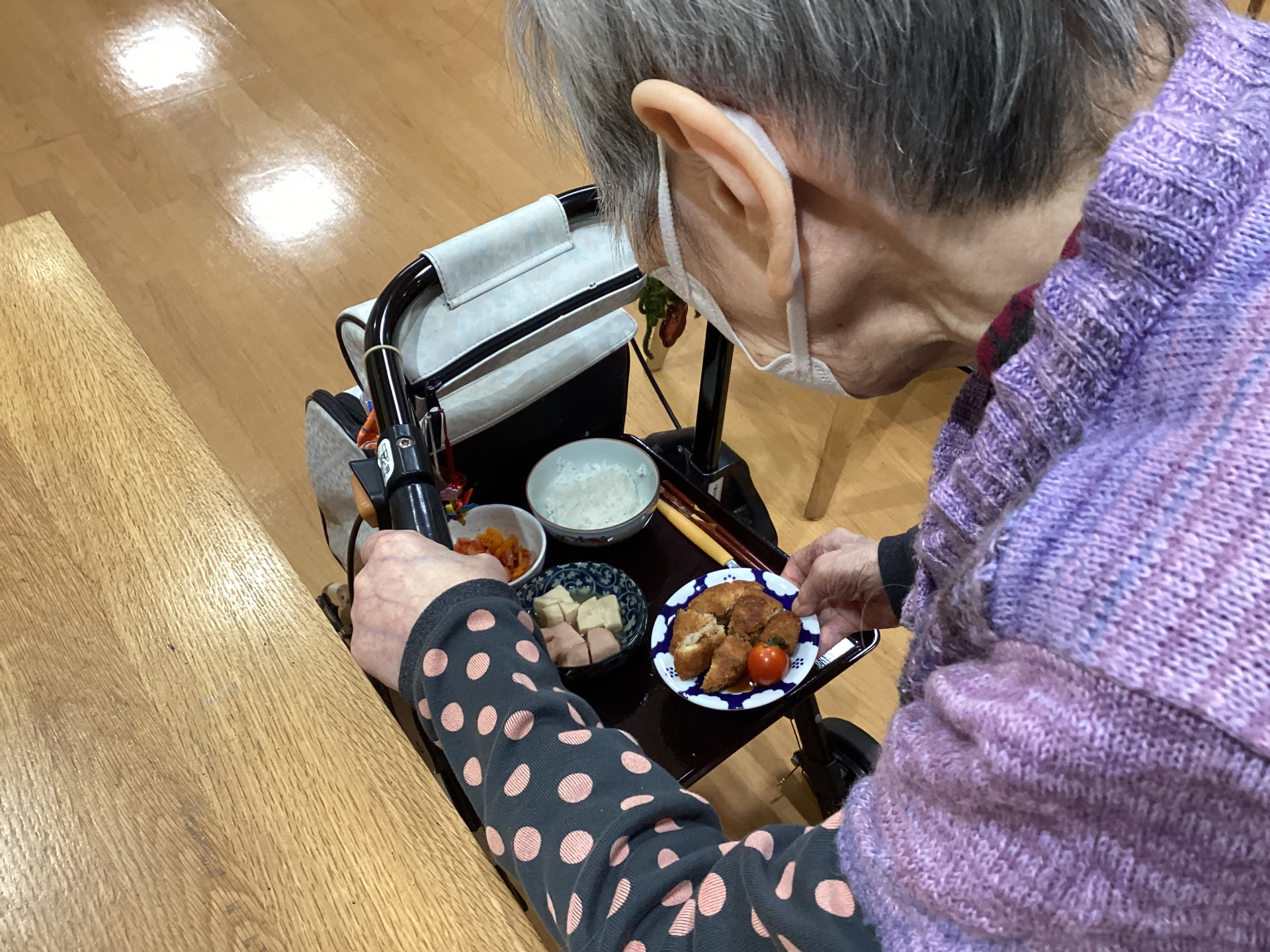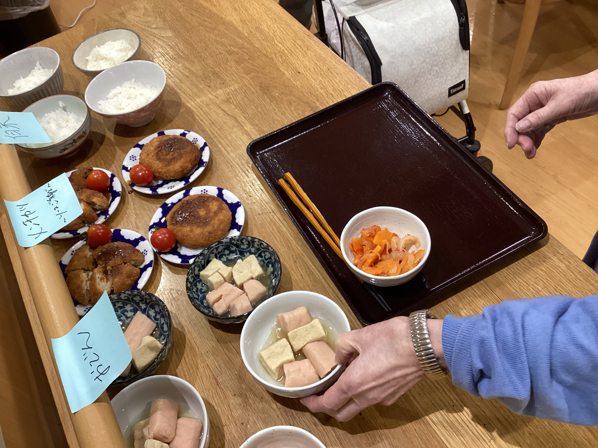 セルフサービス形式にすることで、食事中の会話も自然と増えます。他の入居者様と食事を通じた交流ができました。「これ、美味しいそうだね」美味しく召し上がりました。「おいしさは、見た目から始まる。目で味わう昼ごはん」