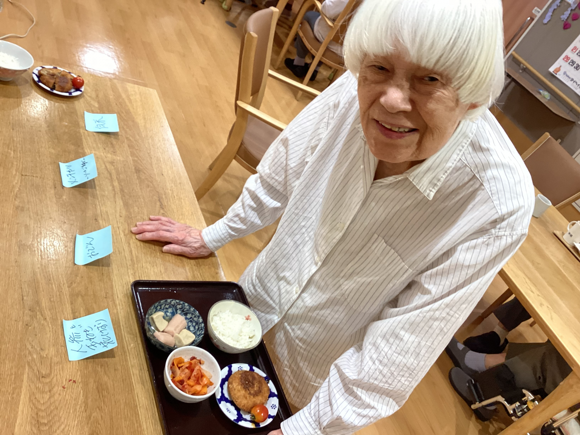 セルフサービス形式にすることで、食事中の会話も自然と増えます。他の入居者様と食事を通じた交流ができました。「これ、美味しいそうだね」美味しく召し上がりました。「おいしさは、見た目から始まる。目で味わう昼ごはん」