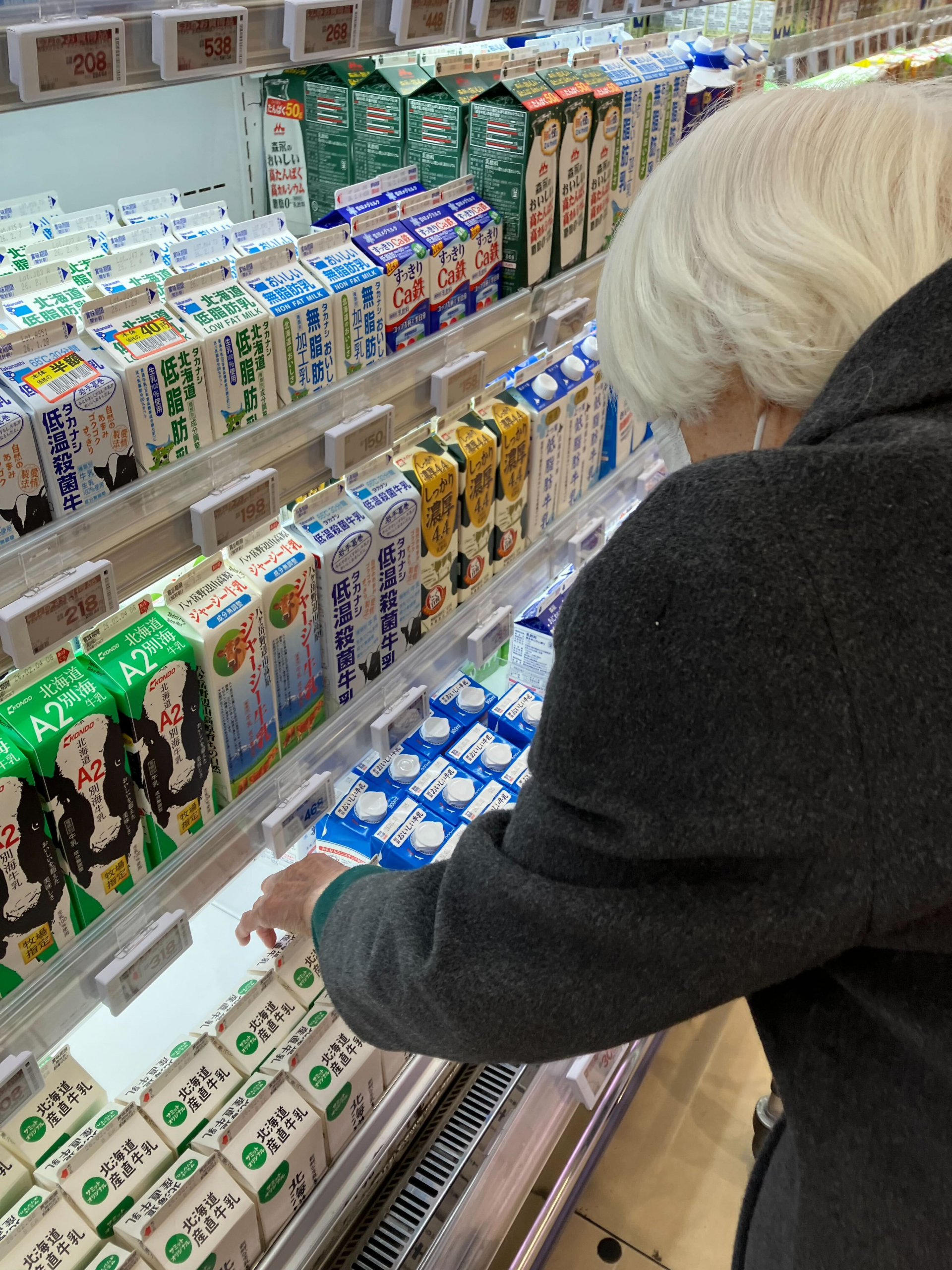 新鮮な牛乳やジュース、食事に使う食材を選びながら、