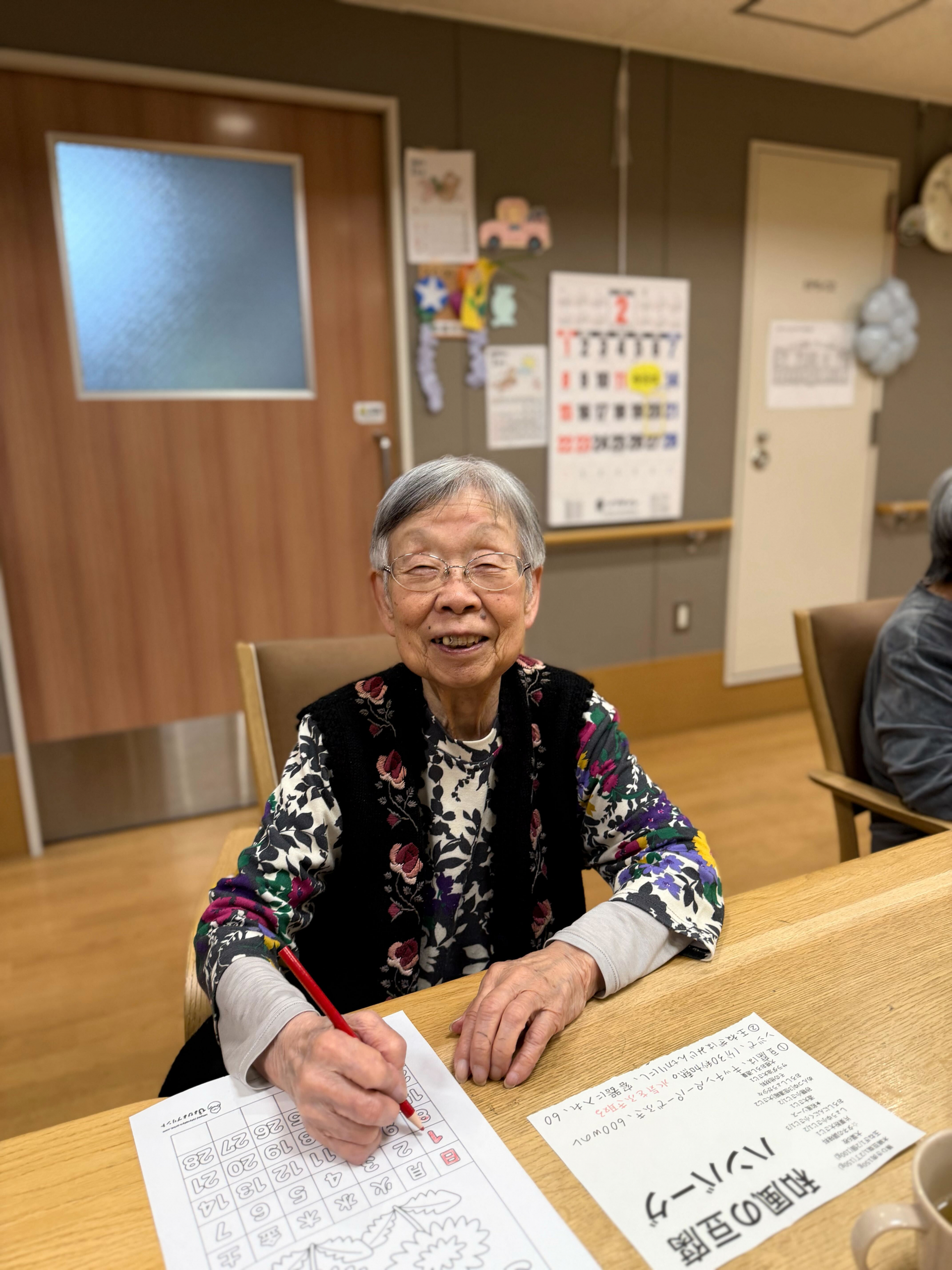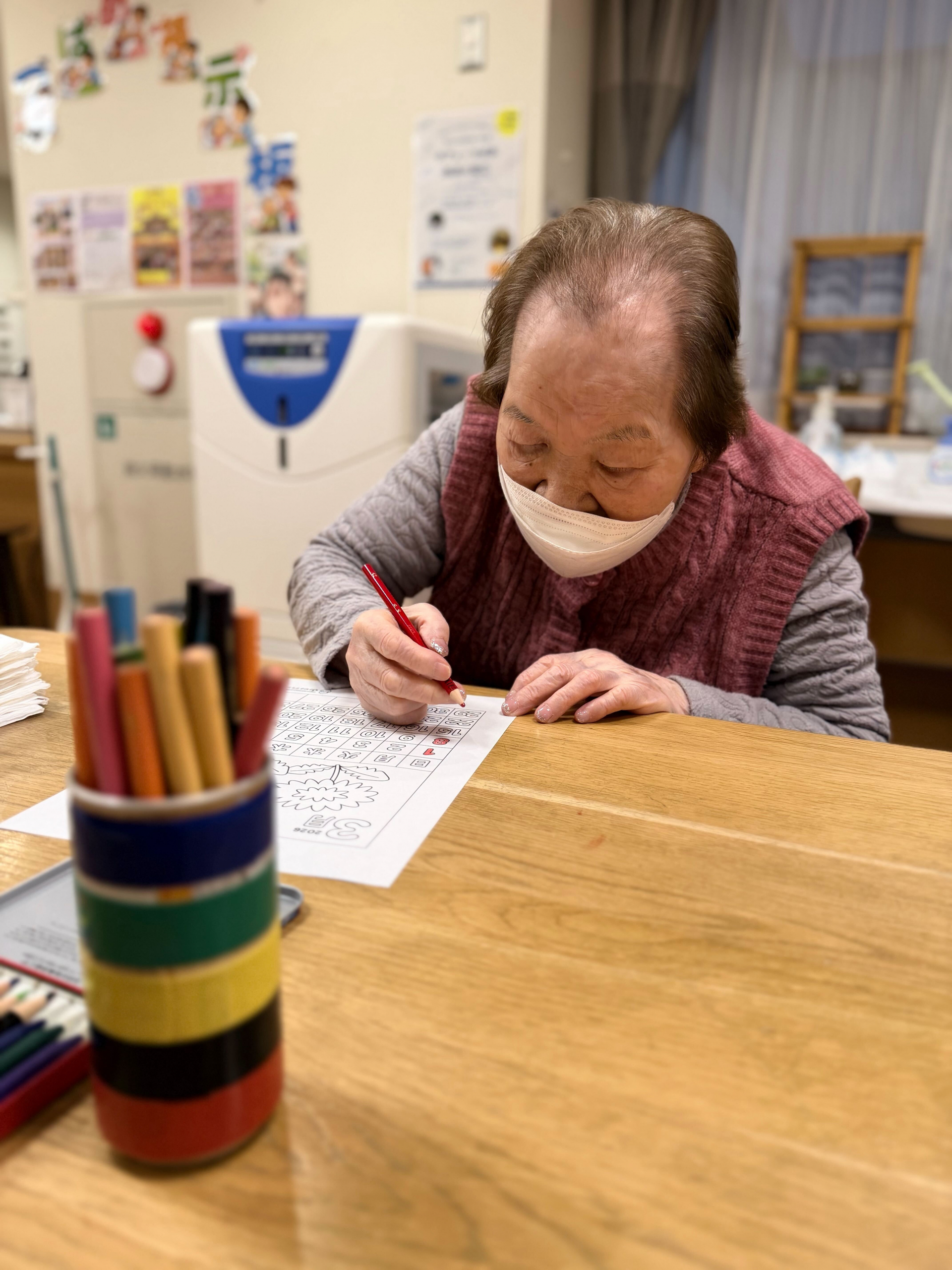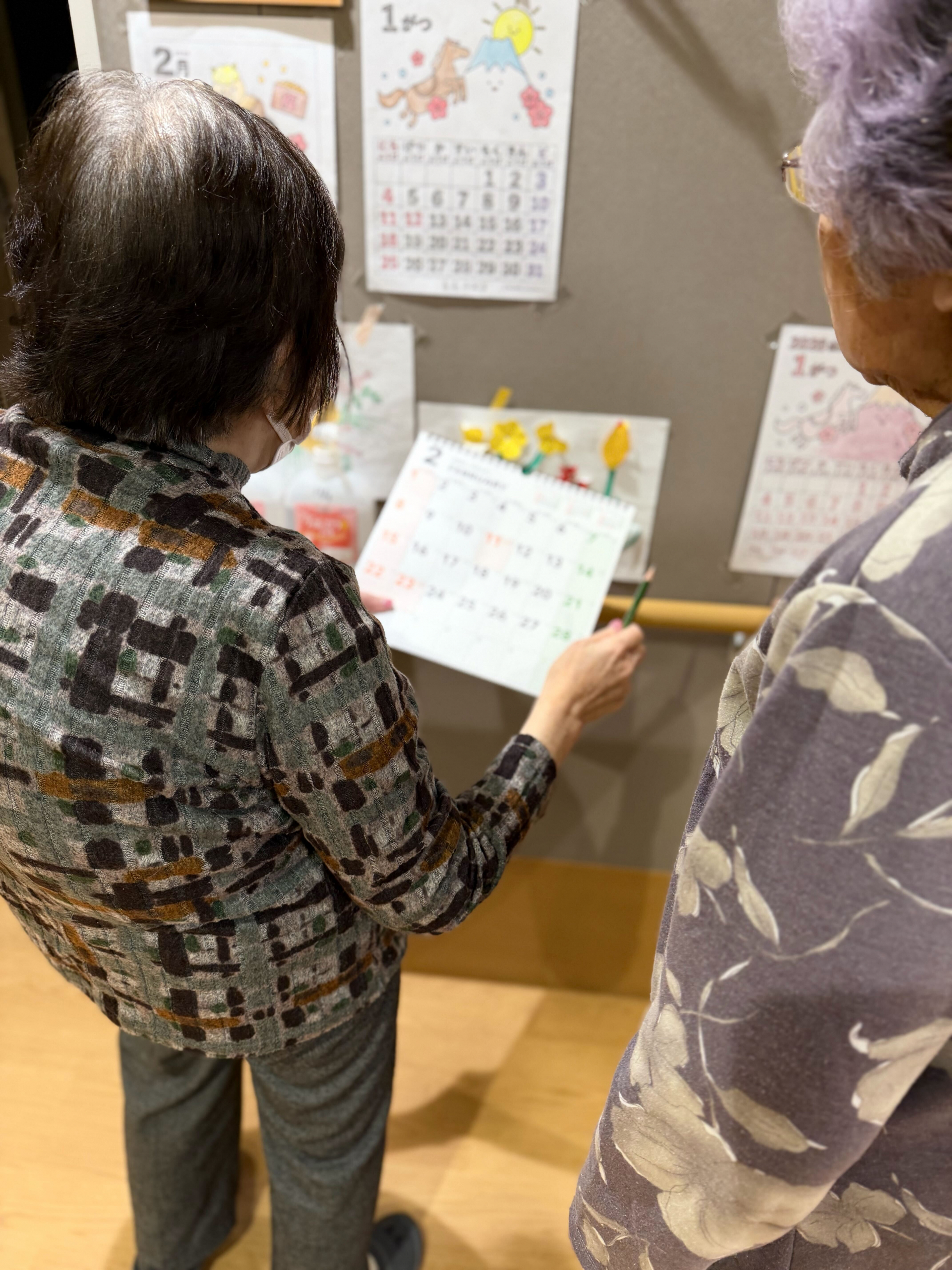 今月のレクリエーションでは、3月のカレンダーのぬり絵を行いました。いくつかのイラストの中から、お好きなデザインを選んでいただいたところ、今月は「お花」と「おひな祭り」のテーマが大人気でした。3月3日はおひな祭りということもあり、季節を感じられる素敵な選択ですね。