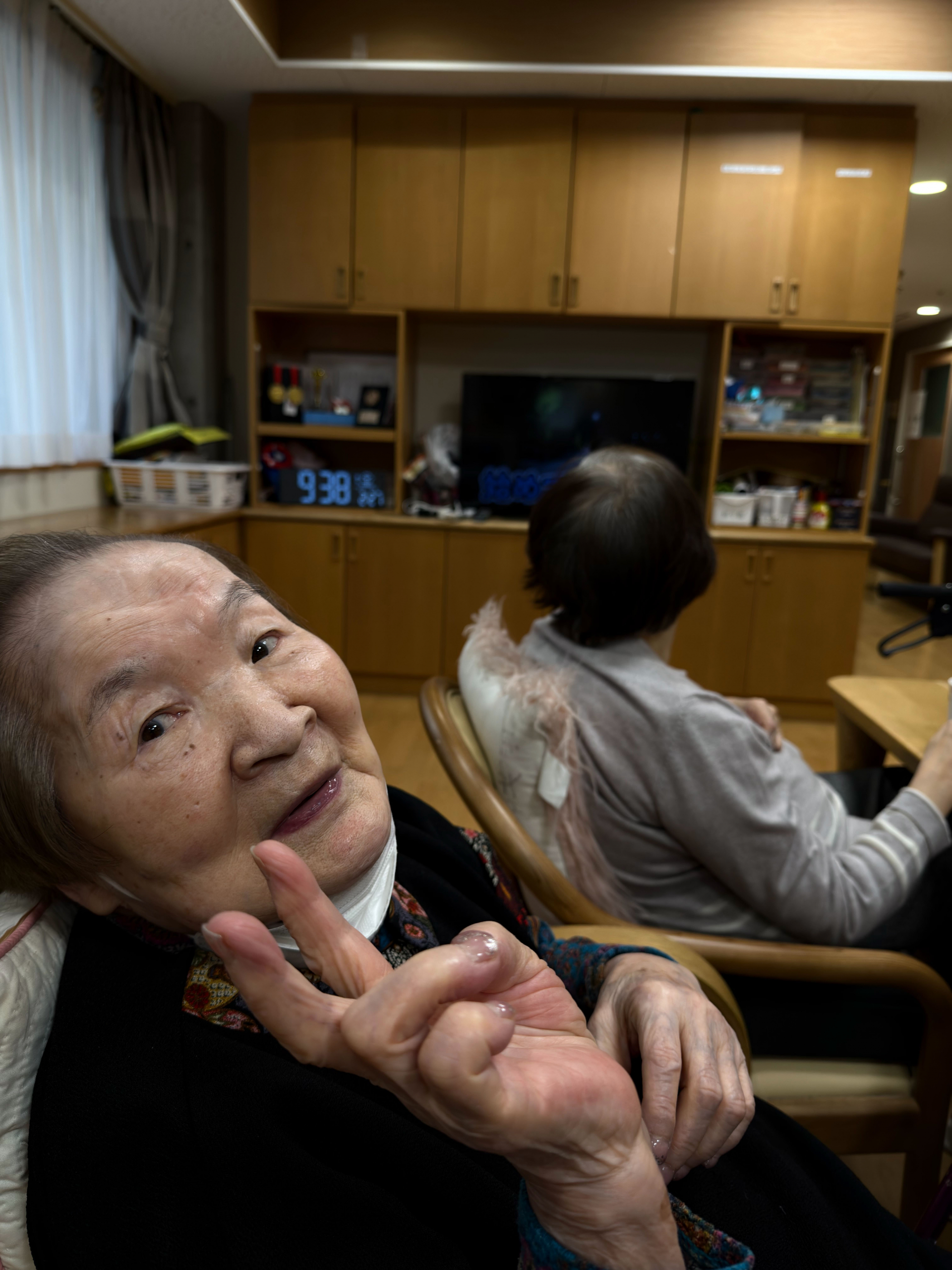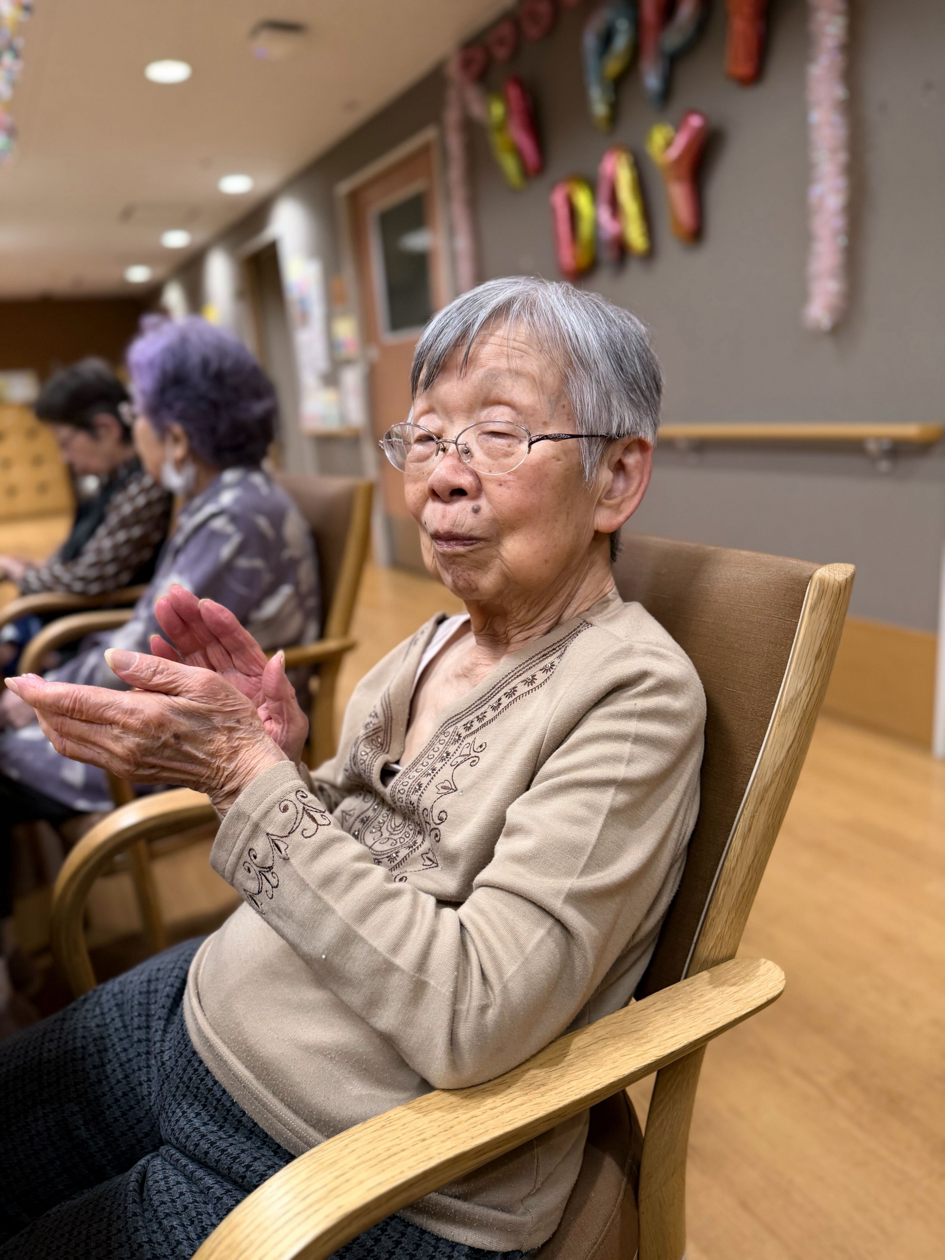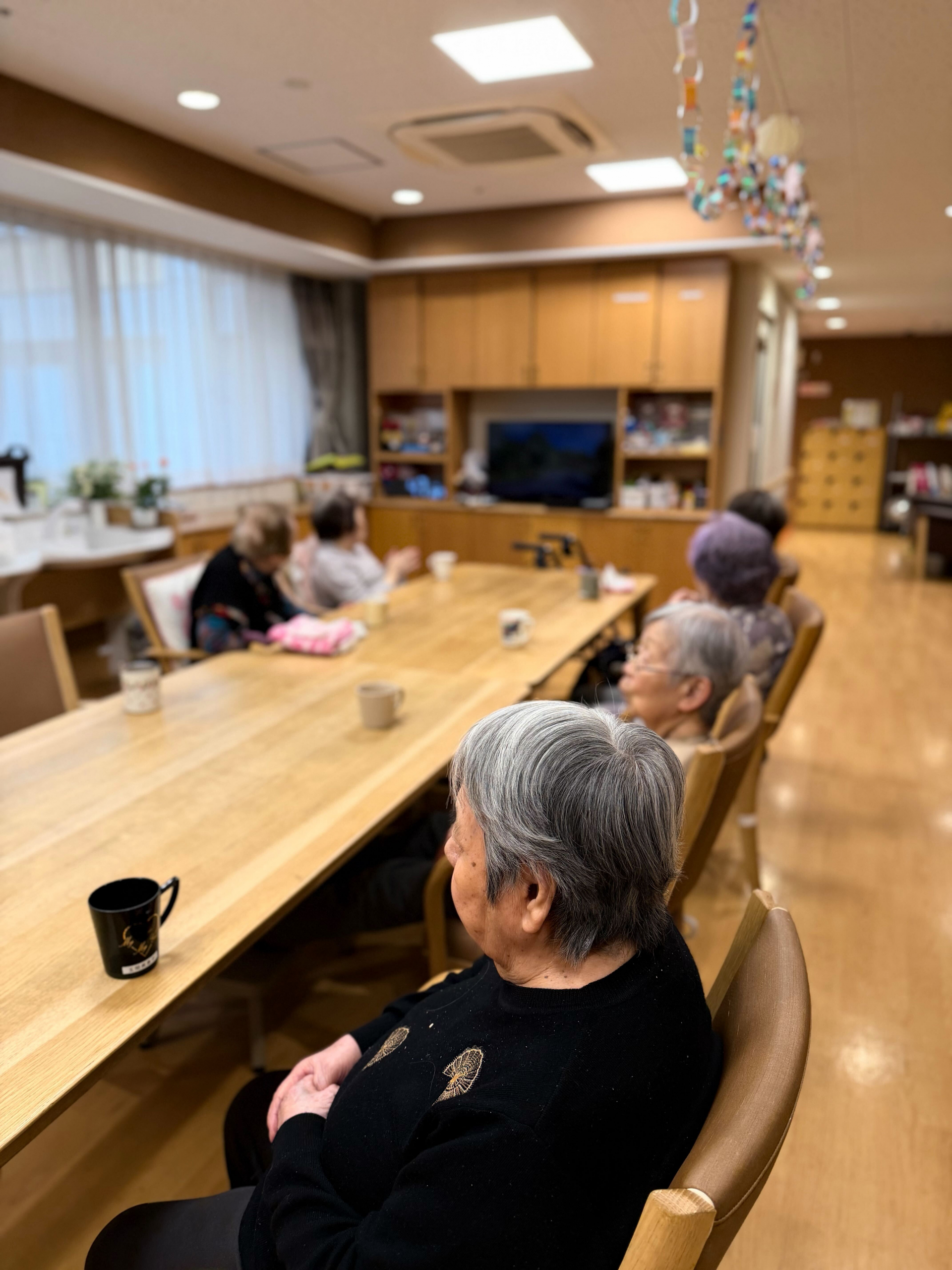 朝の水分補給の時間(すいぶんタイム)、温かいお茶を片手に、ミニカラオケ大会がスタート。歌詞を覚えている人も、うろ覚えの人も、関係ありません。音楽に合わせて声を重ね、笑い合いながら、心がひとつになっていきました。