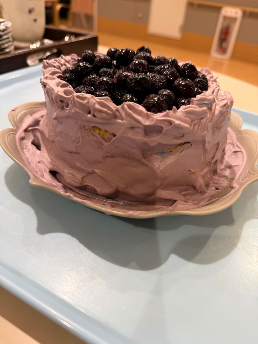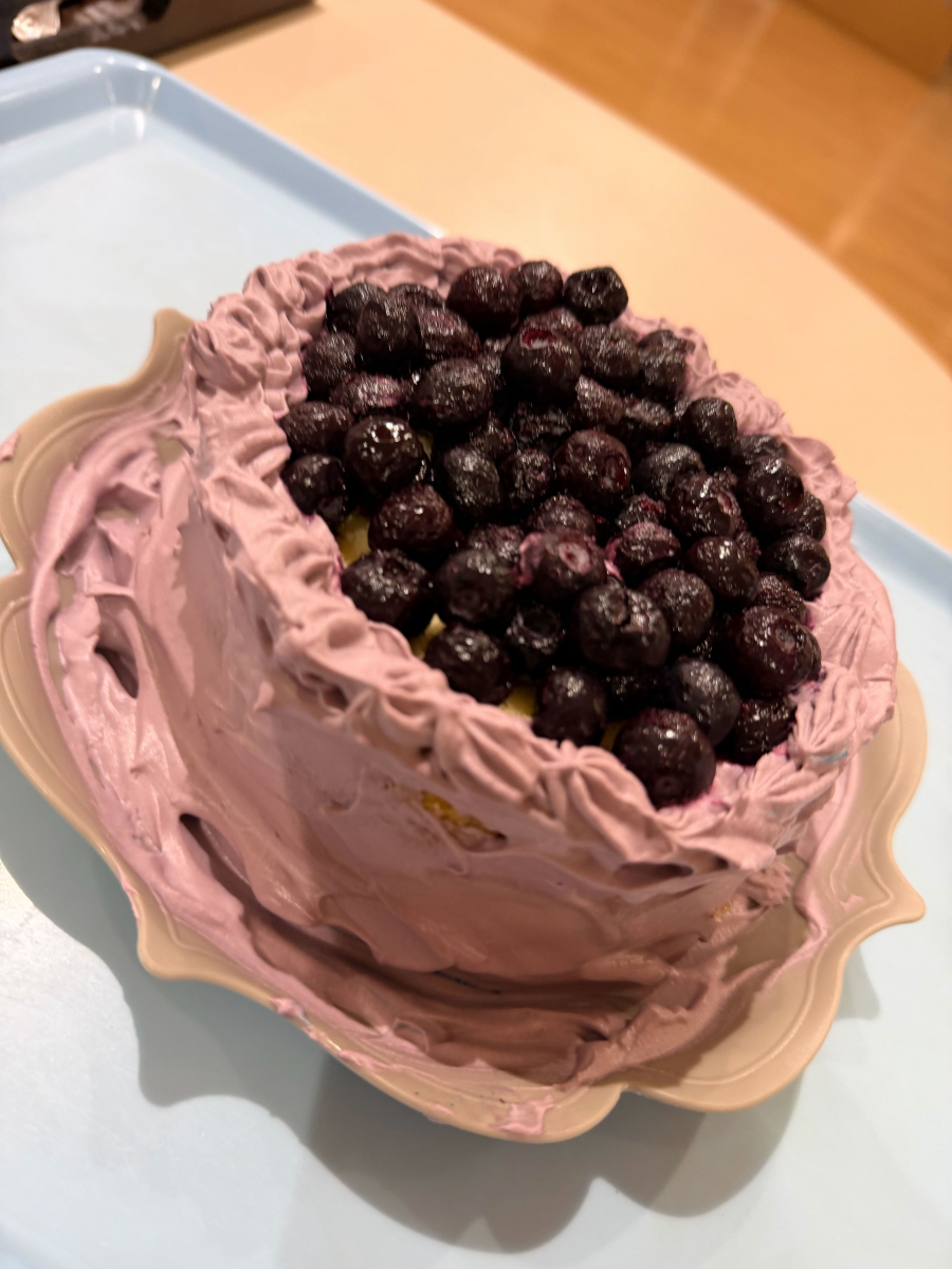 今日のケーキは、ふんわりやわらかいスポンジ生地に、甘酸っぱいブルーベリーを合わせた一品です。